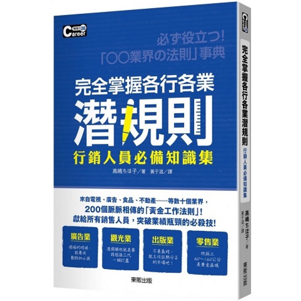 第1章「無論如何我要看到數字」的有效業界法則 煩惱的時候,就找動物和小孩……廣告業 熱門商品要適量……食品業 黃金矩形是不敗款式……製造業 橘色能刺激食慾……食品業 無法作摘要的劇本不會賣座……電影業 待客之道就是感動顧客的心…..娛樂業 第一把交椅有三席……演藝界 百萬單曲與櫻花一起盛開......音樂界 「東大」是觸動讀者內心的關鍵字......出版業 按下LIFESTYLE的開關……洗潔劑製造商 會熱賣的商品不會由多數人決定……飲料業 人生的3D就是商機……繪畫經銷商 透視整個企畫的核心……電視圈 不景氣時,鐵路書籍也很好賣……出版業 被泳裝與啤酒選出來的藝人,是明日之星……演藝界 人氣商品靠配件賺錢……零售業 被踢皮球的作品,也有賣座的潛力……出版業 渡假勝地就是要將祖孫三代一網打盡……觀光業 第2章「想立刻提升銷售量」的有效業界法則 店內擁擠時,就換快節奏的背景音樂吧……餐飲業 日本人難以抵抗的「最後一個」……空服員 跟載客中的計程車走反方向,吉兆……計程車業 書包要從夏天開賣……書包製造商 1月和5月就讓客人喝到飽吧……居酒屋 小孩子會跟父母一起帶來福氣……零售業 以「我自己也在用喔!」來取得顧客信賴吧……門市店員 地板上60~160公分是黃金區域......零售業 電訪要在星期一早上進攻.....電話行銷業 打招呼時要稱呼對方......服務業 打折要從「第二件」商品開始......超級市場 要賣房子,先說服老婆......不動產業 店門口要做得窄,店內部要做得寬......藥妝店 福袋要分等級來賣......百貨公司 收銀台邊順手想買的小誘惑......零售業 銷售量下降的話,就漲價吧......尿布製造商 積極搭訕的超市才賣得嚇嚇叫......流通業 沒有宣傳費,就用排隊吸引顧客吧......餐飲業 用集點卡來幫商品大搬家......便利商店業 與其在網路上PO文,不如PO在店門口......餐飲業 發薪日前打折日用品,發薪日後打折嗜好品......零售業 客人與利潤會跟在免費之後……電信業 鎖定初一、十五逆向操作吧…..證券業 賣保險靠GNP……保險業 用贈品抓住小朋友的心……餐飲界 第3章「效果不如預期」的有效業界法則 骯髒的工廠做不出名品……製造業 售後服務會招來大客戶……保險業 找個只有自己知道的幸運地點……計程車業 哭別會拉低商品價值……家電量販店 別對客人說洩氣的話……汽車業 演習視同作戰;作戰視同演習……足球業 光靠食材,可不會變成法國料理……廚師 想放棄的時候,正是決勝關鍵……代理店經營 聽話的業務員有前途......汽車銷售 公司的成就看廁所就知道.…..經營顧問 架子上擺的商品要紅綠相間……流通業 遇到十字路口就右轉……計程車業 被養樂多小姐問「這是什麼?」的電影會大紅……電影業 只要老闆丟掉堅持,你的店就會紅……空間設計業 網購的販賣時段要領先實體店面……網路購物業 不看電視的採購員不合格……零售業 把鍋內殘留的醬汁舔掉……廚師 一流證券業務員都很早起……證券業 醫藥代表是敵人也是夥伴.....製藥業 機上銷售要第三次才成功......空服員 被專家認可的專家,才是專家......出版業 休息也是工作的一環......園藝技工 有錢人不會從窮人那裡買東西......寶石商 想要第一,先成為唯一......飲料業 第4章「工作上不想失敗」的有效業界法則 即使工作遇到瓶頸,也別增加成員……軟體工程業 超商的關東煮會在秋天大賣……便利商店業 想開店,離競爭店家近一點最好……居酒屋 商品的顏色不超過三種……商業設計師 紅酒與原稿,都是越陳越香……出版業 一到二月是餐飲店開幕的最佳時機……餐飲業 想要順利就抱佛腳吧……軟體業 名品要靠模仿來學習......設計師 別在e-mail裡抱怨他人......網路業 綠色和紫色的玩具不受歡迎……玩具製造商 把同系列店開在同一個區域吧……居酒屋 兩個小時的電視劇,過了10點就上辣戲吧……電視圈 牝馬在夏天威力驚人……賽馬業 工作程序要精簡……軟體工程業 面對投訴需要的不是贊同,而是同理心……客服單位 老闆睡過頭會搞垮公司.…..經營顧問 用回聲式打招呼阻止順手牽羊……零售業 越急的工作,越要拜託很忙的人……出版業 從其他業界的錯誤裡學習教訓......飛行員 想稱霸全國,先占領北海道......食品業 傷口和便當要自己帶著......高處作業員 女性雜誌一推出理財特輯,行情就會下跌……證券業 經營不善時,工作會議就會增加……經營顧問 找錯漏字不僅要縱著看,也要橫著看……校對者 校長兼撞鐘的作法不會有好上司……人力資源業 故事要分三部,作出高潮……電影業 丟東西、睡過頭、放鴿子…….旅行業 看似無意義的陳述,也有其意義存在……律師 點綴一下你的料理吧……廚師 公布工作紀錄吧……航空業 用神秘顧客來揭發真相……餐飲業 第5章「不管怎麼樣都想不出點子」的有效業界法則 點子的好發地,在馬上、枕上、廁上……商品企劃 想法要積極,結論要消極……廣告業 背叛觀眾的節目會紅......電視圈 企劃要專攻讀者的弱點......出版業 印表機就用墨水來賺錢吧……印表機業 失敗是發明之母……製造業 想要的車,就會很常在街上看到......節目編劇 酸酸甜甜的食物誰都愛.…..調酒師 故事由觀眾來決定......電影業 限定時段的商品有暢銷的潛力......製造業 免運是刺中買家的關鍵字......網路購物