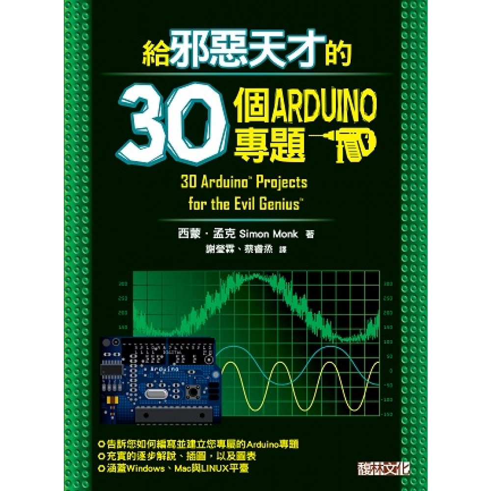 這本不懷好意的發明指南將告訴您如何以Arduino微控制器開發系統來編寫及建立各種專題。涵蓋了Windows、Mac以及LINUX平臺,本書藉由簡化過的C語言程式設計來加快您的學習速度--而您不需要先擁有任何程式設計基礎。 Arduino開發板提供給邪惡天才一套價格低廉、容易上手的技術來開發他們的邪惡專題。因此現在一系列的新專題可藉由這套技術來開發,並且可由電腦控制這些專題。而當一組由電腦來驅動伺服機控制雷射的專題完成後,全世界將掌握於邪惡天才的手中! 這本書將為您介紹邪惡天才如何將Arduino開發板連上電腦,並撰寫控制原始碼,再接上各式各樣的電子元件來製作專題。包含先前所提到由電腦來驅動伺服機控制雷射、透過USB來控制電扇或者製作溫度記錄器、光豎琴與聲波示波器,當然我們能做的不只這些。 書中將提供每個專題的詳細示意圖與製作流程,並且不需要用到烙鐵或其他特殊工具。然而,邪惡天才當然希望可以將這些插在麵包板上的專題,更加精進成可永久保有的類型,而這些書中也有詳細的介紹。