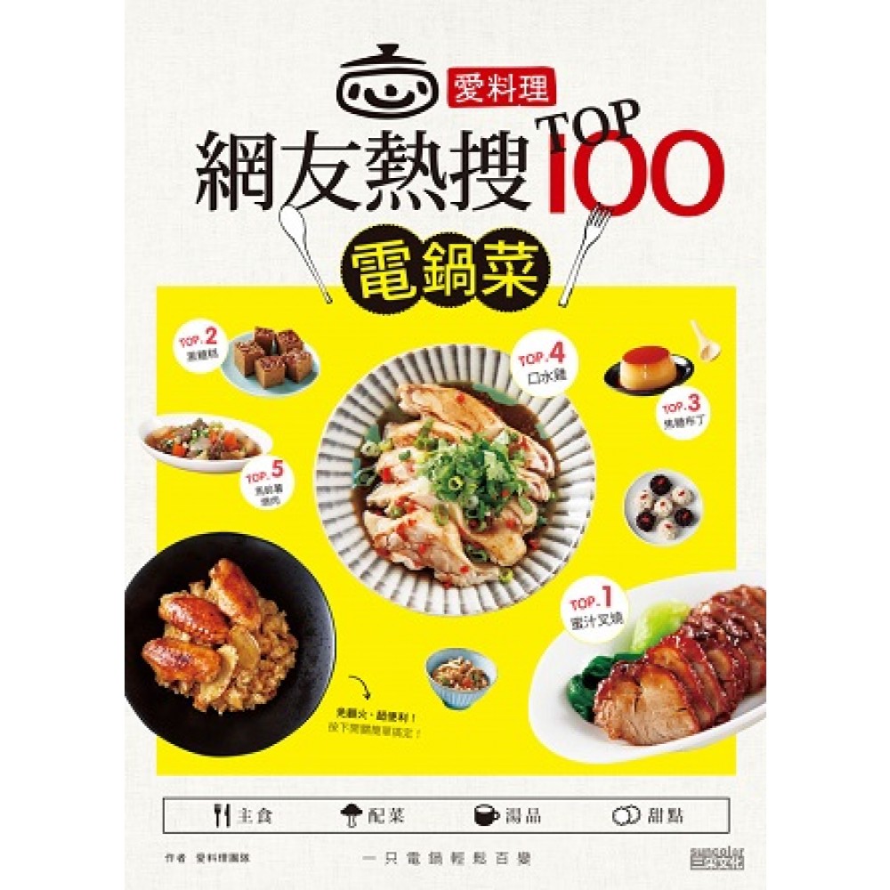 <前言> 愛料理出書囉! 台灣人最愛的萬用鍋具 <廚房教室①>電鍋配件,料理好幫手! <廚房教室②>好吃白米飯,這樣煮! <廚房教室③>電鍋的多種料理功能 <廚房教室④>讓電鍋光亮如新的小祕方 TOP01 燒臘店必點的人氣招牌〜蜜汁叉燒 TOP02 伴手名產在家做〜黑糖糕 TOP03 療癒甜點免烤箱〜焦糖布丁 TOP04 還沒吃就先流口水〜口水雞 TOP05 溫暖的家常日本料理代表〜馬鈴薯燉肉 TOP06 初學者也能輕鬆上手〜茶香溏心蛋 TOP07 超級美味的配飯聖品〜鹹蛋蒸肉 TOP08 米飯吸附滿滿精華〜野菇雞肉炊飯 TOP09 鮮嫩多汁吮指好味〜蒜頭雞 TOP10 讓人想連吃三碗的家鄉味〜滷肉飯 TOP11 香氣逼人的滋補主食〜麻油雞糯米飯 TOP12 酸中帶甜的東歐家庭味〜羅宋湯 TOP13 回憶傳統的好味道〜古早味油飯 TOP14 樸實天然真滋味〜黑糖全麥饅頭 TOP15 值得傳承的好味道〜筒仔米糕 TOP16 在家做小館名菜〜紹興油雞 TOP17 清爽的蔬食好味〜香菇高麗菜飯 TOP18 逢年過節必吃糕點〜紅豆年糕 TOP19 超簡易的快速早餐〜紅蘿蔔絲蛋餅 TOP20 軟嫩蔥香的涮嘴口感〜蔥油雞 TOP21 滑嫩鮮甜的完美結合〜豆腐心鮮蝦蒸蛋 TOP22 香醇可口活力一整天〜原味無糖豆漿 TOP23 搭配冰淇淋也好吃〜巧克力蛋糕 TOP24 清涼的消暑聖品〜綠豆薏仁湯 TOP25 冷熱皆宜的暖心甜品〜紅豆湯 TOP26 顏色繽紛賣相佳〜西班牙海鮮飯 TOP27 午後的簡單小確幸〜水蒸蜂蜜蛋糕 TOP28 色彩繽紛玩創意〜南瓜蔬菜粥 TOP29 總鋪師的工夫菜〜紅燒蹄膀 TOP30 暖身溫補湯〜四神湯 TOP31 清香鮮美的甘甜湯頭〜綠竹筍雞湯 TOP32 絲瓜與蛋的浪漫邂逅〜絲瓜蒸蛋盅 TOP33 肉甜味美醬汁超下飯〜醬燒牛腱 TOP34 方便省事完成一鍋湯〜蒜頭蛤蜊烏骨雞湯 TOP35 潤肺去燥的保養良帖〜冰糖燉雪梨 TOP36 輕盈享瘦的最佳夥伴〜原味無糖優格 TOP37 多層次口感交織〜三色蛋 TOP38 入口即化的電鍋甜點〜蜜芋頭 TOP39 和風懷舊小點~紅豆栗子羊羹 TOP40 歷久不衰的宴客料理〜東坡肉 TOP41 十分鐘快速完成〜蒜蓉紫茄 TOP42 內餡滿滿富嚼勁〜蛋黃中卷 TOP43 精巧的創意小點〜清蒸絲瓜湯包 TOP44 清透高纖的降火湯品〜蓮藕排骨湯 TOP45 料多濃郁隔夜也好吃〜牛腩咖哩飯 TOP46 有面子的宴客料理〜頂上鮮 TOP47 大小朋友搶著吃〜紫米八寶粥 TOP48 綿密鬆香的傳統味〜芋頭糕 TOP49 連湯汁都要搶來拌飯〜豉汁排骨 TOP50 熱吃冷食皆宜的甜點〜麵包布丁 TOP51 酸甜滋味好解膩〜水果醋醃番茄 TOP52 補氣養益冬補湯〜十全燉豬心 TOP53 嚼勁軟Q醬味足〜三杯滷大腸 TOP54 保健養肝的好幫手〜自製蜆精 TOP55 低脂糕點免烤箱〜無油水蒸蛋糕 TOP56 寒冬一碗暖粥品〜糙米排骨粥 TOP57 微辣中帶出雞湯鮮甜〜剝皮辣椒香菇雞湯 TOP58 酸甜清涼夏日風情〜果香義大利冷麵 TOP59 簡單清爽無油煙料理〜豆腐蔥花蝦 TOP60 冷食熱食都美味〜紫米百合蜜糕 TOP61 一掃而空的家常菜〜鮮茄豆腐鑲肉 TOP62 經典客家湯品〜酸菜肚片湯 TOP63 清新不油膩的涼補〜肉骨茶 TOP64 簡單方便臘味煲飯〜香腸蔬菜炊飯 TOP65 樸實簡單的古早風味〜香菇雞絲鮮筍粥 TOP66 養顏美容女生最愛〜銀耳蓮子湯 TOP67 溫潤爽口的秋日佳餚〜栗子香菇雞湯 TOP68 去寒暖身舒緩不適〜黑糖薑汁地瓜湯 TOP69 濃郁化不開的迷人口感〜乳酪蛋糕 TOP70 旅遊易攜的天然點心〜水煮玉米 TOP71 清澈的鮮嫩甘甜〜蘿蔔牛肉湯 TOP72 年節應景的人氣點心〜蘿蔔糕 TOP73 營養豐富的精煉純粹〜滴雞精 TOP74 秋季限定美味〜栗子發糕 TOP75 山珍海味集一家〜清蒸時蔬中卷 TOP76 清熱解暑助消化〜牛蒡排骨湯 TOP77 口味直逼名店〜海南雞飯 TOP78 袖珍版山海雙美味〜蛤蜊迷你獅子頭 TOP79 千里飄香好下飯〜香滷肥腸油豆腐 TOP80 增進食慾的下飯菜〜韭菜炒豬腸 TOP81 鮮嫩肥美的義式情懷〜奶油蒜香淡菜 TOP82 清新酸辣南洋風〜叻沙南瓜雞 TOP83 鮮美海味端上桌〜豉汁芋頭草魚 TOP84 鮮嫩的完美融合〜雙蝦嫩蛋 TOP85 膠質豐厚超涮嘴〜花生栗子燉鳳爪 TOP86 不用瓦斯爐也能煎〜泡菜鍋貼 TOP87 喜宴甜點在家做〜三寶甜米糕 TOP88 味甘開胃好滋味〜樹子蒸魚 TOP89 夏日冰鎮的開胃菜〜鮮蝦嫩筍沙拉 TOP90 吮指不停的微辣入味〜剝皮辣椒蒸雞翅 TOP91 館子必點的人氣美味〜蒜泥白肉 TOP92 精緻的宮廷小點〜黑糖桂花栗心棗 TOP93 養顏美容氣色好〜百合紅棗湯 TOP94 小朋友最愛的米點心〜黑白珍珠丸 TOP95 清蒸鎖住鮮滋味〜竹香蒸圓鱈 TOP96 養精蓄銳好提神〜南瓜藥膳排骨 TOP97 回憶舊時家鄉菜〜紹興香腸扣肉 TOP98 香草味四溢襲擊味蕾〜迷迭香干貝香菇雞湯 TOP99 濃郁奶香入口即化〜起司蘑菇 TOP100 清脆爽口新吃法〜肉燥拌銀芽