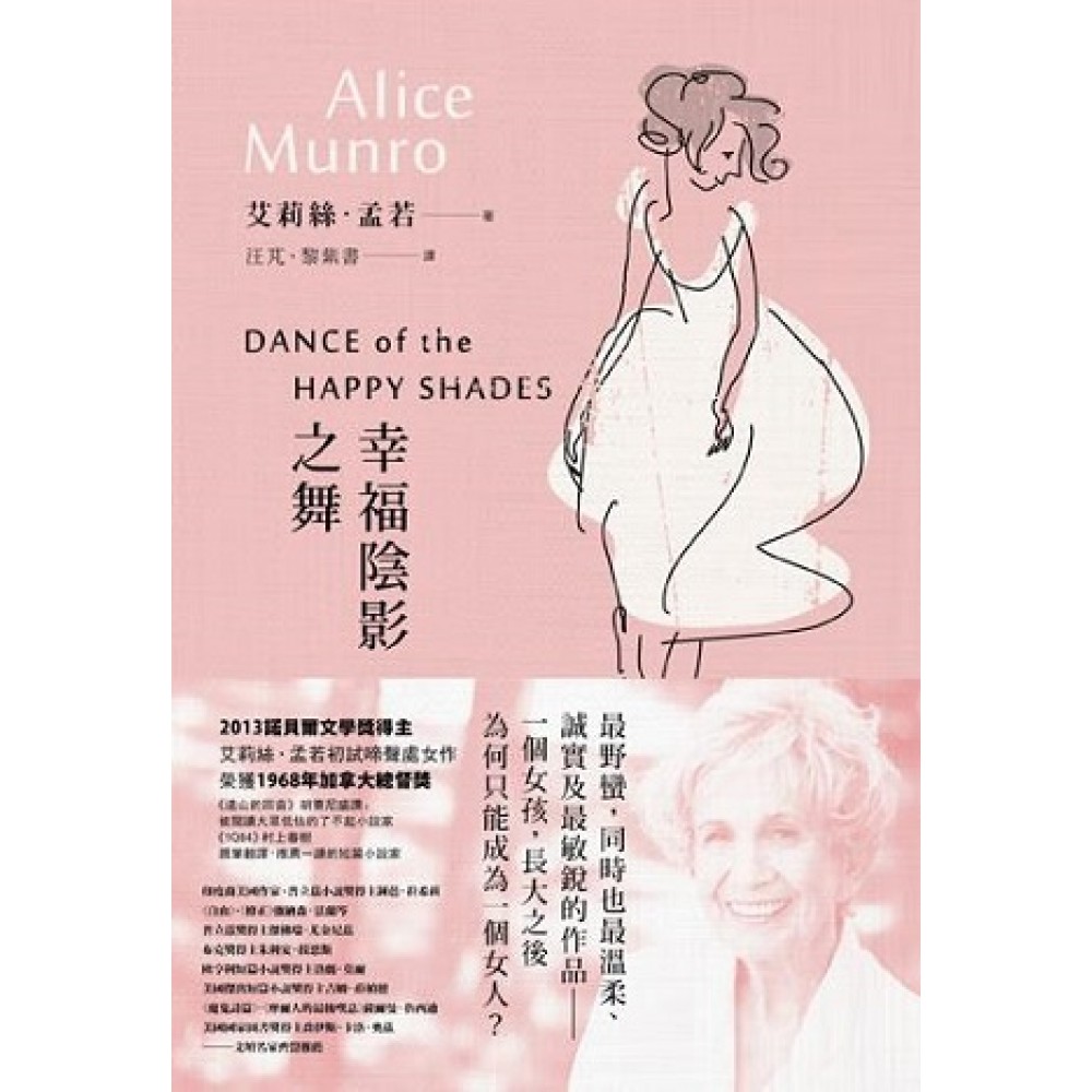 2013諾貝爾文學獎得主 艾莉絲•孟若初試啼聲處女作 榮獲1968年加拿大總督獎 1968年,孟若三十七歲。這一年,加拿大女權運動正值高峰、巴黎的年輕人們高喊著反越戰,作家則發表了她的第一部短篇小說集《幸福陰影之舞》——背景同樣在加拿大南部、純樸的小鎮,當外界陷入騷亂之際,這裡的人們依舊為了尋常的生活在掙扎、苦惱著,想要好好保住自己在商店裡的工作、經營自己的農場,或僅只是把孩子扶養長大——當然,這只是表象,對社會議題的關注就被孟若藏在她的小說裡,比方: 〈辦公室〉:一個女人發現她無法在老公和小孩環繞下發揮創作,於是要求一個屬於她自己的空間;這便在反映當時某些女權的議題。 〈光彩琳琅的房子〉:女主人翁堅持反對她所住的「新」社區對「舊」房屋的勢利驅趕;與書名同名的短篇〈幸福陰影之舞〉:描述了青少年對於學習的困難的「小」態度。 〈男孩子和女孩子〉裡,小女孩是幫忙父親的左右手,自認比她的小弟「還像個男人」;隨著年紀漸長,女孩卻發現家庭與社會對她的期待和觀感,都與她以為的不一樣。 這部處女作為孟若贏得了第一座加拿大總督文學獎。此時,她已是三個女兒的母親。據稱,孟若前後花了15或20年才寫完這部《幸福陰影之舞》。 孟若寫的大部分是女人的故事。在她早期的創作裡,經常著墨於剛進入家庭生活的女孩,為了愛、性、背叛、孩子等苦惱;後期則是在中年危機和瑣碎生活中掙扎的女性——她們都有著慾望或遺憾,有其強大與軟弱之處。《幸福陰影之舞》所收錄的15則短篇小說中,大部分皆由女孩或女人作為主述者,並在生命中某一個重要時刻意識到「性」那強大、混亂的力量,或是性別、兩性關係在她所身處的社會中可以如何複雜——而它們通常以無情地解剖家庭關係的方式呈現。