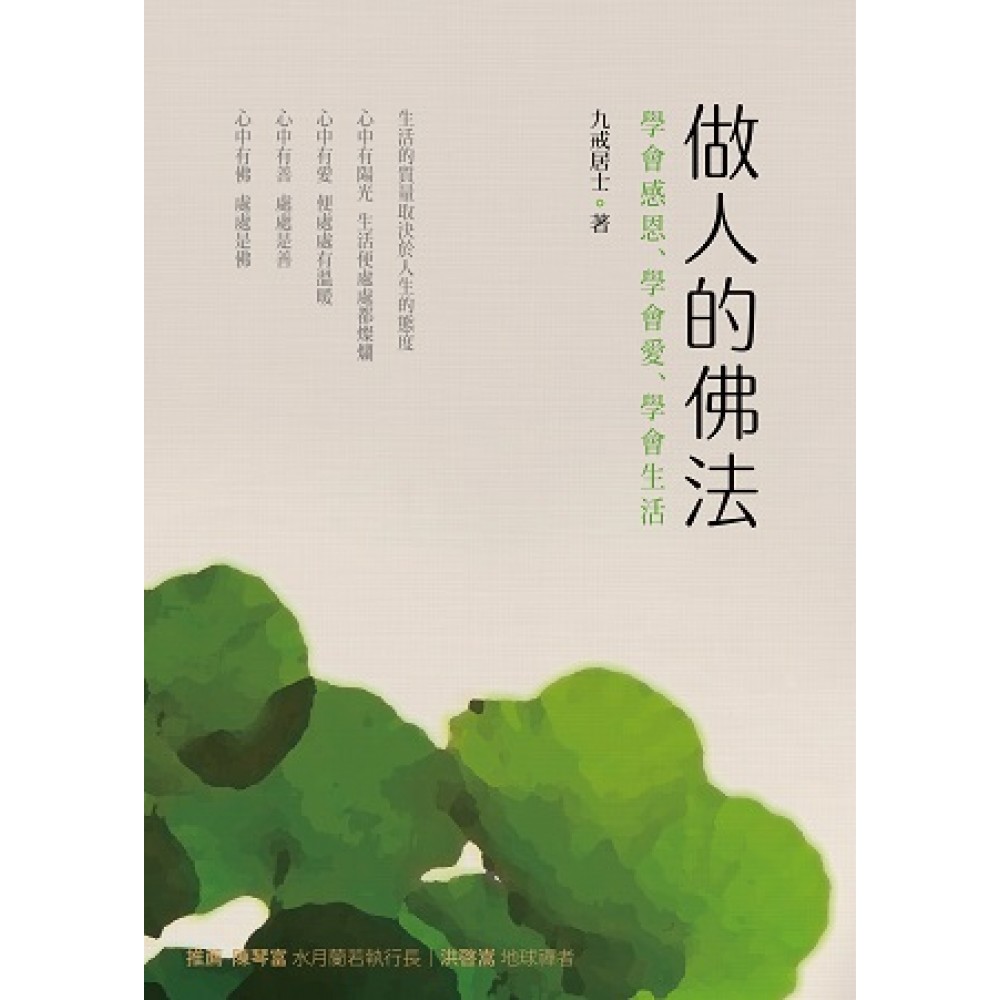 第一章 人生可以很圓滿 活著就要好好活 人生短暫,只爭朝夕 弱水三千,只取一瓢 活出人間好時節 求人不如求己 佛不度人人自度 自己的路自己走 我的人生我做主 活著,就要順其自然 追求多元的人生 不要畫地自限 從夢想照進現實 人生,從設定目標開始 浮生若茶 看山是山,看水是水 • 第二章 讓快樂成爲天性 活著不是爲生氣 隨喜而喜 坦然面對人生的無常 「一生無性」最快活 放下才能得解脫 煩惱都是自找的 快樂無非常知足 何必在意小過 不幸之中有萬幸 懂得付出才能收穫快樂 把握當下的幸福 善意地去解釋一切 第三章 學佛就是學做人 認識自己 善解人意也是慈悲 善待自己,享受人生 保持一顆平常心 學會寬容,收穫一生 忍辱是種大修養 寬容是最好的教育 善緣就是財富 低調做人,處事謙恭 做人只求無愧於心 不見他人過 真心做事,真誠做人 寬恕他人就是善待自己 與人無爭 常常檢點自己 第四章 佛法是種活法 佛法是種活法 生活就是修行 生命只在呼吸間 心中有佛,處處是佛 本來都是緣 莫使心靈蒙塵埃 萬法由心生 人人都是佛 得失寸心知 煩惱是因爲修養不夠 凡事不可太執著 透識真假 淡泊名利 不可說 第五章 善哉,善在 用善心溫暖世道 善心就是顆平常心 善惡存乎一念間 幫助別人也是幫助自己 善待生命 莫以惡小而爲之 佈施不倦,求善不厭 善良成就未來 浪子回頭金不換 放下屠刀立地成佛 舍己渡人,善莫大焉 第六章 持戒度心魔 貪欲就是一切煩惱 不要圖口舌之快 世界上最愚蠢的事情莫過於生氣 衝動是魔鬼 珍惜生命,莫殺生 節儉生活的意義 別讓貪心毀掉一生 以戒爲師 代後記 青年人學佛的四個注意事項