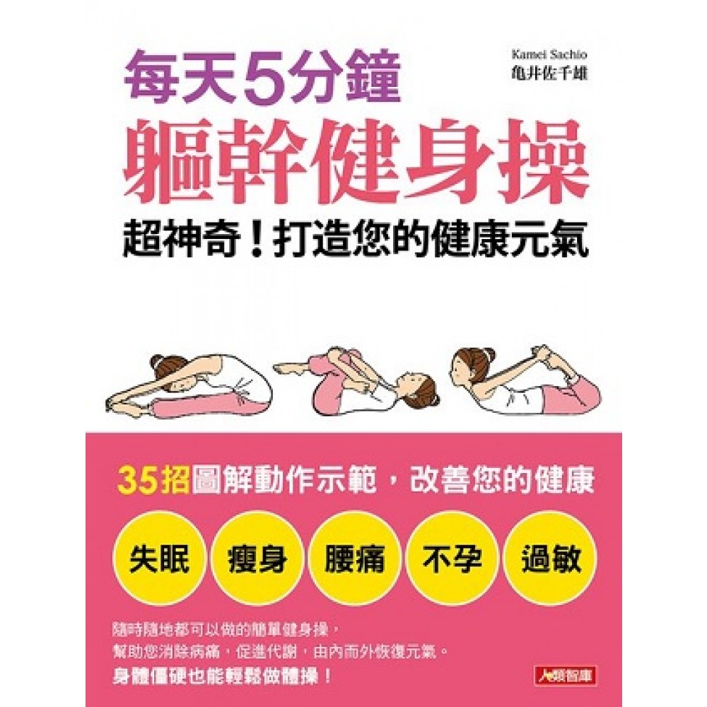 ◎ 圖解35招超神奇軀幹健身操:本書特別搭配手繪圖片,清楚呈現動作姿勢,並搭配重點小提醒,一看就懂,一學就會! ◎ 由內而外恢復元氣的健康法:每天只要5分鐘,消除病痛、促進代謝,解決所有的不適,請您一定要利用「軀幹健身操」,將已經置之不理的小毛病、大困擾,一一根治! ◎ 隨時隨地都可開始做:作法十分簡單,一次所需的時間只要5分鐘,也不用任何道具或特別空間,隨時想做就能做。 首次公開! 超神奇「軀幹健身操」 每天只要5分鐘,解決身體所有不適 失眠、瘦身、腰痛、過敏等常見症狀,一次搞定! ◆ 健康、美容、抗老化之鑰就在軀幹中 軀幹的使命可分為三個,主要是支撐整個身體,再來是讓身體動起來,最後是將內臟固定在正確位置。而軀幹孱弱的話會造成內臟下垂,漸漸產生縫隙,因此造成血液與淋巴循環滯留,不僅會形成生病的源頭,也會使得代謝力低落,容易囤積脂肪及老廢物質。請您一定要了解調整軀幹的重要性。 ◆ 不擅長運動也能輕鬆做到的「軀幹健身操」 「軀幹健身操」是僅利用5個步驟,每天只需5分鐘,就能鍛鍊軀幹的訓練法,基本上以站姿進行,活動臀部、腹部、大腿、胸部、腳5處的肌肉,透過呼吸送入養分進而鍛鍊軀幹,從內部開始強健,達到美化身體與整頓心靈的目的。沒有運動或瑜伽經驗的人也能馬上開始,而且任何人都能夠確實感受到效果。 ◆ 能夠整頓身心的神奇「軀幹健身操」 持續進行「軀幹健身操」還有個共同點,就是身型變好,全身緊實之後,不僅有美體雕塑的效果,還能消除骨骼歪斜,使姿態變好。不少人治癒了肩膀痠痛、生理痛、便祕、手腳冰冷等常見的疾病,再再證明了調整身體的同時,心也變的有精神且輕盈,真不愧是能夠整頓身心的神奇健身操! 好評不斷!持續體驗「軀幹健身操」的親身見證 ★完全解除半個月的憂鬱,便祕與皮膚乾燥都治好了,好事連連! ──女性,28歲 一直很嚴重的生理痛與經前症候群,大概一個月有2週以上身體到處都不舒服,因為不想吃藥而開始實行「軀幹健身操」,現在症狀完全解除。 ★從小就患有的異位性皮膚炎根治了!身體從根本開始改變,一天比一天健康 ──男性,35歲 狀況一天比一天更好,令人困擾的異位性皮膚炎都沒有再發作,真的太厲害了 !果然身體還是得從根本開始改變,這才是最重要的。 ★搶救懷孕後走樣的身材,每天5分鐘訓練出漂亮線條 ──女性,36歲 從懷孕期間到產後,每天持續做「軀幹健身操」,沒有產後變胖的困擾,非常順利回到原本的體型,精神也變好了。
