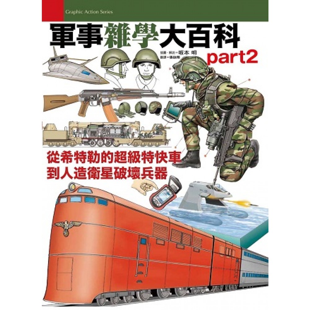 坂本明的圖解軍事雜學第二彈! 本書主要著重於各式火砲以及工兵裝備的介紹,包括榴彈砲、加農砲、戰防砲、防空砲的比較和操作模式說明,以及戰鬥工兵的架橋、渡河、排雷裝備等等。其他還有AK-47的發展、構造介紹、現代俄軍個人裝備、先進步兵的作戰模式、人造衛星的破壞與太空戰爭、戰車發展簡史、希特勒與天才科學家保時捷的發明,以及特種部隊水中作戰等等。彩色拉頁介紹的則是納粹德國的超高級列車計畫與二次大戰的裝甲列車。