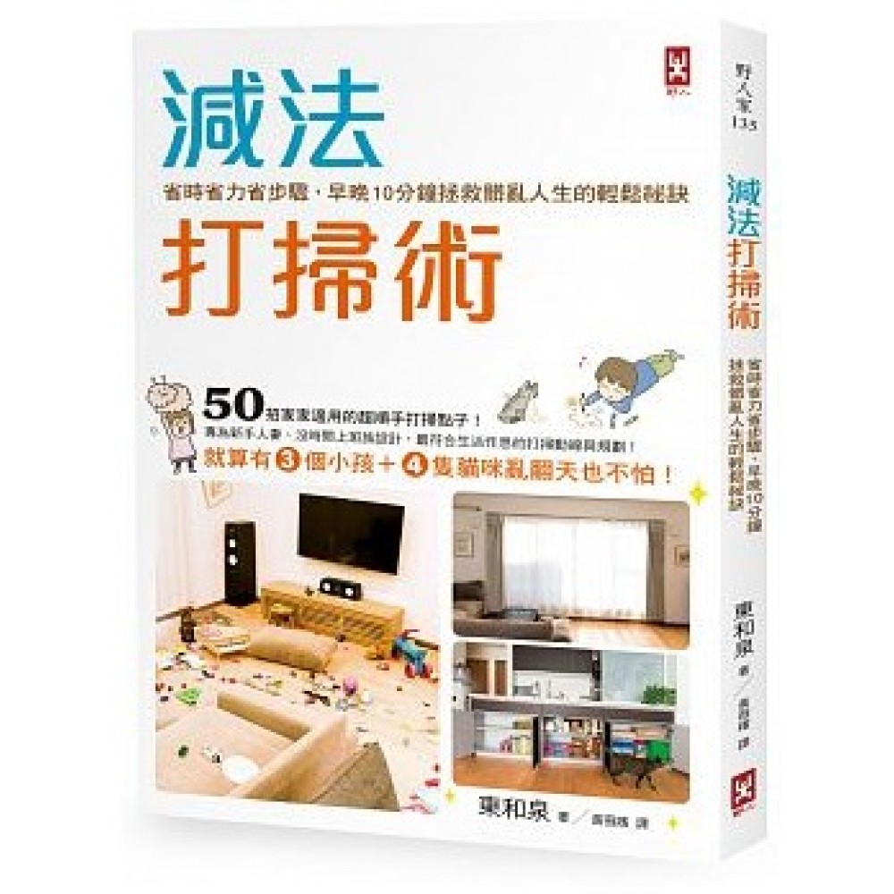 002 小孩3人X貓咪4隻,就會亂成這樣、髒成這樣! 004 前言 012 換個想法!讓打掃變輕鬆 第一步驟 提升打掃動機,不再提不起勁的妙招 018 首先,讓房子深呼吸 020 只打掃重點,就能瞬間乾淨三倍的訣竅 022 從最亂的地方開始,就能順水推舟打掃完 024 「收拾」和「打掃」是兩回事 026 當作睡前的重新整理,對明天充滿期待 028 columun 1 打造與孩子、寵物清爽生活的空間 第二步驟 基礎打掃篇 簡化工具和手法 032 工具越少,打掃越順手! 034 將淘汰的日常用品變成打掃工具! 036 不同功能的六色除塵布,就能讓環境亮晶晶! 038 打掃工具要收在「常用的地方」 040 為了小孩與寵物著想,打掃只用最環保的清水,不怕過敏和中毒! 042 搞定打掃流程和動線──讓身體自然記住就不會偷懶 044 1分鐘!雙手並用,隨手擦掉貓毛、灰塵、手垢! 046 髒到極點的地方,使用準備淘汰的廢布,用完即丟! 048 使用吸塵器速度要放慢,不留痕跡地滑過整個房間 050 擦地板要一步步往後退,並保持心情愉快 052 超感動!溼+乾雙重擦拭的效果就像打過蠟一般 054 衛浴、廚房設備的水垢,噴三兩下就能光亮無比 056 黏答答的油汙變得清爽乾淨 058 用小蘇打粉對付難聞氣味 060 玩具及寵物用品,也用最安全、安心的小蘇打粉清理 062 只要一塊除塵布!一口氣擦乾淨孩子掉落的食物 064 塗鴉一點也不可怕,順著線條就能清掉! 066 5秒剝除標籤貼紙 068 對付完強汙垢及異味的剋星──含氧漂白劑 070 columun 2 就算有孩子、寵物都不擔心的無障礙空間 第三步驟 進階打掃篇 將打掃當成娛樂,時間越短越有效率! 074 限制打掃時間能夠提升效率! 076 必學!除塵布的十二面極致使用法! 078 順應季節、氣候變化的特性來打掃! 080 下雨天的局部重點打掃 082 清晨&深夜是無聲打掃的最佳時段 084 揮揮手、扭扭腰,打掃也能順變瘦! 086 像在磨鑽石般,利用指尖力量把舊鍋具擦乾淨 088 清除縫隙汙垢的好點子 090 頑強汙垢利用熱水對付 092 溼布軟化對策!對付乾掉的液態髒汙 094 全部取出、全布擦拭、全部放回! 096 偶爾翻翻桌子、家電,換角度找出死角的汙垢! 098 也試著移動大型物品 100 清洗玩具 102 columun 3 打造與孩子、寵物共同生活的安心空間 第四步驟 養成隨手打掃的小習慣,可常保家中窗明几淨 106 規劃好固定的打掃流程&週期 108 廚房 114 廁所 118 浴室 124 盥洗室 130 和室 134 玄關 136 窗戶 139 陽台 140 把大掃除當成熱鬧的廟會活動!