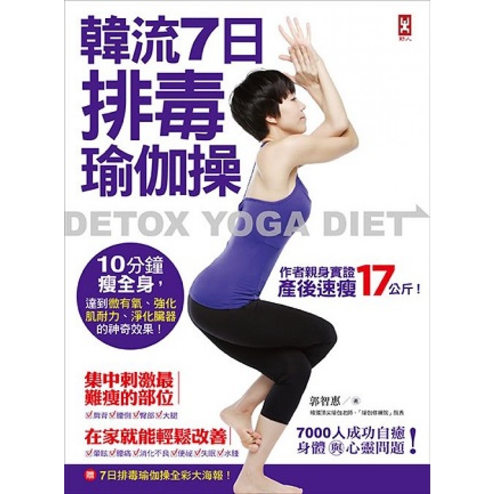 一天10分鐘瘦全身,達到微有氧、強化肌耐力、淨化臟器的神奇效果! 肩頸痠痛、消化不良、肥胖水腫、肌膚黯沉…全部都能改善! 頂尖瑜伽老師親身實證, 產後靠排毒瑜伽操,速瘦17公斤,恢復產前健康體態。 7000人體驗,成功自癒身體與心靈問題 你知道你已經變成「有毒體質」了嗎? 食安問題越來越嚴重→體內累積大量毒素→淋巴系統的循環停滯→囤積成頑固脂肪 毒素的惡性循環,是讓身體產生暈眩、腰痛、消化不良、便祕、失眠……等問題的主因。 透過七日排毒瑜伽操 成功反轉有毒體質,找回健康! 有效刺激身體每個部位→促進血液循環→加速淋巴循環排出老廢物質→自行調節壓力 改善最令人在意的20種症狀+雕塑19個部位! ˇ淨化臟器、身心輕盈、有活力 ˇ調整脊椎、矯正骨盆 ˇ打造纖腰、翹臀、筆直美腿的好身材 身體毒素累積即將爆表的6大警訊! ●曾因為工作壓力而導致頭痛無法入睡。 ●外食習慣造成便祕或消化不良。 ●只要月經來就會痛得下不了床。 ●有看遍名醫卻仍然醫不好的莫名疼痛 ●3C產品不離身、手機電腦使用時間超過10小時。 ●容易脹氣、水腫,體重突然飆升瘦不下來。 韓流明星都在做,讓你重返無毒生活! 星期一輕盈解痛,消除頸部疲勞物質 星期二充滿朝氣,活絡神經系統、強化血液循環 星期三活力充沛,調整骨盆有助能量循環 星期四放鬆舒壓,淨化身心、提升體溫 星期五加強循環,使全身肌肉充滿彈性 星期六強化肌力,消除下半身水腫、痠痛 星期日淨化臟器,刺激全身,安定神經系統 【本書特色】 ‧ 一週七天的循環、一次10分鐘,讓身體由內到外都釋放毒素。 ‧ 症狀別加強版:依照個人需求改善身體痠痛、消化不良、便祕、頭暈等問題。 ‧ 體態別加強版:依照個人需求雕塑身體曲線,讓腰、臀、腿脂肪不累積!