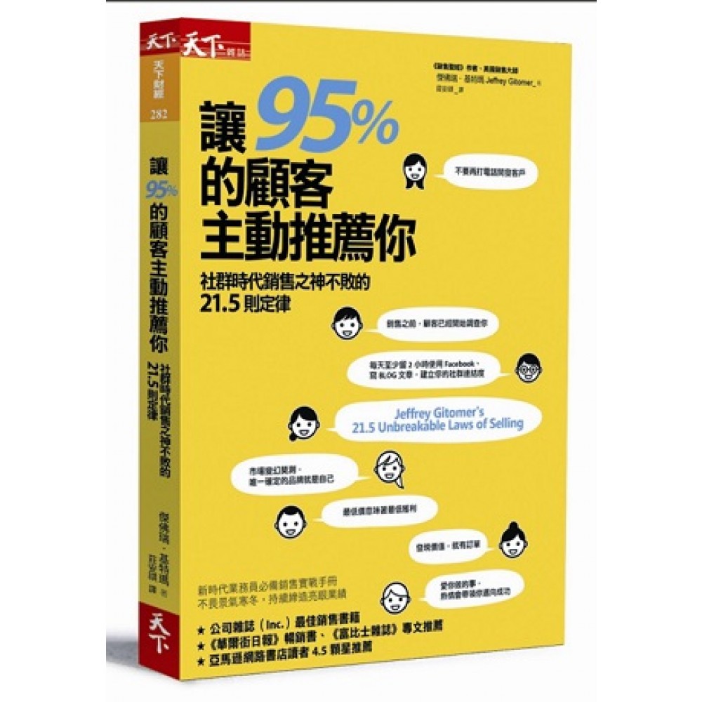 前言 遵守銷售定律,締造亮眼業績 每個業務員都在尋找創造更多業績的方法。有時是因為業績壓力或銷售計劃不得不這麼做,但有時是因為銷售勢如破竹,你希望能好上加好。幸好,讓業績成長的方法並不只有一個。 在現實生活中,你努力推銷,最後卻失敗。你很確定可以拿到這筆交易,但有個環節出了錯。你可能會把失敗歸咎在價格、採購、投標、競爭或其他原因,但事實上是你違反某一條銷售定律。是價值和價格不符嗎?是銷售技巧太差嗎?是因為沒有證據可以說服顧客?還是顧客根本不相信你?不管原因是什麼,結果就是失敗。 說出你的銷售宣言 1970年代中期,我在紐約市中心競爭激烈的環境下奮鬥,我打敗對手、贏得勝利,而且一切都合乎道德倫理。 等到年紀稍長,我才了解之前會成功是因為我的溝通技巧。對手不像我有熱情和信念,也不像我想把熱情和信念傳遞給其他人。 但是,不要以為每一次銷售我都會成功,我沒那麼厲害!但我從每一次失敗的經驗中學習,而且還記錄下來。 幾年後我開始傳授我的銷售理念和銷售策略。我知道如何用大家喜歡的方式表達我多麼熱愛銷售。他們也因為我的建議而獲得成功,很快就有更多人想更深入了解我的想法。 我充分了解,是因為我對銷售的熱愛,讓我產生熱情,讓我有非常清楚的願景: •我熱愛銷售,所以我要成為銷售天王。 •我喜歡寫銷售文章,所以我要成為銷售書天王。 •我喜歡傳授銷售技巧,所以我要成為銷售演講天王。 對於熱愛的工作,你也能說出相同的宣言嗎? 成功的銷售 想要像我一樣,需要一點時間: 1.工作的第一個10 年,我學會銷售的法則。 2.工作的第二個10 年,我讓自己更熱愛銷售,更相信自己銷售的商品。 3.工作的第三個10 年,我迫切想要把學到的知識寫出來、說出來,讓更多人可以運用。把我的技巧和成功轉變成他們的技巧和成功,甚至是財富。更直接的說,變成你的財富。 3.5 如今,工作40 年後,我終於了解業務也必須遵守牢不可破的定律,才能達到最終的目標,成功的銷售! 這本書記錄的不只是顯而易見的業務知識和成功法則, 也是培養你成為成功業務員的基礎。只要閱讀這本書,了解這些銷售定律並善加利用,就能更明白它們為什麼是顛撲不破的銷售定律。一旦你掌握這些定律,就能建立堅實穩固的基礎,創造亮眼的業績,建立成功的事業。 這是努力奮鬥之後應該獲得的回報。 (本文摘自天下雜誌出版 《讓95%的顧客主動推薦你》)