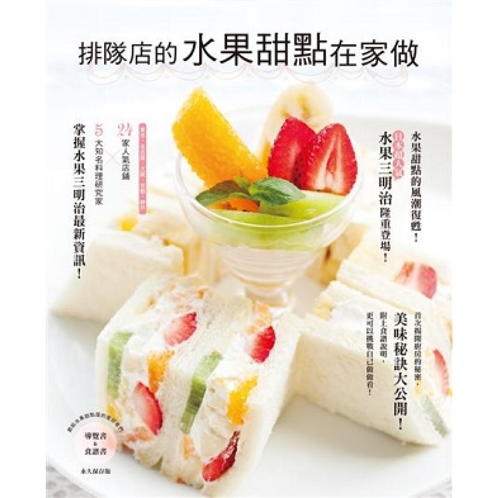 水果甜點現在正流行! 獨家專業的食譜公開,不必跟著排隊, 你也可以享用到頂級的美味! 水果甜點屋的人氣大復甦!難以抵擋的滋味席捲日本。 何謂水果甜點屋?就是水果為主角、主角為水果,與一般咖啡店或是甜點店不同,專為水果量身打造的甜點,從飲品到食品,絲毫不放過,專家大推「水果三明治」更是令人驚豔的美味! 本書分為兩個章節來介紹:Part1特別從東京、名古屋、大阪、京都、神戶五大都市之中,選出24家超人氣水果甜點屋,先介紹人氣招牌甜點,隨著攝影機鏡頭再深入廚房,完全不私藏的美味秘訣,最後製作過程一次呈現,一口氣掌握水果甜點的最新資訊! Part2收錄五位知名料理研究家指名一定要介紹的「水果三明治」特輯!不只誠心推薦自己心中的NO1,更親自上陣,邀請讀者動手做做看!一起進入水果甜點的華麗饗宴! 滿足視覺與味覺的雙重享受,結合食譜與導覽的甜點書籍,幸福即刻上映! 本書特色 24家超人氣水果甜點屋╳五大知名料理研究家 共同締造水果甜點奇蹟! 首次深入廚房,美味秘訣獨家公開! 創新水果咖哩,無法言喻的頂級口感大曝光! 內含店家資訊以及製作方式,看得到、吃得到,更做得到! 同場加映 CP值超高,只要吃過絕對讚不絕口的水果三明治★★★