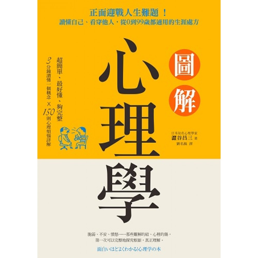 超簡單、最好懂、夠完整 3分鐘讀懂一個概念 X 150則心理煩惱詳解 全日本暢銷 110,000 冊 圖解書第一品牌西東社首度中文授權 日本著名心理學家 澀谷昌三 攜手心理學大師 佛洛伊德、榮格、皮亞傑...... 聯手打造最輕鬆易懂、也最完整涵括現代人煩惱的心理學啓蒙書 人生豁然開朗,找回自我與自信 周志建(心理博士/故事療癒作家/私塾帶領人)、 楊明磊(淡江大學教育心理與諮商研究所副教授)、 林旻沛(國立臺灣師範大學教育心理學與輔導學系助理教授)、 王浩威(精神科醫師、作家)、 許皓宜(諮商心理師、作家)、 蘇絢慧(諮商心理師、心靈叢書作家)、 簡意玲(臺大醫院精神醫學部主治醫師)、 謝文宜(實踐大學家兒系副教授) 推薦 從0到99歲都適用,每個家庭都必備的心靈醫藥箱 脆弱、不安、憤怒⋯⋯那些難解的結、心裡的傷, 第一次可以完整地探究根源,真正理解。 「自覺是治療的開始」,心理學存在的目的,就是幫助人們認識自己。這本書淺顯易懂,是心理學入門的好書。 -周志建(心理博士/故事療癒作家/私塾帶領人) 本書的特色即是將專業、系統的心理學知識,以易懂清晰的圖畫,深入淺出又清楚明白地引導讀者進入心理學世界,只要與人接觸就能用到心理,《學圖解心理學》是您進入心理學殿堂最輕鬆有趣又不失專業的方式。-楊明磊(淡江大學教育心理與諮商研究所副教授) 心理學是一門與生活息息相關的科學,相信透過圖解 心理學的引領,我們定能知己知彼、開創屬於自己幸福且美好的人生!-林旻沛(國立臺灣師範大學教育心理學與輔導學系助理教授) 心理學是認識人類內在運作最重要的學科。缺乏對人心理的瞭解,無疑是另一種形式的文盲;心理文盲。將對自我、對他人、對生命一無所知。而此書正是你對心理不再無知的最佳解說,讓人充份學習認識人,認識生命。-蘇絢慧(諮商心理師、心靈叢書作家) 心理學可以很科學、很實用、也可以很生活化、很時尚。這本像字典一樣的心理學工具書,證明了有人的地方,就有心理學。-簡意玲(臺大醫院精神醫學部主治醫師) 本書以淺顯易懂的方式,帶領讀者進入心理學的領域,並提供許多平日生活中可以運用的知識與解答,是很好的入門書籍。-謝文宜(實踐大學家兒系副教授) 天天都得面對的人際關係、工作壓力、忽遠忽近的戀情、婆媳大戰⋯⋯我們隨時隨地都在面臨自己的各種情緒潰堤,而身為團體生活的一份子,我們也無時無刻都受到他人的反饋與影響。心理學正是一門專業的學科,以科學的方式探索自己與他人的心靈,並解決這些雖然日常卻影響深遠的難題。 人類對心靈的好奇從未停息,從亞里斯多德開始,就不斷有人投入這個領域,長達2000年的討論與研究,心理學的系統龐大、流派眾多,加上近年來對大腦的研究日新月異,想要一窺心理學全貌的讀者,要不就是只能跟著某幾個流派走,要不就是不知該如何下手。 本書邀請日本浸淫心理學30年的澀谷昌三撰寫,以最符合現代人的課題為主軸,並網羅心理學各重要的大師與理論作為輔助,加上西東社專業的圖解技術,讓看似艱深難懂的心理學化為一段段輕鬆易消化的零食,理解起來毫不費力,於是才能更了解自己與他人。 ※本書系尚有《戀愛心理學》、《他人心理學》將陸續出版。