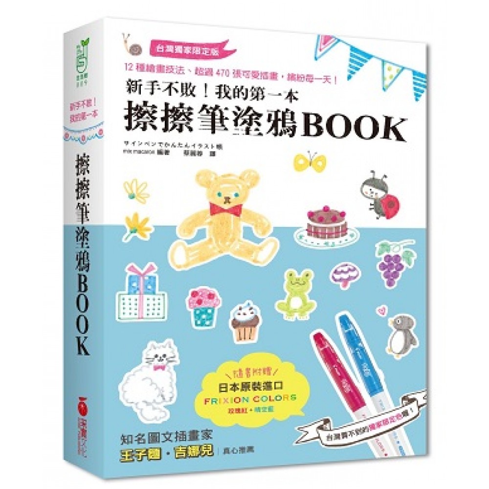 【台灣獨家限定版】我的第一本擦擦筆塗鴉書! ★隨書附贈★日本原裝進口【Frixion Colors擦擦筆】2支 ★人氣限定色★【玫瑰紅】【晴空藍】坊間買不到的經典顏色 ◎歡迎來到彩色擦擦筆的魔幻樂園! 擁有神奇擦擦筆,你也是插畫達人。步驟簡單,想畫就畫,立即上手。不小心畫錯了,還可以擦掉重來。本書獨家附贈日本原裝進口「Frixion Colors擦擦筆」,是坊間絕對買不到的「獨家特別色」,畫具與畫冊的驚喜組合包,手癢可以馬上動手,大玩塗鴉遊戲! 常常羨慕會畫畫的人,三兩筆就能勾勒出可愛圖案,點綴卡片、筆記和手帳,自己卻連個簡單的圓形都畫得歪七扭八?別氣餒!就讓「Pilot Frixion Colors擦擦筆」成為你最好的伙伴,用簡單的幾個步驟,輕鬆畫出你所有的想像。 ◎擦擦筆就要這樣玩!快來體驗3大神奇魔力! 對沒有畫畫經驗、覺得自己天生手殘的初學者,以及功力深厚、想更上層樓變出更多新創意的進階者來說,擦擦筆都是最棒的塗鴉武器。除了筆觸滑順容易描繪、大範圍上色容易、色彩選擇豐富繽紛之外,最重要的是它有其他鋼珠筆、彩色筆無法取代的3大神奇魔力: 【畫錯修改】:對畫圖新手來說,因為線條畫歪、上色凸出去而失敗,絕對是最挫折的事。「Pilot Frixion Colors擦擦筆」獨家專利研發「熱感應墨水」,畫壞了只要用筆蓋上的橡皮稍稍摩擦,就能輕鬆擦拭不留痕跡,失敗幾次都不怕! 【細部留白】:彩色筆好上色,卻有個致命缺陷──「筆頭粗,無法處理細部」。如果想畫件藍白相間的橫紋襯衫、黑熊身上的白色V形紋、左右交叉的大量白色線條,不妨試試擦擦筆吧!塗滿整個色塊後,以擦拭的方式處理細部留白,再怎麼刁鑽的細緻圖案都難不到你。 【線條修飾】:先勾勒線條再塗上顏色,是最傳統的畫圖方式,但你試過先上色再修飾線條嗎?這特殊技巧唯有「Pilot Frixion Colors擦擦筆」才做得到!隨意塗滿顏色後,利用擦擦筆修飾出輪廓,就會變得很好看喲! ◎一畫就上手,再畫就上癮!一起來玩插畫遊戲 本書收錄12種繪畫技法、超過470張步驟分解的可愛插畫,動物、人物、植物……通通收錄,將擦擦筆的魅力發揮到淋漓盡致。只要利用隨書附贈的2支「Pilot Frixion Colors擦擦筆」,就可以馬上開始大玩插畫遊戲,完全不必擔心手殘畫錯,請放鬆心情,開始動手畫畫看吧! 等到上手後,再來挑戰進階的表現方式!活用擦擦筆的功能,畫出留白的圖案,或修飾完整的輪廓線條。只要隨意在信件或便條紙加上插畫,就能讓收件人會心一笑;也可以在隨身的行事曆上畫上插畫,每次打開來看都充滿驚喜!讓我們利用擦擦筆進入插畫的異想世界,再把歡樂不斷地散播出去! ◎本書5大特色 1、隨書附贈2支日本限量進口彩色擦擦筆,坊間絕對買不到的經典顏色! 2、第一本針對擦擦筆設計的塗鴉教學書!善用擦拭、留白、細部修飾,變出可愛花樣。 3、以「禮物書」概念包裝,畫冊與畫筆的全新組合,送禮自用兩相宜。 4、日本三大人氣插畫家親身示範,台灣知名插畫家「王子麵」、「吉娜兒」好評推薦。 5、超過470張步驟分解的可愛插畫全收錄,將擦擦筆的魅力發揮到淋漓盡致。