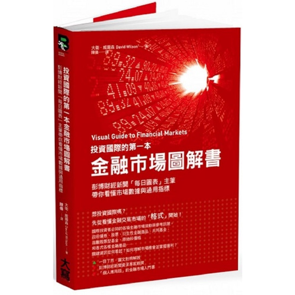 除了台股之外,你想投資世界市場嗎?又該擁有哪些基本常識? 本書可說是成為「國際金融市場投資人」一部最簡潔的入門課本。 《投資國際的第一本金融市場圖解書》就是要幫助所有人了解全球主要金融市場, 並透過其中的機會獲取投資利益。 【本書特色】 ◆重點提要─針對該單元另外以提要方式加深印象,並且協助讀者再次翻閱時可以快速查詢。 ◆名詞定義─針對專有名詞定義,讓你對於專業用語不再陌生。 ◆按部就班搞懂─針對書中的內容,本專欄主要加強讀者實際應用及練習。 ◆自我測驗─實際驗收學習成果,更方便自學及教學使用。 本書深入討論三種基本類型的投資標的──政府、企業證券和涵蓋黃金、原物料商品及不動產的實體資產,內容蘊含許多和這些市場直接與間接相關的寶貴資訊;書中採用了大量的線圖和其他形體化的輔助工具來闡述眾多相關的概念,因此讀者能輕易將書中的資訊實際運用到日常生活中。 本書先從最簡單的投資標的開始,再循序漸進地探討較複雜的投資機會, 另外,作者也一再強調金融市場投資的三個「R」:報酬、風險和相對價值。 在內容中除了介紹金融資訊的基本知識外, 也討論了利息與股利、可能會傷害到投資人報酬的要素, 以及判斷一項資產的價格是否偏低、偏高或合理的方法。 作者將逐一檢視這些項目和每一種投資類別──包括債券、股票、衍生性金融商品、共同基金、指數股票型基金、指數和其他眾多產品間的關係,這些都是對投資海外非常關鍵的資訊。 國際投資者必知的各項金融市場波動與參考訊號 以知名的彭博財經新聞為範例,從頭介紹初入門者看懂金融交易市場的「格式」, 包括政府債券、股票、衍生性金融商品、共同基金、指數股票型基金、原物料價格和各式各樣金融產品──它們的關鍵資訊從何看起?如何理解市場機會並掌握獲利? 專為金融業初入門者與個別投資人特別設計,清楚看見隱含在市場結構、工具和價格動態中的種種力量,並說明如何利用這些知識來為自己謀求利益。 ★三種基本類型的投資標的: 政府債券、企業證券和涵蓋黃金、原物料商品及不動產的實體資產,和這些市場直接與間接相關的寶貴資訊為哪些? ★對照大量的線圖和其他視覺化的資訊: 用最常見的國際市場資訊工具闡述眾多相關的概念,能輕易將書中的資訊實際運用到日常生活中。 ★循序漸進地探討複雜的投資機會: 強調金融市場投資的三個「R」:報酬、風險和相對價值,如何避開可能傷害到你投資報酬的要素,以及判斷一項資產的價格是偏低、偏高或合理? 作者大衛‧威爾森從一九八○年代就開始研究金融市場, 曾任彭博新聞公司內多項要職、也曾為世界各地彭博同僚設計教育課程, 他將協助你快速學習詭譎多變的金融市場資訊。