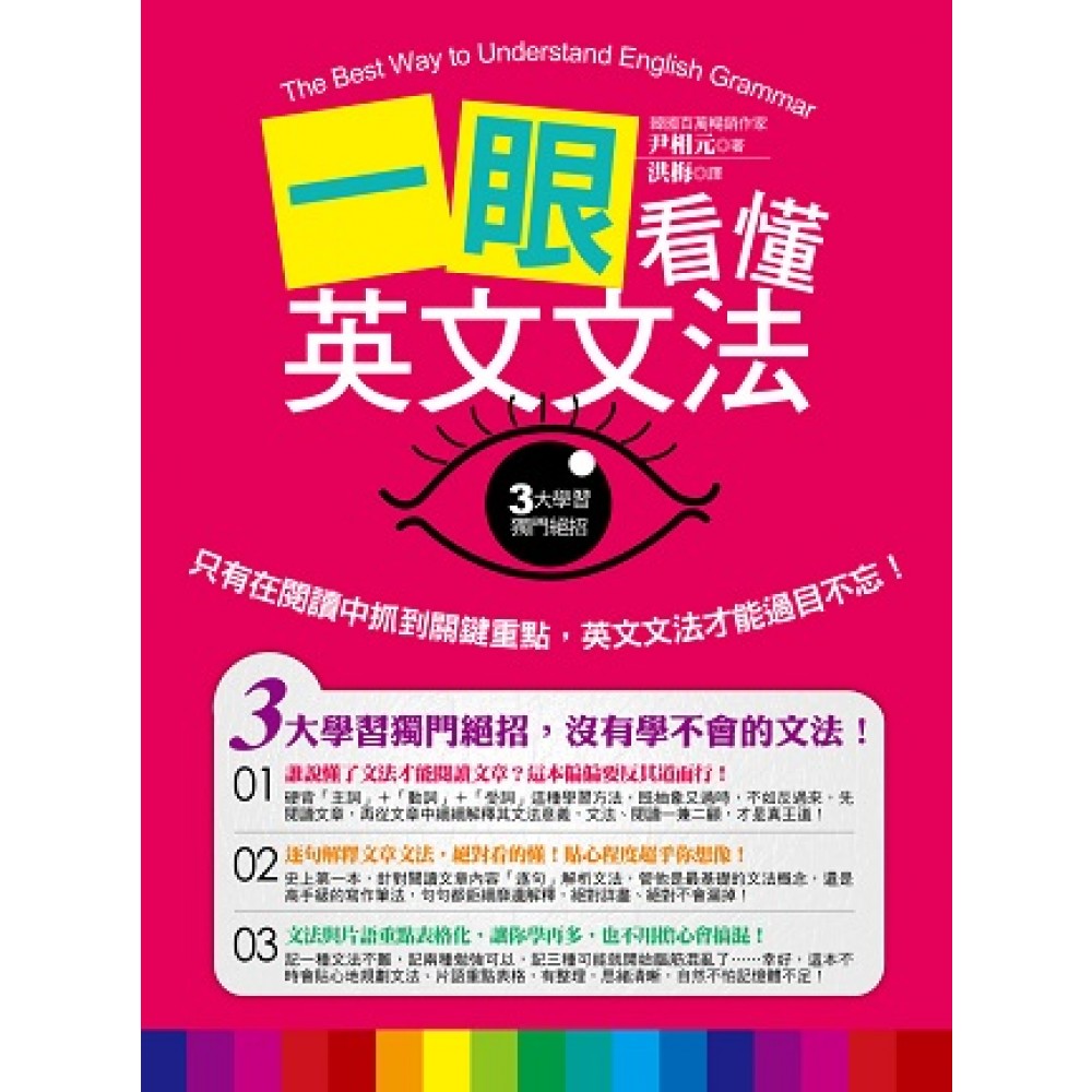 英文文法,這樣學就對了! 1.死背文法太抽象,從閱讀學文法,才是真王道 先閱讀文章,再從文章中細細解釋其文法意義 學文法、練閱讀,輕鬆一兼二顧! 2.逐句解釋文法,絕對好懂!貼心程度超乎想像 管他是最基礎的文法概念,還是高手級的寫作筆法 句句都鉅細靡遺解釋,絕對詳盡、絕對不會漏掉! 3.文法重點表格化,學再多,也不擔心會搞混 記一種文法不難,記兩種還可以,記三種可能開始混亂 幸好,這本不時會貼心地規劃文法重點表格 有整理,思緒清晰,自然不怕記憶體不足! 3大學習獨門絕招 從此沒有學不會的文法!【本書特色】 01誰說懂了文法才能閱讀文章?這本偏偏要反其道而行! 以前老師上課,總是會先要你背下諸如「主詞」+「動詞」+「受詞」+「受詞補語」等一大堆的文法句型以後,才會教你去閱讀文章。這種一板一眼的學習方法,讓學生在接觸閱讀以前,就被排山倒海而來的文法給一擊撂倒了……這本以更貼近人性的方法,反其道而行:讓你先閱讀文章,引起興趣後,再針對文章裡的文法逐一解析,從今以後對於英文文法不再存有未知的恐懼感,有了閱讀的輔助,也不用害怕被抽象的概念打敗!學文法既然有捷徑,何必按部就班? 02逐句解釋文章文法,絕對看的懂!貼心程度超乎你想像! 明明我搞不懂的是這一句,偏偏老師卻解釋另一句……文法的疑惑千奇百怪,到底有沒有辦法一次解決所有煩惱?有的!這一本貼心地為你將閱讀文章中的「每一句」句子,都鉅細靡遺地一一解析其文法架構,讓你無論是哪裡不清楚、有問題、想深究,都可以得到解答,再也不必擔心發生找不到自己想要的說明解釋之類的窘境,絕對滿足你對文法求知的渴望! 03文法與片語重點表格化,讓你學再多,也不用擔心會搞混! 也許你對你的背書功力很有把握,覺得記一種文法不難,記兩種也輕鬆自在,記三種還算OK,記四種也沒有太大問題……那麼一次記下100種文法呢?你有自信能夠過目不忘嗎?別鐵齒了,快翻開這本書吧!它不時會貼心地規劃文法、片語的重點表格,讓你記再多的文法片語,都能有條不紊,絕不搞混!文法有整理,思緒又清晰,自然不怕記憶體不足!來人啊,我要一次打100個! 簡單三招,一眼就記!搞定文法,念念不忘!