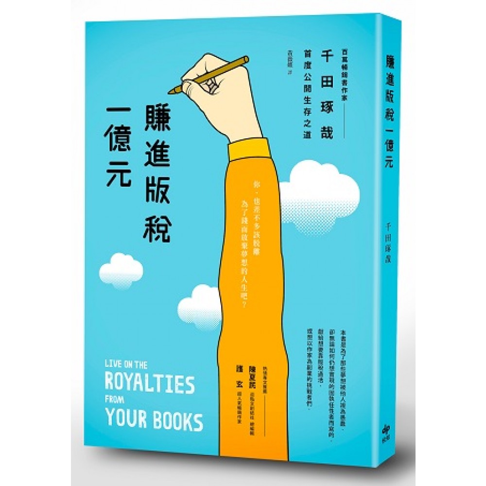前言 賺一億,不是為了成為有錢人,而是為了寫作寫到斷氣為止。 第一章 開頭的第一本書 01 「這種東西我也寫得出來」這種自我良好感覺,就是最棒的才能。 02 先從自我介紹開始。 03 想要輕鬆賺錢的人最不適合 04 「不賣錢也無所謂,我想寫出一本好書」這是笑話。 05 與其去報名作家培養學校,不如在現在的環境裡累積實際成績。 06 別說得天花亂墜,先靠自己的能力寫出書稿吧。 07 你絕對猜不到外頭有多少出版社在徵一般稿件。。 08 最好每天寫部落格。 09 第一本書就傾注一切,不要有半點質疑。 10今後從批評的一方變成接受指教的一方。 第二章 處女作無論如何都要再刷 11 處女作要寫擅長的內容,而非喜歡的內容 12 找合適的中小型出版社好過找大型出版社。 13 行銷內容由作者率先提議。 14 大致決定上市前的準備工作。 15 別忽略簡單的贈閱。 16 初版一刷的版稅全部用在行銷上。 17 在大報刊登半五段大小的廣告,效果最佳。 18 逛書店時,每家書店買一本,當作捐錢做善事。 19 快要再刷之前,開始著手寫第二本。 20 賣到第三刷才是真本事。 第三章 以賣出十萬冊為目標 21 突破十萬冊就是通往版稅一億的關卡。 22 突破十萬冊時,各類採訪就會出現。 23 賣出三萬冊會有三家、十萬冊會有十家出版社招手。 24 五萬冊與十萬冊的差異,在於相關人員的堅持不同。 25 將最近兩年的暢銷書全部買回來每天欣賞。 26 每週去一趟書店,瀏覽所有的新書封面。 27 參加有實績的出版顧問公司所舉辦的昂貴講座。 28 進入出版社的「年度重點書名單」。 29 擠進「年度重點書名單」之後,就要全力尋找各種助力。 30 「作者」×「編輯」×「業務」決定銷售成果的49%。 第四章 著作暢銷後的一年 31 突破十萬冊的最大報酬就是十本書的寫作邀請。 32 限制「下一本要賣二十萬或三十萬冊」,就無法賣出好成績。 33 賣出十萬冊之後,接下來的目標是十本書賣十萬冊。 34 低潮期成堆的退稿,在寫出暢銷書之後會派上用場。 35 成了暢銷書作者仍然遵守截稿日,才是重點。 36 拍攝影片更應該謹慎判斷。 37 也要試著與評價不好的人共事一次。 38 在波濤洶湧的一年之中,找到自己的風格。 39 無論有多忙,寫作最優先的原則絕不妥協。 40 十家出版社之中任何一家是否再度邀稿,決定你的未來。 第五章 達到巔峰之後 41 版稅全部拿去存起來,你的作家人生就結束了。 42 即使不安,也不要和不夠優秀的夥伴結黨。 43 與其期待一部作品賣一百萬冊,不如期待一百冊作品賣一百萬冊。 44 五年出版五十冊,你的書在書店裡就會有專區。 45 巔峰期過後的五十冊,才是你真正的資產。 46 與其為了銷售量而開心或難過,不如成為不賠錢的作家。 47 只要擁有與二十多家出版社合作的實際成績,就會讓人刮目相看。 48 把編輯的煩惱諮詢寫成書,你永遠不缺好點子。 49 讓自己成為讀者心目中戒不了的毒品。 50 「煩惱時就要看千田先生的書」是對我最好的讚美。