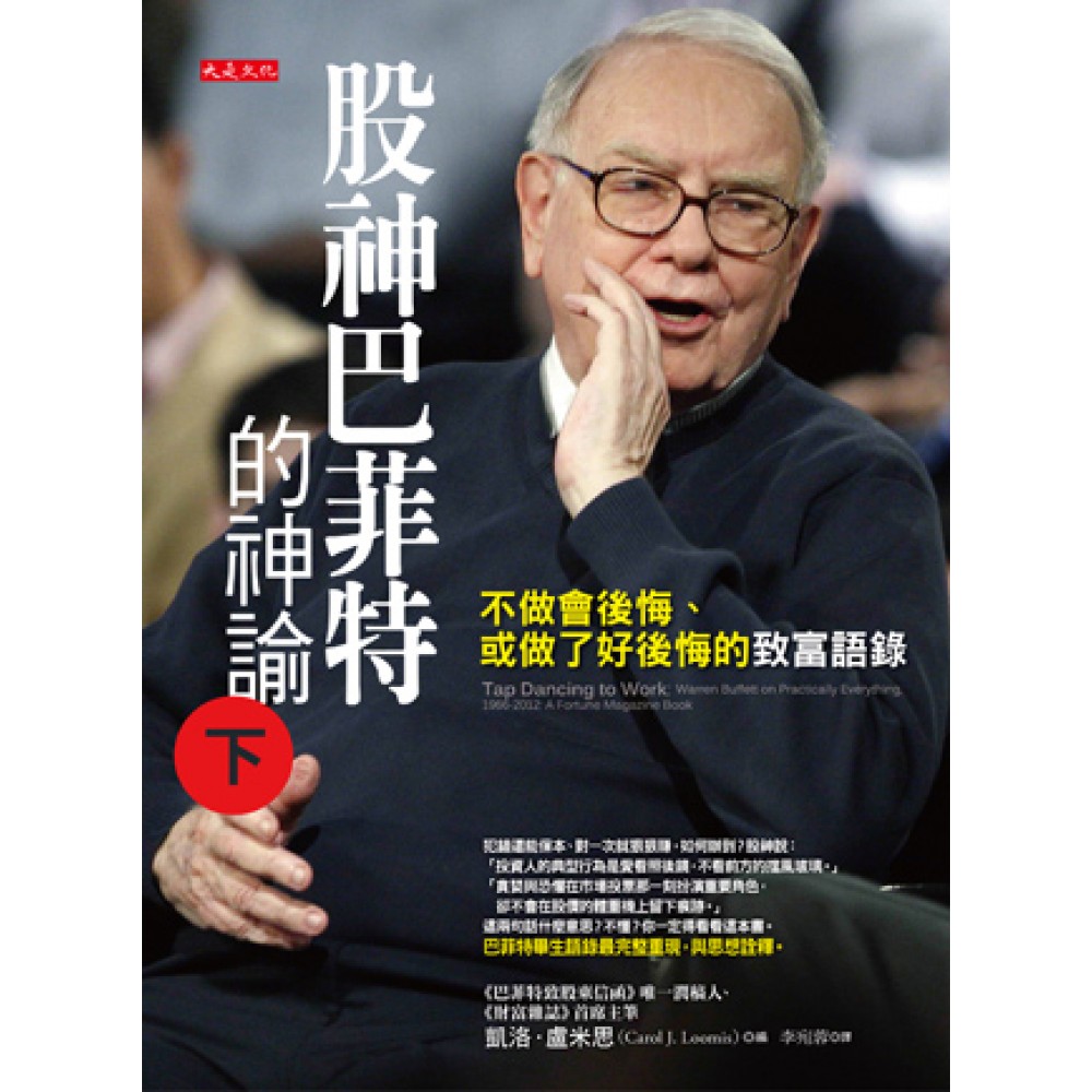 第四部 看準盤勢的一、兩堂課(1999-2002) 37.投資獲利,與智商無關。不信?你看…… 38.只做自己懂的事 39.股市暴跌時,我就來聽股神講福音 40.如何遏止假帳?聽聽先知妙計 41.巴菲特第一次給投資人的開課 42.我支持希拉蕊,捐一千塊 43.其實我經營比選股更神 44.巴菲特給投資人的第二堂課 45.企業界夢寐以求的四個字 46.巴菲特說了太多話的那一天 47.切勿用股利做為選股的唯一標準 第五部 除了股票,我還投資這些……(2003-2006) 48.我看衍生性金融商品 巴菲特親筆 49.再談垃圾要分類 巴菲特親筆 50.好花不「長」開,看準趕緊摘 51.發揮影響力的方式:少開口 52.揮霍島與節儉島 53.巴菲特品牌系列商品 54.我所聽過的最爛忠告 55.做錯和錯過,後者才是嚴重犯錯 56.誰害你滾不出雪球? 57.巴菲特背後的男人 58.支持通用汽車,買車不買股 第六部 還有哪些事我不做會後悔、或做了會後悔(2006-2012) 59.巴菲特的錢怎麼都給了比爾蓋茲 60.叫「擔保」的,通常沒擔保 61.信用紀錄不良的股神 62.為何金融風暴下你毫髮無傷? 63.花十年證明指數型基金卡好 64.我繳的稅太少了 65.巴菲特教你判斷何時進場 66.我的銀行拒絕貸款給我 67.巴菲特V.S.比亞迪,誰在幫誰充電? 68.最受推崇的,推崇誰? 69.購併快狠準,因為更懂整頓 70.跳著踢踏舞去捐錢,更難啊! 71.爸爸是神,兒子如何做自己? 72.股神為何不投資黃金 巴菲特親筆 編者最後的話 謝詞