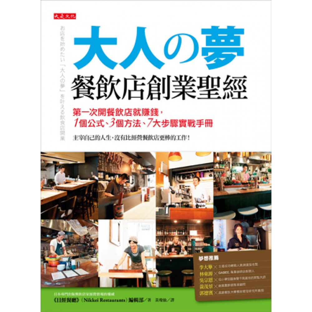 推薦序 一本餐飲店創業者最好的參考書 還記得在高中時期,我就已經對餐飲業產生興趣。那時,只是單純地對調製飲料感到有趣,便開始收集許多相關的書籍與資訊,身邊的親朋好友們都變成了我的白老鼠,甚至開始從得到的讚美聲中有了小小的成就感。 大學時,咖啡館變成我最常出現的場所,在不同的裝潢與氛圍中,去觀察、體驗老闆們所要創造與傳達的想法,所以那時咖啡店變成學校以外,我最常出現的場域。退伍後,便正式進入咖啡行業,接下來所有的生活都跟咖啡連結在一起。除了長時間的工時,再加上學習許多事物,讓我打下了現場營運的扎實基本功。但是,經營咖啡店還需要更多元素與資源,所以我花了七年的時間,實踐自己夢想的第一步──開設「GABEE.」。 當然不可能就此一帆風順,面臨的現實要不斷地去克服、超越,在技術、產品、經營、管理、規畫、行銷與發展上,都必須不斷地成長進步。所以,開設一家餐飲店並不如一般人想像的容易,真的需要許多熱情去支持。 這本《大人の夢 餐飲店創業聖經》,可以成為餐飲店創業者最好的參考書。書中介紹許多成功的餐飲店家其心路歷程,也寫出經營者的想法與獨特的觀點。不同規模大小與形態業別的餐飲店,有著不同的思維與難處,而大家的共同之處就是擁有強大的熱情。 日本餐飲業的競爭非常激烈,所以書中的成功案例非常具有參考價值。此外,我認為與臺灣餐飲店經營者最大的不同之處在於──書中的老闆們都是以經營品牌的想法去思考與經營,我想這是值得我們深思的部分。對於開餐飲店有興趣的您,準備好要跳進這個市場了嗎?!先靜下來,好好地閱讀一下這本書吧。 林東源 GABEE.專業咖啡店創辦人 推薦序 創業,做自己最拿手的事 創業前幾年,媒體稱我為蛋糕業的傳奇人物時,最喜歡談的是──我只有國中學歷,對於不懂經營的我,卻造就許多成功故事特別感興趣。當初,因為在日本郊區見識到蛋糕名店大排長龍的景象,便在心中埋下創業開店的種子。 當我領悟到要做客人想要的蛋糕,而且還能感動他們時,才敢真正開始籌備創業。當時不到30歲,手邊僅有20萬,毅然決定先找出「客人」,選擇蛋糕代工批發給咖啡廳。我把每家咖啡廳都當作潛在客戶,挨家挨戶拜訪。代工批發的生意,讓我思考自己和咖啡廳以及咖啡廳的客人,三方如何三贏的問題。當我滿足了咖啡廳老闆的食材成本卻使銷售量降低(因為無法用好的原料),我開始意識到必須走「品質路線」,切片蛋糕還要做得比其他店家大……漸漸累積第一桶金,才放膽開第一家店。 七坪大的店面,是在人煙稀少的萬里街頭,剛開始營業丟的比賣的還多,但因在網路上引起討論,逐漸打開亞尼克的名聲。創業這十多年看似順遂,但我一直走得戰戰兢兢,曾經迷失自己,只想著賺更多錢、開更多店來證明自己的能力和價值。在跌跌撞撞中,就如同書中所說的,我認清到:做自己最拿手的事情──用心把拿手的蛋糕做到最好,因而受到顧客長期的青睞。 對於想創業的人,我想要分享「本人、本錢、本行」三本的重要性。創業必須親力親為,才能了解顧客想要什麼,這就是人本;本錢就是資金,不要好高鶩遠;本行,就是做自己最能掌握的領域或興趣,更能邁向成功。 吳宗恩 從小學徒翻身變千萬富翁的甜點大師、亞尼克創辦人 推薦序 最棒的實戰藍本,讓你只對成功說「YES!」 大是文化特將日本暢銷書《大人の夢 餐飲店創業聖經》出版成中文版,這本書是我看到最棒的創業指導藍本。對許多想創業的朋友而言,更是值得推薦的一本創業工具書。 最近在創業授課與輔導中,常聽到創業者問我創業的首要關鍵是什麼?也因此,我也嘗試問自己:假如重新創業,我會怎麼做?這麼多年與眾多創業者相互切磋下,我發現以往對創業的觀念,其實有不少迷思。唯有從現實面理解創業的操控力,打破迷思、釐清觀念,才能成功掌握創業的精髓。 事實上,創業絕不是一個輕鬆的美夢,它就像一場永無止盡的戰役。成功的創業家會從諸多創業的項目中,評估少數幾個選項,思考出可承受的得失風險。一旦作了決定,就要謹慎管控風險,例如可與他人合夥分散風險;也可把行動計畫分為若干小計畫,縮小風險範圍,以便隨時調整及學習。 創業需要全力投入、專注做一件事情。所謂的專注,就是能對自己說「不」!你可能必須在100個選項中,對99個說「NO」,只允許一個「Yes」存在。首先,挑選創業行業就是一門必修的功課。事實上,創業家最難做到的就是在面對不確定的決策時,除了採取確定的行動,又同時保持自省、虛心接受新知或學習錯誤。如何在兩者之間權衡拿捏、取捨,考驗創業者的決斷能力。 針對市場、產品、顧客……,你如何決定自己要的是什麼?本書的12個創業個案告訴你,成功決斷力就是:認清自己,才是實踐「做頭家、賺大錢」夢想的真功夫。你可以在創業前做好自我盤點與評估,弄清楚自己想要什麼(期待與夢想)?最喜歡什麼(興趣與專長)?清楚明確地規畫未來目標,將自身擁有的資源作最有利的優先順序組合。 懂得掌握競爭優勢(比人、比本事、比智慧、比資源、比魄力、比速度……);了解競爭條件(定位與資源分配);有計畫地實踐目標(強大執行力)的人,通常成功的機率較大。 書中建議創業先從有興趣的行業評估,可以打工累積實戰經驗後再創業。除了選擇創業標的,還需要熟悉預定創業的