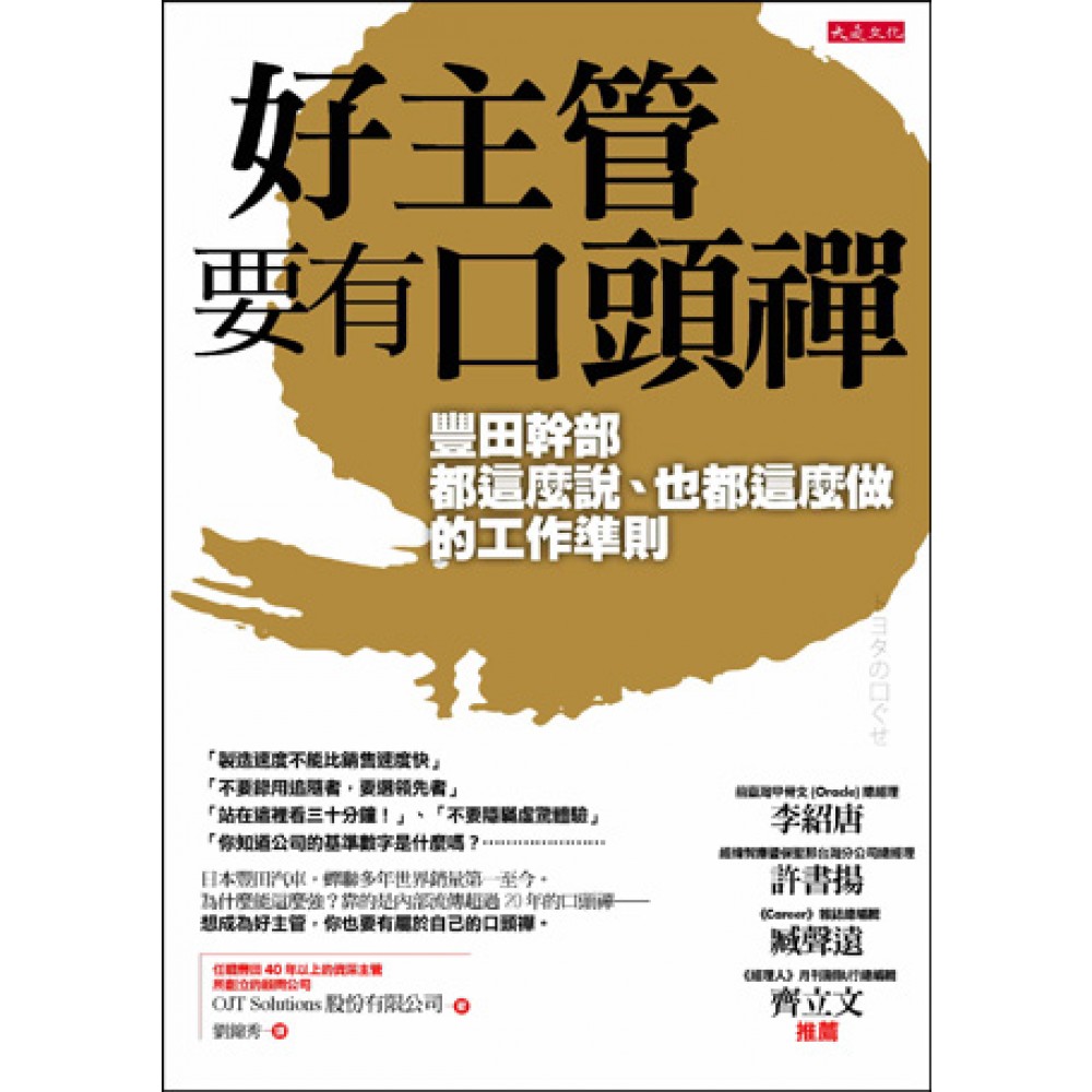 不論在什麼樣的企業,在日常工作當中,你一定聽過公司內部的人常常掛在嘴上的口頭禪。從老闆告訴幹部、幹部告訴一般員工、前輩告訴後進之輩的這些話,都是凝結內部各種想法之集大成。例如,自家公司的理念是什麼,對員工的期許又是什麼等。 二○一二年汽車銷售輛數世界第一、日本企業指標的豐田汽車(Toyota Motor Corporation。豐田在二○一三年保持世界第一汽車製造廠的頭銜,銷售量達到九百九十八萬輛),也有自己代代流傳的口頭禪。為了不讓員工忘記豐田曾經有過的困境,就算業績再好,主管也會不斷透過口耳相傳,告訴部屬以豐田生產方式(Toyota Production System,簡稱TPS)為首的各種「豐田式思維」。 好主管口頭禪:「不要天天忙救火,你有自己的事要做!」 在豐田當上組長的人,平日除了要思考能否遵守「標準作業手冊」(詳見內文)、體系運作是否順暢、設備適不適用等問題之外,有許多業務要做。如果天天被工作追著跑,光是解決眼前的問題,就搞得人仰馬翻了。 「當眼前的工作發生了意外狀況。如果夠冷靜的話,就會去想這種問題是不是已經不是第一次發生了,應該要好好擬出一個徹底解決的方法。身為組長的我,如果只專注在『先把爛攤子收拾乾淨』這件事上,急忙跟著最前線的部屬專心滅火,沒有退一步思考問題的本質,那麼同樣的錯誤就會一直重複發生。」曾在豐田擔任組長的堤喜代志解釋道。 當時已升任組長的堤,不斷被直屬主管提醒:「不要天天忙救火,你有自己的工作要做!」一流的管理者應該著重於改善和栽培部屬。天天被瑣事追著跑、漫無計劃地瞎忙,不是主管該有的做事態度。 上司的首要任務是進行改革,讓工作現場不再失火(出錯)。即使撲滅眼前這場大火很重要,但你不能總是在幫忙救火。 天天加班,做事方法一定有問題。 好主管口頭禪:「領導者要有放手的胸襟,員工要有放膽一試的勇氣」 田中暎直(「暎」音同「英」)從一九七○年任職之後,就一直在高岡工廠(日本富山縣的高岡市,位於日本北陸地方中部)做車體板金成型的工作。離開之後,即在全國各地的生產線幫忙指導作業。那個時候,他常說:「領導者要有放手的胸襟,員工要有放膽一試的勇氣。」田中把在豐田難忘的體驗,都濃縮在這句話當中。 他進入豐田之後,就被分發到負責板金的團隊,他可以說是在板金的噪音聲中,偷學前輩的技術,不斷磨練、成長。 當時,豐田的「標準作業手冊」還沒有確立,想要擁有該領域的專業技術,只能邊看邊模仿,等到你可以獨立作業後,公司才會把需要負起責任的任務交給你。果然,不久之後,田中終於可以使用一台老舊的機器,開始製造車身底部的零件。 過了一段時間,公司對所有的工廠都下達了「目標為絕對TOP」的指示,也就是要求員工以達成業績目標為優先的方針。於是,各個生產工廠之間,開始彼此競爭。主管告訴田中:「這是個好機會。就算弄壞機械,你也要大膽一試!」 「人很奇怪,別人愈是叫你做什麼,你就愈不會採取行動,尤其那個時候我操作的,還是一部很老舊的機器,就算公司的策略是『目標為絕對TOP』,我也不敢貿然行動,就怕有個萬一,機器就被我弄壞了。可是後來主管說,失敗也沒關係,勇敢去做就好,於是我決定放膽一試,挑戰自己的極限。」 剛開始時,田中負責的機器,生產力真的是「絕對TOP」。雖然四周的人都很擔心,覺得那台機器如果再繼續加速一定會掛掉,但它還是衝了好一段時間,可惜一個月後,大家的擔心終究變成了事實,機器果然故障了。繼生產停止之後,陸續又有瑕疵品出現而引起騷動,結果還是失敗了。 但是,當初要田中勇敢去試的主管並沒有責備他,就連當時到出事地點查看的專務(經理、董事)也一樣。 「怎麼回事?」 「報告專務,機器壞了。」 「挨罵了嗎?」 「不,我沒有被任何人責罵。」 「嗯,那我就放心了。」 一股暖流自田中的胸口湧上來,他從上級那裡收到了強烈的訊息,那就是─不要畏懼失敗,做就對了!「其實我也知道這樣使用機器,它一定會壞掉,但當時我唯一能做的,就是放手一搏。每次想到當時鼓勵我的主管,心中真的充滿了感謝,他的想法更是深植我心。」 有些事就是要不畏恐懼、大膽去做,才會成功。「目標為絕對TOP」的指示出來後,很多主管開始讓部屬做各種挑戰。當中也有不少失敗的案例,但從失敗中卻可以學到很多東西,只要把這些經驗累積起來,你的實力就會愈來愈強大。 愈是了解現場的人,愈明白新的挑戰必定伴隨著失敗這個道理。也就是因為明白這個道理,所以很多人寧願選擇不動、不前進。 「上位者一定要有讓人勇於嘗試的胸襟。所謂的『勇於嘗試』,就是指當部屬面對可能會失敗的情況感到不安時,領導者應該要對他們說:『有事我負責,你們儘管去做!』 不過,在你說這句話之前,得先為緊急狀況買好保險,才能在員工挑戰失敗時馬上給予支援。譬如,縱使把機器弄壞了,還有其他方法可以過關。換言之,就是要先為他們準備好一條逃生的路。勸告所有年輕人不要想得太多,只要有勇氣去做就可以了;領導者除了要多鼓勵員工嘗試各種挑戰之外,還必須事前想好替代方案,這一點非常重要。」 好主管口頭禪:「有六成把握就去做!」 山田伸一從豐田退休之後,就進入OJT為各個公司提供諮詢。每次遇到顧客時,他就會呼籲:「只要認為可行就馬上行動。」但光是這麼說還不夠,他還補充
