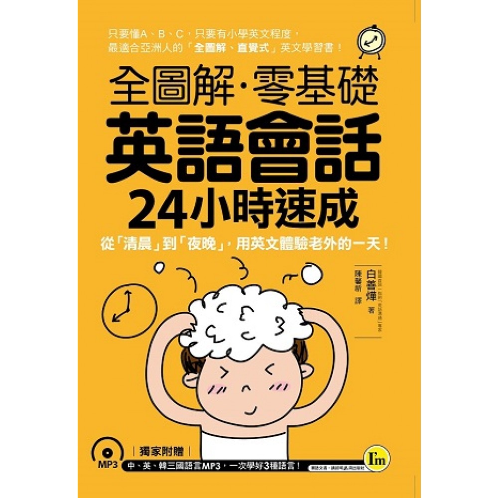 學英文不用背太多單字, 因為常用到的單字不到1,000個。 開口說英語不用懂太多文法, 因為老外也不會用文法。 《全圖解零基礎英語會話24小時速成- 從「清晨」到「夜晚」,用英文體驗老外的一天!》 專為英文初學者設計的入門工具書, 只要懂A、B、C,只要有小學英文程度, 利用48個從早到晚一定用得到的生活主題, 讓你不出國也能體驗全英語式的生活! 本書是最適合亞洲人的「全圖解、直覺式」英文學習書! 讓英文看得到、聽得到、用得到,記得住、不會忘! 6-60歲都受用的英文學習書, 一看就懂、一查就有、一學就會! 你還在抱著厚厚的單字書或是買6,000、10,000句會話書唸「How are you?I’m fine, thank you. / 你好嗎?我很好,謝謝。」嗎?千萬不要再這樣機械式的方式學英文了! 其實,學英文、背單字、讀會話不在乎學得多而是學得精且能夠學以致用。所學的內容最好可以直接運用到生活上,配合練習,奠定良好的英文基礎,提升且增進英文能力! 本書教你從零開始,由淺入深,第一次學英文就上手4大步驟 步驟1:基礎Basic 全書內容以最簡單的英文來學習每天都會遇到的生活情境,讓讀者可以直接運用在生活上,提升英文能力及日常生活會話。 步驟2:實用Pragmatic 學習從早到晚一定用得到的英文。全書共分成48個主題單元並依照時間順序分類,讓讀者可以學習不同時段的英文。單字背記、短句練習及口說會話,環環相扣的學習內容,奠定良好英文基礎。 步驟3:圖像Graphic 跳脫一般語言書排列方式,幽默詼諧的插圖,讓英文學起來活潑又生動。圖像輔助思考,加深讀者學習記憶,學習無負擔。 步驟4:練習Practice 透過練習可強化學習記憶,加強對英文的熟練度,徹底融會貫通那些學不會、記不住、搞不懂的生活英文。 學習用英語腦思考! 要學好英文,就不能用中文的邏輯來思考。《全圖解零基礎英語會話24小時速成-從「清晨」到「夜晚」,用英文體驗老外的一天!》利用實境模擬及圖像記憶,幫助讀者用老外的思考方式學英文。本書不教你一堆用不到的單字、文法,雖然內容看似簡單易懂,但卻是老外從早到晚都在用的英文。學好道地的英語,用英語開口對談,說出老外的一天! 中、英、韓三國語言對照MP3,兩種外語同時學,三種語言同時用,效率更好! 透過多種語言的共同學習,能夠加深印象,學習效率更高!本書MP3收錄全書單字、短句與會話學習內容,中、英、韓三國語言對照。從清晨到夜晚,貫穿每個生活細節,每天學習,讓兩種外語融入日常生活當中,讓學習更有經驗,想忘也忘不了!只需一本書就能讓你在全世界交朋友、做生意、吃喝玩樂!
