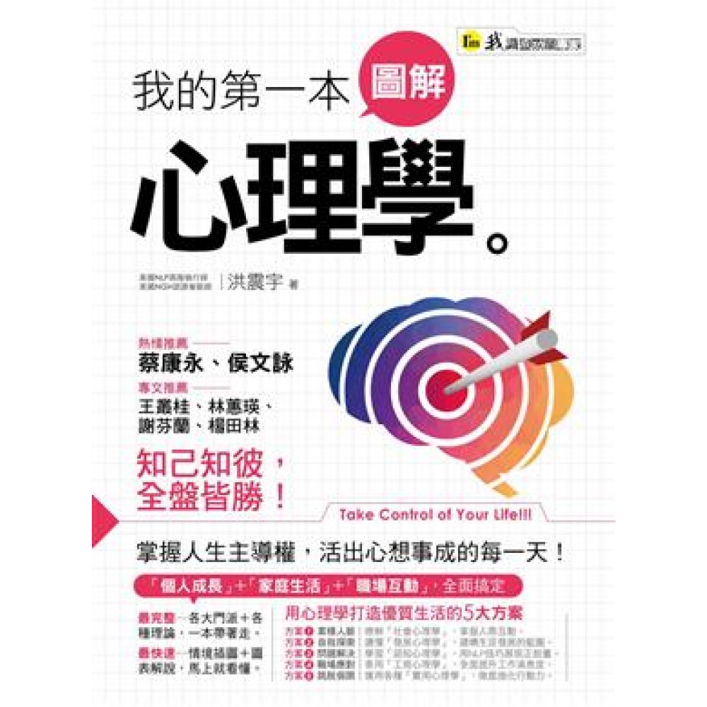 王叢桂 化知識為行動的實用心理學 我在1983年負笈美國完成心理諮商碩士學位後,面對生涯的選擇,是繼續攻讀心理諮商還是選擇其他領域,最後我選擇攻讀社會人格心理學領域,並於1986年得到博士學位,當時我選擇回台任教,因為覺得學習社會與人格心理學的人在自己的母文化中比較可以將所學貢獻於社會。回台後任教於東吳大學,二十多年來一直教授社會心理學或者相關領域的課程,也與兩位學術界的同事合寫了一本社會心理學的教科書。但是,總覺得自己的工作主要是在學術圈裡,對這個社會的貢獻不足。我非常欣慰的是看到我的學生洪震宇在工作之餘,嘗試將心理學的知識與生活應用結合,撰寫了一本適合一般人閱讀的書籍。這本書填補了我的遺憾,讓我感覺對這個社會有間接的貢獻。 震宇在大學時便展露了他善於將理論所學應用於生活之中的特性,他參與各項訓練班隊,學習如何將心理學知識轉化為生活行動。震宇在畢業後選擇將心理學,尤其是心理諮商的理論與實務技巧,運用於協助企業與非營利組織成員成長的工作,並且卓然有成。這本書結合理論介紹了心理學中的社會心理學、發展心理學、認知心理學、工商心理學以及正向心理學中與生活有關的知識,並且提供將知識轉化為實際行為的技巧演練,提供讀者自我改變策略以及人際關係技巧。 一般心理學者寫作書籍時會受限於長年的學術訓練,為了言之有據,往往引經據典,導致枯燥無味。這本書主要的目的在協助讀者運用心理學知識於生活中,因此即使是理論介紹,也從生活案例著手介紹心理學知識,符合了認知記憶中,運用既有經驗理解新概念的法則。這本書適合一般人閱讀,尤其適合工商界的成員閱讀,並且運用其中提供的自我成長練習,相信會帶給讀者意想不到的好處。我非常高興看到這本書的出版,也鄭重的推薦這本書給讀者。 (本文作者為東吳大學心理學系教授) 推薦序 林蕙瑛 心理學,就是生活! 震宇是我多年前的學生,活潑、熱忱、有愛心、好學及笑口常開是他留給我的深刻印象,畢業後斷斷續續有聯絡,也參加了他的婚禮。欣見他走自己喜歡的路,憑著心理學的基礎訓練、人力資源管理的深造以及工商界的實務經驗,成了今日的洪老師、洪顧問,教練、諮詢優則寫,恭喜震宇的第一本書《我的第一本圖解心理學》終於出版了! 曾經在圖書館翻閱過一本日文翻中的《三天讀懂心理學》,我們專業人士雖然看得懂,外行人或初入門者必會覺得「霧煞煞」,而《我的第一本圖解心理學》包含社會心理學、發展心理學、認知心理學、工商心理學及助人心理學五大領域,只要花一天閱讀,就能建立對心理學的概念,並產生興趣。因為震宇巧妙的手筆,淺顯易懂的文字,將西洋心理學基礎理論帶進章節中,以生活中常見的案例呈現,非常有親和力,就好像他對著你我讀者講話一般,生活化、現實感,充滿本土味。 本書的特色來自震宇的創意,線條簡單的漫畫有畫龍點睛之效,加深讀者印象,而表格整理,清楚扼要且易懂,每節結尾的練習是精心策畫,促進思考引發行動的自我成長作業。而震宇的功力則表現在他對心理學的融會貫通,結合古典理論的觀念與心理學新潮流的技術實務於每天生活中,讓讀者瞭解「心理學就是生活」(Psychology is life)的真正涵義,引領大家聚集正能量、正向思考,追求快樂的人生。 一般民眾讀了《我的第一本圖解心理學》才能知道心理學是什麼以及它的浩瀚領域,得以自我學習及個人成長,學校老師可以參考書中內容以淺顯貼切的例子來灌輸學生心理學的觀念,促進學習興趣及人際技巧,而心理諮商師或人力資源訓練師則可以教導案主或員工管理情緒、化解衝突、處理自己及人際上的問題,以安居樂業。這是一本好書,震宇的老師在此大力推薦,讓我們人手一本,成為生活良伴! (本文作者為東吳大學心理學系兼任副教授) 推薦序 謝芬蘭 最適合初學者的「心理學入門工具書」 第一次看到洪震宇是在建中的輔導室,他是輔導股長。最近一次看到他,是他獨力帶著女兒讓老婆休息一下,大包小包滿頭大汗來家裡,讓我看看他的下一代。我認識他,真的夠久了! 高中時代的他,是個認真嚴謹又有點害羞的人。在高三那年母親生病過世,面對這樣的衝擊,他會在進行談話之前做好想談的問題紙條,認真的一一尋找答案。當時我看著他,心知他要開始獨自面對自己的生命了,失去母親全然的照顧和疼愛,他得更早知道,很多問題其實沒有絕對正確的答案。 有一段時間,他面對許多壓力,說話有些不流暢,有時會緊張到漲紅臉,無法完整表達出他內在細膩而敏感的領悟。他喜歡親近人,喜歡瞭解別人,也喜歡觀察自己,大學選擇心理系是很自然的事。 因為進入相同領域,我們之間多了專業的探討,我也喜歡和他一起工作,不管是個案討論或是帶領團體,我們都有很多話題,震宇很勤奮也很熱情,參與很多課程的設計討論與帶領。 在人際關係、親密關係的經營,對於害羞的他,可以算是很勇於冒險和面對,每一次與異性交往,都讓他變得更體貼、更穩重。當個別接觸比較成熟之後,他更加入各種積極正向的團體,豐富彼此生命,也讓自己持續學習與進步。 他的特質加上他的努力,生命中會出現很多貴人相助,我跟他很有緣分,一直是他的見證。看著他自我探索,看著他為情所困,看著他在生涯路上跌撞乃至漸有所成,看著他步上紅