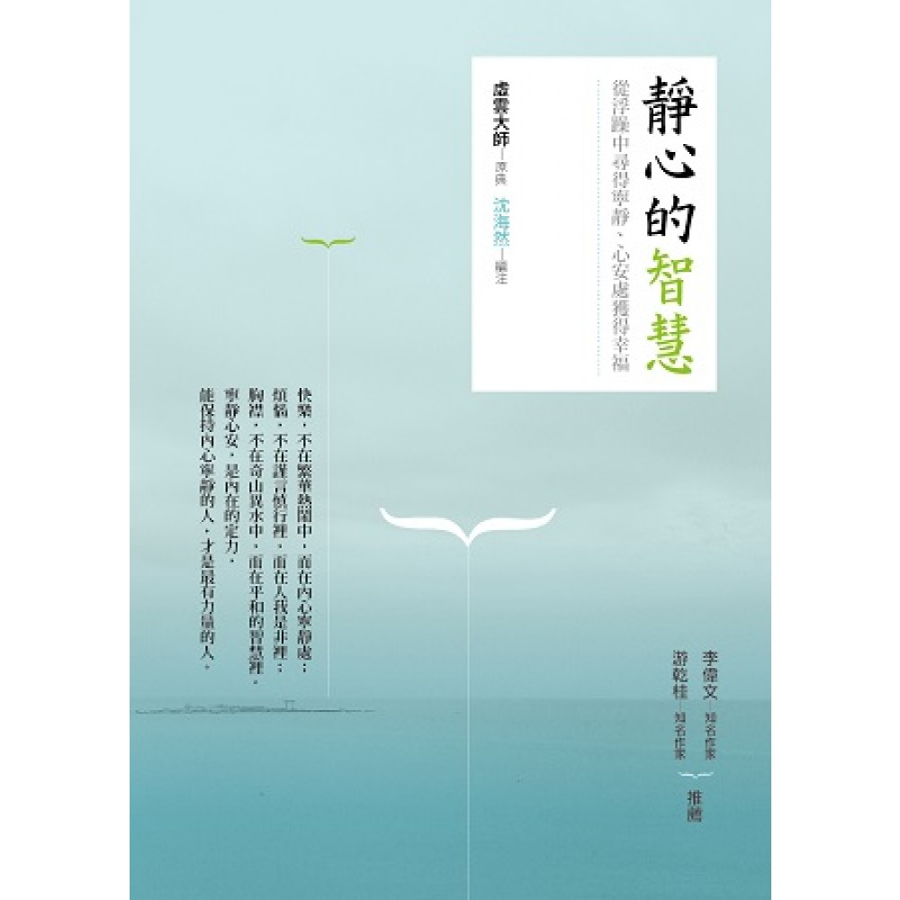 世界上的良藥,每一種只能治一種疾病;心靈的良藥——智慧與因果,卻可以治癒一切病苦。 一念心清淨,處處蓮花開;一花一淨土,一土一如來。當人們的內心在一念之間真正清淨了,在那一刹那,周圍就如同蓮花處處開,處處都是芳香。 虛雲大師曾對世人說過:時光長短,唯心所造。一切苦樂,隨境所遷。時間是刹那地過,刹那地催人老。人心不古,置因果於罔聞,哪知因果理徹,如影隨形,如響斯應,若深信之者,人心則不改而善。縱遇順逆之境,必無憂喜。當知現生所受,或遇兵刀水火劫賊等事,皆由自造。人若不給自己煩惱,別人也永遠不可能給你煩惱。 人只有定心、安心、靜心,不為外物雜事擾亂心境才能保持一顆澄澈之心,以一顆澄澈之心處事、做事,一切就會自然而然地順應內心所求。 心境清明澄澈,心神安定,你才有大智慧。有時候不以外物為攀比的物件,才能做到靜心,也恰恰是這份靜心,才能帶給你生機勃勃的生命氣息。 漫長的歲月中,煩惱束縛不斷,人們伸出手來卻只能抓住外物,很難擺脫內心的束縛,每個人都渴望有心清如水、蓮花盛開的心境,每個人都渴望擁有白鹿銜花,青猿獻果,四方歸附的感召力。但是很少有人能有一切隨緣去,任心性自在的坦率和定力。與其在誘惑中辨錯了方向,在名利相爭中離內心越來越遠,我們倒不如駐足片刻,調整好呼吸,聆聽自己真實的內心,只有這樣,我們才會更淡定,才能讓內心清澈如初,生命才能重新調整平衡。讓生命回歸平衡,是一種解脫生活桎梏的大智慧。 生活沒有上下限,只有回歸內心,感受到人性的純淨和簡單,才能感受到路的平坦;才能有寵辱不驚的定力;有一切順其自然、我當寧靜致遠的超然。 以一份悠然之情,隨心,隨性,隨緣,自在安心。生活就是如此,不管好的壞的,都要承受,只要做好自己,你對生命微笑,生命就是微笑的;只有找到內在的自性,你才會有真正的定力。 剪斷牽絆追隨內心,卸掉偽裝一身輕鬆,擺脫束縛方顯本性。其實,人生在世,要修的不是得到,而是一種安然自在的心境。虛雲大師少年出家,潛心修行一生,他上求下化,自度度人,修得滿心開闊境,一顆自在心。 本書的文字讓你在感受虛雲大師大徹大悟、超凡脫俗的心境中,重新解讀自己,找回原本屬於你的那份寧靜,讓你覺得生活中原來也可以有自己的真性情,原來生活竟可以如此的寧靜安然。