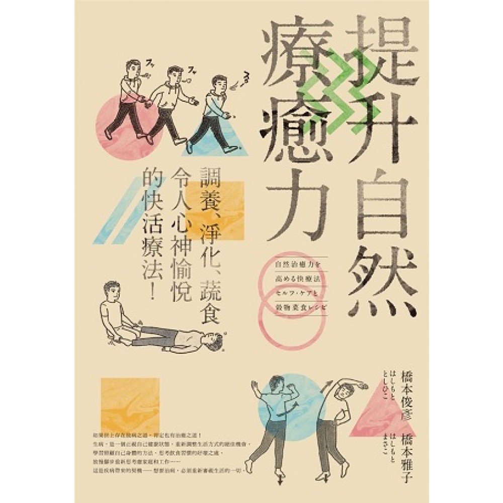 About 提升自然療癒力的快活療法 若是一個人在剛踏入致病之路時,能及時被帶往治癒之道上,身體便能感受到「快活感」;在充分享受「快活」之後,自然治癒力就會大幅提升,進而成為恢復健康的原動力。 橋本俊彥、雅子夫婦因緣際會在病中與「快活療法」相遇,改變了對自己「生病」的認知;它再也不是一道難題,而是重新認識自我的契機。在師習快活療法創始人—瓜生良介老師之後,返回故鄉設立健康諮詢診所至今,治療的基本架構,在於利用矯正筋骨歪斜的操體法,與舒緩內臟的溫熱療法,配合生命能量檢測以檢定身體狀態,以確認身體所尋求的快活方向,並且根據檢測結果提出有效的療法和飲食建議。 藉由敏銳的觀察力,對生命的慈悲胸懷,以及擁有從醫療第一線鍛鍊而出的堅強實力,橋本夫婦將快活的概念化為具體作法,透過親切、日常的口吻,詳述快活療法的概念,以及個別療法的細節。無論是操體法、內臟療法、足部運動、溫和斷食、穀物蔬食料理……快活療法不僅是治病技術,更將視野放寬至整體生活的改善。它同時是一種共享機制,鼓勵與身邊的朋友,一起進行「生活改革」—改變呼吸方式、改變飲食習慣、讓身體的活動方式與精神層面常保舒暢,持續努力朝著快活方向而改變。
