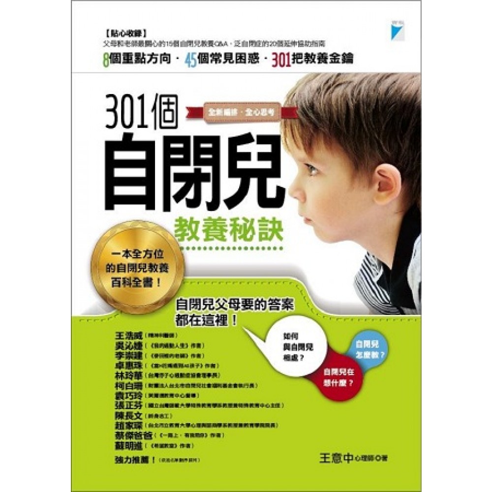 細心領會星兒的生命力 文◎王意中 在自閉兒的世界裡,存在著許多的異質性。當你遇見五個孩子,呈現在你眼前的,會是五個完全不同的生命樣貌,及屬於他與家人的動人生命故事。我想,在自閉兒的生命歷程中,最佳男女主角獎:孩子。最佳導演獎:父母。最佳改編劇本:老師及專業團隊。同時,孩子、父母、老師和專業團隊等將一起共同演出最佳劇情片。 自閉症與亞斯伯格症就像落在一道光譜的兩端,這些孩子同時受困於語言溝通、社會能力障礙,及刻板、侷限、重複的行為,和過度專注的興趣與活動上。這些核心問題,往往如一道石牆般,阻礙著人們與星兒們彼此的認識與瞭解。 診斷有時就像3C產品或電腦作業系統一樣,每隔一段時間就會出現新的版本。目前,新版精神疾病診斷與統計手冊第五版(DSM-V)取消了原先亞斯伯格症的 名稱,將上述診斷回到轉趨於嚴格界定的自閉症譜系障礙(autism spectrum disorder;ASD)。雖然亞斯伯格症名稱已經被取消,但並不表示這些孩子的特殊需求、身心特質及困境已經消失不見,或已獲得改善。 常常提醒自己,「遇見自閉兒,我是先看到孩子,還是自閉症?」請記得,所有的自閉症狀加總起來,並不等同於孩子這個人。有時,面對孩子的診斷,就像是百貨公司裡的品牌服飾專櫃。無論這些服飾品牌如何,自閉或亞斯,你需認識的該是退下品牌服飾後,一位具生命力的孩子,一位你必須細心領會的孩子。 自閉兒的情緒與行為等問題像數獨 (sudoku),每道似乎都有解答,只是我們需要花多少時間才能解開。常形容自閉兒像一道牆,是我們必需鑿開牆面一窺自閉兒的內心世界,還是總期待他們能夠將牆奮力一推。請想一想,在融合的這段路途上,我們彼此曾經為自閉兒做過什麼努力? 在這本《301個自閉兒教養祕訣》,融合了我自己多年來關於自閉兒在早期療育、兒童青少年心理諮商與治療、父母親職教養與校園心理諮詢等臨床實務。書中將和你分享自閉兒常面臨的8項關鍵成長議題。包括(1)刻板、局限與重複行為(2)興趣與專注(3)語言與溝通(4)情境調適(5)親師溝通與學習(6)班級經營與融合(7)遊戲與人際關係(8)同理與接納等內容。同時,提供301個問題解決策略,做為自閉兒父母在親職管教上,及老師班級經營上的參考秘訣。 感謝寶瓶文化朱亞君社長兼總編輯的愛護與支持,及我生命中出現的自閉症與亞斯伯格症孩子、父母與老師們,是你們讓我豐富內心的視野,看見生命中的各種美好與可能,並使自己的生命更有厚度。感謝在本書的書寫期間,我親愛的家人無盡的關心、支持、加油與陪伴。謹將此書獻給老媽、老婆與姵涵、翔立、涵立三好米寶貝。