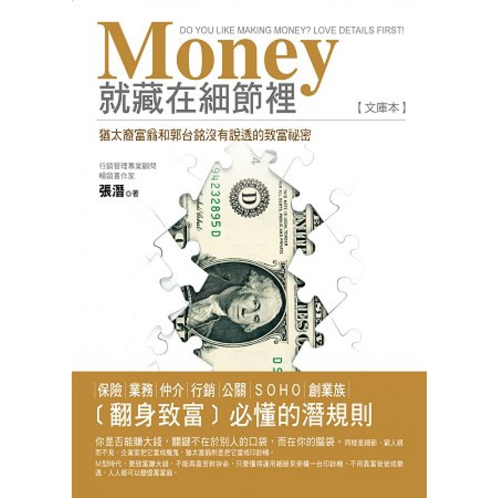作者序 為什麼你拚了命,還是一窮二白三負債? 我長期接觸及輔導保險、業務、行銷、公關和仲介人員,對於他們的苦幹實幹,為了業績不要尊嚴和健康,我真的很佩服他們的決心和毅力。 然而,這些拚命三郎的下場,多半仍是一窮二白三負債,好一點的,也頂多是付得出房貸頭期款,收入勉強可以維持在都會區中的高消費生活。 除了向我討教如何銷售和公關外,這些朋友也經常私下向我抱怨,雖然他們的收入會比一般上班族來得高,但業績不穩定,有做才有收入,倒楣的時候,就算做得半死,到頭來還是一場空。 他們最常問我的就是:到底這樣的日子要過多久,他們才能真正成為擁有生活品質和財務自由的富翁?為何別人可以每天渡假吃喝玩樂,但仍有花不完的錢呢? 這個問題,我早就告訴他們答案,但他們有聽沒有懂,少數聽懂的人,又想不透其中的核心關鍵,加上沒有執行力,所以,到現在他們仍然一直在問同樣的問題,仍然像籠子裡的白老鼠一樣,為了生活不停地拚命,卻找不到出路。 老實說,我認識太多白手起家的富翁,沒有富爸爸當靠山,也不會奢求中樂透來翻身,他們都只是平民凡夫,但不一樣的是,他們知道如何讓別人的錢自己存入戶頭的祕訣。 這些富翁和那些賺不到錢的業務行銷人員,最大的差別,就在於,他們從來不和我談如何賺錢,而那些無法成為富翁的朋友們,每次來上我的課或和我聊天時,最關心的,永遠是:如何把客戶口袋裡的錢,賺到自己身上。 在這裡,我想對那些拚了命仍然接近貧窮邊緣的業務行銷人員說: 「你是否能賺大錢,關鍵不在於別人的口袋,而在你的腦袋。」 如何成為富翁?如何讓別人的錢存入自己的戶頭? 這不是只靠行銷戰略、話術,或懂得識人術、讀心術,就可以達成的。 很多行銷業務人員,到現在仍搞不清,這些東西只是工具,只是技術,如果想成就大事業,成為真正的富翁,你需要的是更高階的核心智慧。 如果成功的事業和財富,是一輛車,你懂再多的行銷戰略或話術,也頂多是懂得如何把一堆零件,組裝成一輛車的外形,就算你還懂得如何把車子烤漆和打蠟,把車子整理得多麼光彩迷人,然而,車子沒有引擎,你的事業和財富,永遠只是一台展示車。 我所認識的那些白手起家的富翁們,都是打造引擎的高手。 然而,要打造一個強而有力的引擎,則需要你用心去建構和維護每一個細節,如此,這個複雜精密的引擎,才會發揮強大動力,為你賺錢。 過去的時代,老一輩的想法是對的,要拼才會成功,你比別人更賣命更努力,遲早有一天會成功。 然而,現在是M型時代,你不能再用舊思維來追求財富。現在的窮人之所以一直是窮人,就是因為他們只懂得為業績努力。 相對的,富人則懂得用系統和OPH(OTHER PEOPLE’S HAND)來自動產生業績,甚至是用OPT(OTHER PEOPLE’S TIME)和OPM(OTHER PEOPLE’S MONEY)來為自己架構起一個水庫型的收入模式。 畢竟,過去是A型的時代,中產階級居多,窮人富人都是少數,各自靠天命和運氣站兩邊。現在則是M型時代,中產階級不自立自強選右邊站,就會被市場擠到左邊的新貧區。 相對的,M型時代也是個財富不停重新分配的時代,這也表示,任何人也都有機會成為右邊的富人區,不需要靠賣祖產賣地,或是靠富爸爸,只要你懂得運用細節來建構一個致富引擎,你同樣可以成為M型右邊的億萬富翁。 這本書,就是要告訴你,那些郭台銘及許多白手起家的猶太富翁,不願告訴你,或者是沒有說透的致富祕訣。 在此,我也希望所有從事保險、業務、仲介、行銷、公關的朋友,甚至是SOHO、創業族和上班族,看了這本書之後,悟透了如何運用細節來「翻身致富」的潛規則,從此脫胎換骨,改變一生的命運。