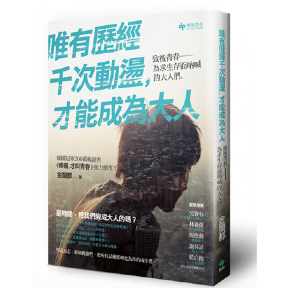 這是個充滿挫折的時代 致 親愛的台灣讀者: 這是一個充滿挫折的時代。 當機會變得越來越少,不平等的現象卻越來越多,要在這個艱辛的世道生活,並且成為一個大人,絕非容易的事。 隨著年紀的增長,你我脆弱的肩膀上所要背負的責任將越來越沉重。年輕時,對於踏入社會面對的難題還懵懂不知;然而,當年歲增長、人生閱歷逐漸豐富,那些困難也益發清晰、鮮明。 儘管蛋糕上的生日蠟燭數目已經多到令人吃驚,但捫心自問,我們還未成為一個真正的大人。站在人生的重要關口前,求職、結婚、工作、家庭……,我們內心經過一次又一次的擺盪。 究竟何時才能成為大人呢? 高中考試時,曾遇到了這樣一道題目:「孔子稱40歲為什麼呢?」,我回答:「不感」。但正確答案其實是「不惑」。除了因為那兩個漢字外形相似之外,那時的我還覺得「大人都沒有感情」。為此,還在練習本上抄寫了好幾十遍「不惑」,才背下了這個詞。說不定,當時記下的不只是「不惑」而已,還埋下了「等我到了四十歲時,就不再感到徬徨」的期待吧。 然而,等到自己來到了四十歲,才明白身為人的我們是永遠不可能「不惑」的。相反的,比起年輕時代的自己,反而經歷了更多的徬徨。同時,也再次感慨先賢孔子的偉大。 隨著歲數逐年增長,我不再祈求沒有徬徨的人生,而是決定勇敢去承受。試想那借助鐘擺來回晃動的力量而不斷前進的掛鐘吧,如果因為討厭不停搖擺的鐘擺而將其固定,那麼,這座掛鐘應該就會停止計時。鐘擺的晃動,不是一種妨礙,而是促使掛鐘前進的動力。人生,不也是如此嗎?讓我們內心感到徬徨與動搖的諸多煩惱,不正是推動我們成為一個大人的動力嗎? 本書寫的正是關於成年路上的各種徬徨。如果說《疼痛,才叫青春》是就青春時代的苦惱而引起共鳴,那麼,《唯有歷經千次動盪,才能成為大人》則是與大家分享在成為大人途中所遇到的困難。我始終認為,青春的苦痛來自於不安,成年的苦痛則源自於徬徨。 成年的苦痛源自於彷徨 要成為一個真正的大人,在徬徨與搖擺的過程中,肯定會遇到諸多問題。 「我有那個價值嗎?」 「應該如何面對人生中的失敗和挫折?」 「是要沿著現在的路徑走下去,還是轉身另闢新的道路呢?」 「該怎麼做,才能在婚姻中展現自身的價值及人生的意義?」 「生命中註定要背負的困苦,我該如何去承受?」 之所以寫這本書,正是為了與你共同面對這些難題所帶來的苦惱。想要幫助你親自找出答案,而不是直接告訴你解答。或許現在的你還不夠成熟,甚至總是失敗,但只要慢慢成長,一定能夠書寫出屬於自己的精彩人生。人生不像跳遠,單憑一躍就能定輸贏;人生更像是跨欄賽跑,需要不停地跨越一重又一重的障礙。 是的,我們握有很多機會,跌倒了還是可以重新站起來。不應該著眼於眼前的成敗,而是要能夠從成功學到哲理、從失敗拾得勇氣。 尚未真正成為大人的成年人們,加油! 我知道《疼痛,才叫青春》在台灣年輕朋友們引起了廣大迴響,令我感到高興,卻又不免難過了起來。高興的是,我的文字竟能在其他國家得到共鳴;難過的則是,原來台灣的年輕人也擁有同樣的困擾和苦惱。《疼痛,才叫青春》不僅有中譯本,還在日本、中國、泰國、越南、印尼等地,甚至遠至巴西、義大利、荷蘭等國家都被翻譯成書,或許是這個時代的年輕人所經歷的疑惑,已然成為一種不分國界的共通苦楚吧。 然而,《唯有歷經千次動盪,才能成為大人》並不單純的講「疼痛」,而是一本陪伴你成為出色大人而努力奮鬥的書。我衷心盼望,書中的隻言片語能夠為台灣讀者們的成長帶來些許幫助。 還未真正成為大人的你,一起加油吧! 金蘭都 於春花爛漫的首爾大學校園