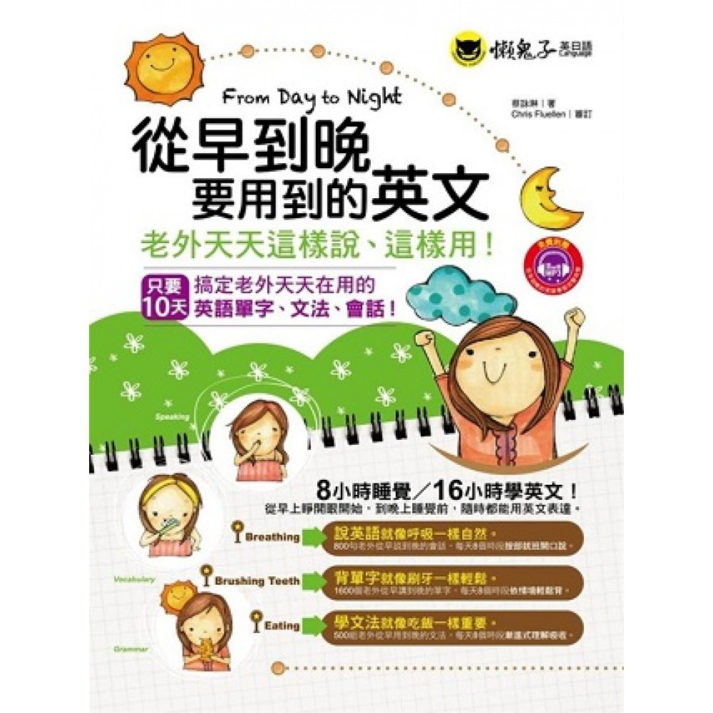 如果, 從早上到晚上都在說英文, 英文想學不好也難! 如果, 把老外從早到晚要說的英文都學會, 你從此就不用再害怕說英文! 學英文最有效的方法,就是營造良好的學習環境。 每天從早說到晚,英文當然會進步! 看這本《從早到晚要用到的英文》, 只要10天, 就能搞定老外天天在用的英語單字、文法、會話! 8小時睡覺,16小時學英文! 從早上睜開眼開始,到晚上睡覺前,隨時都能用英文表達。 說英語就像呼吸一樣自然。 800句老外從早說到晚的會話,每天8個時段按部就班開口說。 背單字就像刷牙一樣輕鬆。 1,600個老外從早講到晚的單字,每天8個時段依情境輕鬆背。 學文法就像吃飯一樣重要。 500組老外從早用到晚的文法,每天8個時段漸進式理解吸收。 8時段輕鬆學習,10天搞定老外生活會話。 第1天:學會「點餐、搭訕、讚美、自我介紹」相關用語 第2天:學會「買衣、買鞋、折扣、付款、退換貨」相關用語 第3天:學會「化妝、髮型、婚禮、喜宴」相關用語 第4天:學會「安排見面時間地點、談論家庭背景、談論興趣」相關用語 第5天:學會「談論約會、約會出遊」相關用語 第6天:學會「問候、談論發展」相關用語 第7天:學會「戶外運動、騎腳踏車、打球、上健身房」相關用語 第8天:學會「感冒、發燒、看醫生」相關用語 第9天:學會「做家事、居家活動」相關用語 第10天:學會「驚喜、派對、慶生」相關用語 【使用說明】 1.10大主題,10天學會 將老外最常用的生活會話歸類為10大主題,並規劃成10天的學習進度。跟著書中主角一起度過這精采的10天,你將發現──自己的英文能力變好了。 2.8時段會話學習 從早上7:00開始,每兩個小時學習10句會話。一天下來,80句會話都能朗朗上口。只要10天,就能輕鬆搞定800句常用會話。 3.8時段單字學習 學會話的同時,別忘了掌握句中的關鍵單字。書中每句會話下方都列出2-3個重點單字,清楚標註詞性及中文解釋。熟記並活用這些單字,英語能力將加倍提升。 4.8時段文法學習 根據每單元的情境會話,延伸補充數則相關文法說明。透過書中生動、有趣的句子,所有文法規則都變簡單了。從此不用再死記硬背,自然而然學會文法。 5.學習進度時間軸 利用「從早到晚學習進度時間軸」,掌握一整天的學習進度。提醒自己盡量按照進度學習,才能在10天之內達成目標。 6.聽MP3強化記憶 利用本書附贈的老外正統發音MP3同步學習。聽外籍老師朗讀書中會話,不但能學會最標準的美式發音,更有助於強化記憶,加深對句子的印象。 7.圖像式聯想學習 生動活潑的精美插圖,能有效引發學習動力,且有助於創意聯想。情境與圖像的結合,讓學習效率倍增。 8.8時段分色呈現 以8種顏色分別呈現8個時段的學習內容,清楚明瞭、便於閱讀。