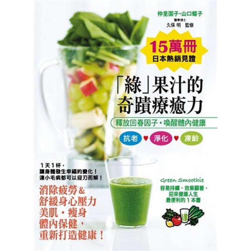 你的身體總是不斷有小毛病, 想要消除疲勞&舒緩身心壓力 美肌‧瘦身‧體內保健,重新打造健康嗎?! 原來你欠缺的,就是1杯滿載各種抗老元素的綠色蔬果汁。 只要照著本書1天1杯,就能讓身體發生幸福的變化, 是迎來健康人生最便利的1本書! 本書特色 ★日本銷售15萬冊的見證!多數的讀者表示,比起一般的蔬果汁書籍,不容易入門,也更美味、容易飲用。 ★製作綠色蔬果汁不但簡單,而且每篇的作法都附有完整清楚的食材及份量圖片,是事前準備的超級好幫手! ★利用書中介紹的黃金搭配組合法,善用「基本」+「酸味」+「甜味」+「季節」的方式來選擇蔬果,就可以做出美味的綠色蔬果汁! ★綠色蔬果汁的比例調配,還可依個人狀況從「新手蔬果汁」、「標準比例蔬果汁」、「進階蔬果汁」、「超級蔬果汁」來選擇符合自己能接受的蔬菜及水果的使用比例。 ★書中所使用的蔬菜及水果,不只有個別介紹處理方法,也在附錄處整理出各個蔬果含有的營養素及功效,讓選用時更能對症下藥。 在自然界的蔬果中,含藏了各種優秀的抗老成分, 而你1天只需要這1杯美味、容易入口的綠色蔬果汁, 即能不費心力地,將所有健康元素一網打盡! ◎ 範例1-保健蔬果汁: [西洋芹+無花果+葡萄柚+香蕉] 想要把握預防癌症,就是要補充足夠的膳食纖維!的關鍵 ◎ 範例2-美體蔬果汁: [明日葉+蘋果+覆盆莓+奇異果] 藉由豐富的膳食纖維,一邊幫助身體排毒一邊瘦身! ◎ 範例3-養生蔬果汁: [油菜+紅肉葡萄柚+草莓+酪梨] 富含維生素B群的酪梨,是天然的保養品!