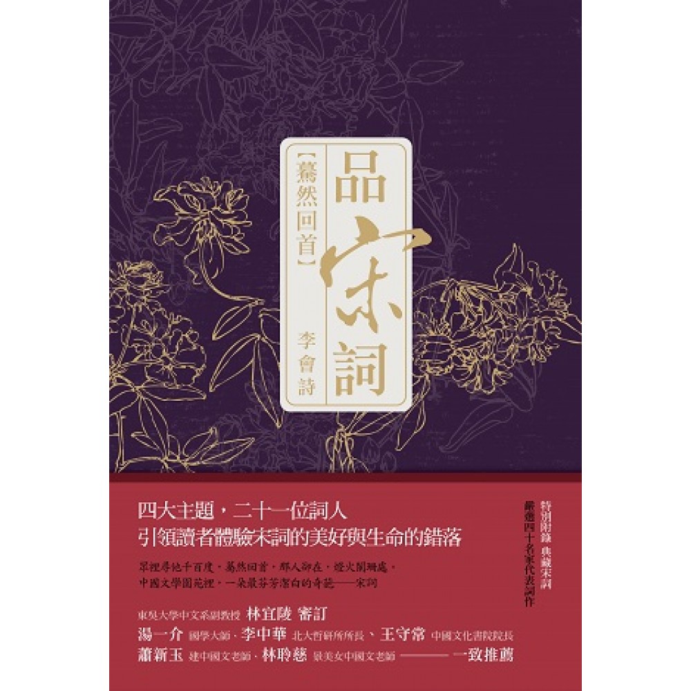 四大主題,二十一位詞人 引領讀者體驗宋詞的美好與生命的錯落 眾裡尋他千百度,驀然回首,那人卻在,燈火闌珊處。 中國文學園苑裡,一朵最芬芳潔白的奇葩──宋詞 品味詞人生命與作品交會的心靈片刻 ※特別附錄※ 典藏宋詞:嚴選四十名家代表詞作 【古典和現代的交會】 以簡單淺顯的文字,引領現代讀者進入美妙的宋詞世界。 【詞作與生平的融合】 精選詞家結合生平與作品,勾勒出具有生命感的詩詞賞析。 【感傷卻圓滿的體悟】 描繪時代榮衰底下,作家生命關鍵轉折,為讀者開展一趟心靈旅程。 莫聽穿林打葉聲,何妨吟嘯且徐行。竹杖芒鞋輕勝馬,誰怕?一蓑煙雨任平生。 料峭春風吹酒醒,微冷,山頭斜照卻相迎。回首向來蕭瑟處,歸去,也無風雨也無晴。 蘇軾〈定風波〉 佛家的淡然境界是蘇軾的為人之道,他深諳月圓月缺是自然之理,無可避免,所以人生的盈虧自然也是隨緣而至的好,回首前塵,恍如隔夢,強求又能如何? 春漲一篙添水面。芳草鵝兒,綠滿微風岸。畫舫夷猶灣百轉。橫塘塔近依前遠。 江國多寒農事晚。村北村南,穀雨才耕遍。秀麥連岡桑葉賤。看看嘗麵收新繭。 范成大〈蝶戀花〉 在清麗的水鄉春景中怡然自得,歷史的畫卷慢慢舒展,人生一蹉跎,便是垂垂老矣。遠方的落日有著餘暉暖暖的溫度,播撒人間。 驀然回首,尋訪帝王美人、隱士名臣詞人生命中的轉折時刻 李煜 一個缺乏政治細胞的帝王,卻是個備受推崇的詞人:他以深情訴說「剗襪步香階,手提金縷鞋」的幽會場景。感性如他,想起遭受宋朝軟禁的弟弟從善,不禁寫下「離恨恰如春草」的溫情。當鐵騎兵馬襲來,「教坊猶奏別離歌,垂淚對宮娥」吐露了身在帝王家的無奈,日日重覆「多少恨,昨夜夢魂中」的悔恨。經歷過繁華與破滅,他真正想要的,其實只是「萬頃波中得自由」的平凡。驀然回首經典詞人名作,讓宋詞的芬芳重新綻放。