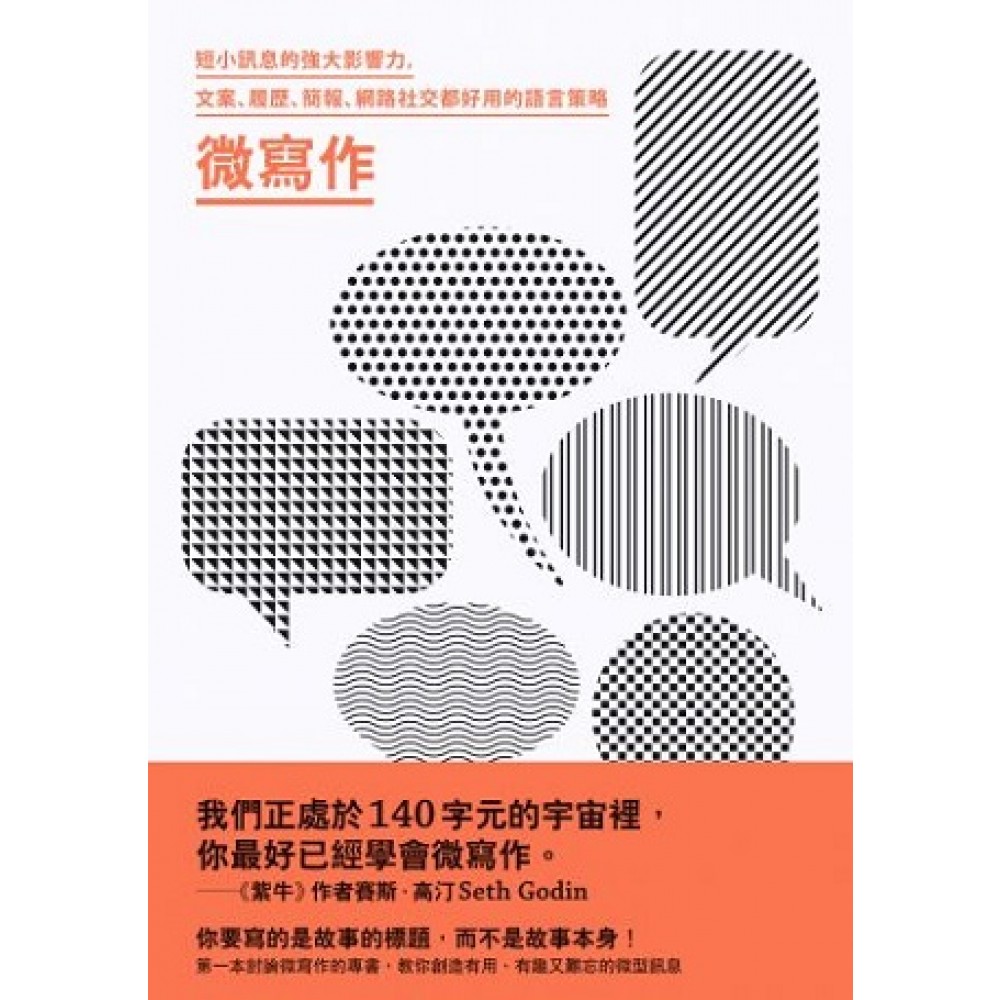 你要寫的是故事的標題,而不是故事本身! 第一本討論微寫作風格的專書,教你創造有用、有趣又難忘的微型訊息 140字微網誌、6個字的微小說、3分鐘的微電影…… 微寫作風潮來襲 你是否注意過:內容簡短的電子郵件會比較快獲得回覆?帶著機智妙語的網路貼文,往往能吸引較多人按讚?你是否想像過:好萊塢電影製片如何用兩三句故事大綱挑選劇本?在電梯裡遇到金主時,如何用一句話說明自己的創業構想? 科技進步促成的新溝通模式,引發注意力戰爭,也開啟了微寫作風格時代。我們每天無論發布臉書動態、簡訊、部落格標題,或寫下email主旨、簡報內容、拍賣文案、產品名稱,都是希望達成有效的溝通。若想要讓人覺得訊息難忘有趣、甚至之後還會不斷重複使用這個訊息,我們必須學會寫的更短、更巧。 品牌專家強森在本書統合文法結構、品牌行銷、認知科學、網路理論等領域,全方位介紹「微寫作」的語言藝術。所謂的「微」,既是寫作長度變短,也是書寫變得非正式、生活化;不僅僅是訊息簡短,也包含了生活中各種小而私密的寫作情境。過去,微寫作風格是專家(詩人、廣告文案、政治公關)獨有的能力,現在,任何一位想要掌握口語注意力經濟的人,都必須懂得這種網路時代的修辭學。 強森以語言學為基礎,舉出新聞標題、廣告文案、產品名稱、推特貼文為實例分析,說明如何從意義、語音、結構和社交情境下手,把握「簡單易懂」(「解你的渴」)、「啟動情緒開關」(「因為你值得」)、「巧用譬喻」(「人生是趟旅程」)等語言策略,創造微寫作風格。讀者可從中明白微寫作的底蘊及層次,像詩人一般掌握語言藝術和語言趣味。