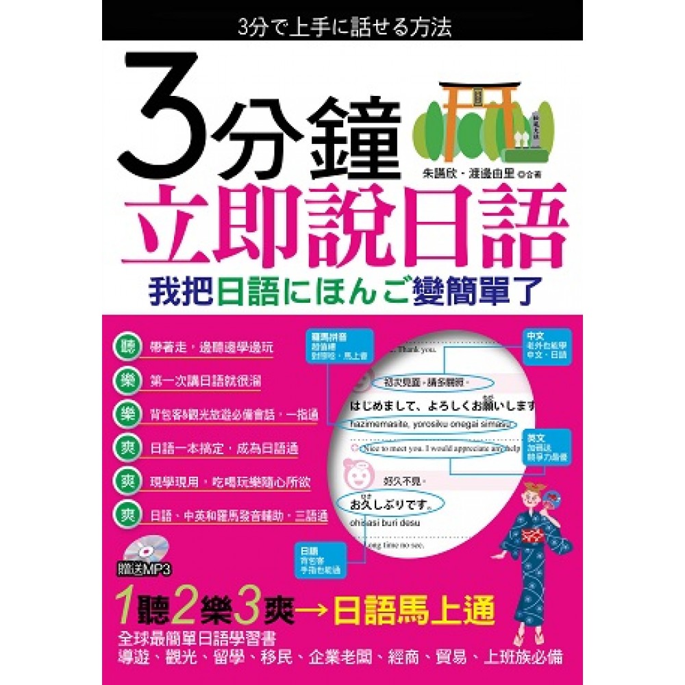 輕鬆學日語【行前磨槍篇】 第1章 交新朋友第一步 你一定曾經在各種場合做過自我介紹,除了姓名之外,你通常如何描述自己呢?先準備一段生動活潑的自我介紹詞吧!保證會讓每個初識的人都對你印象深刻喔!說不定還有機會帶來一段美好的友誼呢! 自我介紹 噓寒問暖 介紹家人 個性、興趣閒談 第2章 基本用詞先記住 學習任何一種語言,先學會這些基本的用詞,就能善加運用與變化,還能隨時隨地舉一反三。而數字、時間、星期、月份等,總共就那麼幾個詞,而且用法千年不變,把它們記到腦袋裡,就可以有備無患囉! 數字 星期 月份 時間 人稱代名詞 一般稱呼 方向 第3章 觀光旅行必備語 想到要出國旅行,心情快飛起來了,但行前功課做了沒呀?有沒有去查詢相關的旅遊資訊?有沒有準備幾句隨時要派上用場的詢問語呀?有沒有預先瀏覽當地的地圖呀?有沒有學會打電話報平安的方式呀?現在趕快準備,還來得及啦! 旅客服務中心 看地圖、打電話 請求幫忙 第4章 意外狀況會應付 儘管已事先做好旅行計畫,也認真研究了交通及食宿等資料,甚至規劃了景點參觀路線圖,但旅途中還是可能發生大大小小的突發狀況,我們當然希望每個人出門旅行一路平安,但爲了做好萬全的準備,還是現學一些可以隨機應變的語句吧! 問路 身體不舒服 遇到麻煩 警察局報案 輕鬆學日語【現學現用篇】 第5章 陸海空交通工具 到日本旅遊最有趣的事情之一就是可以搭乘各式各樣的交通工具,包括載客量龐大的地鐵、電車、巴士、新幹線、計程車和客輪。方便的大眾運輸系統也是日本旅遊觀光業歷久不衰的主因,每個遊客都可以靠著四通八達的交通網絡,輕易到達想去的地點。 在機場 搭飛機 往來機場和飯店 搭地鐵 搭巴士 搭計程車 搭客輪 搭新幹線 搭電車 租車 第6章 舒適休息住飯店 日本的住宿飯店大致可分為都市酒店、商務酒店、度假酒店、溫泉旅館(日式)、普通旅館、民宿、公寓式酒店等不同形態。日本飯店至今未採用世界通行的星級制,通常是按投資規模、設施、服務及知名度來劃分,並以住宿客人的口碑為基準。 預約訂房 住宿登記 享受飯店服務 客房服務(詢問) 客房服務(抱怨) 退房 第7章 吃香喝辣美食通 日本料理的多樣化名聞世界,宴席料理、壽司、生魚片、天婦羅、雞肉串燒、牛肉壽喜燒、日式甜點、拉麵、鰻魚飯及煎餅等,用餐氣氛與菜式選擇各具特色,任何時候都會有意想不到的驚喜。趕快擬好美食計畫吧!相信你的口腹之慾已經開始蠢蠢欲動了。 吃壽司 到餐廳 享受平價美食 下午茶 吃海鮮 吃甜品 居酒屋 第8章 血拼敗家真過癮 到日本血拼,一定能滿足你的購物慾望,各種不同的購物商場和方式也能提供最豐富精采的購物享受!不過購物前最好多走幾家商店,比較價錢,摸清市場價格,購物前最好先問清楚價格,以免花錢買氣受喔! 大拍賣 買東西 兌換錢幣 訂做衣服 手工藝品尋寶 逛廟會 第9章 展覽表演看不完 日本是亞洲觀光的熱門景點,除了國際會議與各種展覽之外,也經常舉辦世界級的盛事活動,包括表演藝術、體育活動、百老匯演出、節慶活動,以及由國際世界級大師演出的音樂會。對藝術文化表演有興趣者可上網查詢更多表演藝術的資訊。 過新年 耶誕節 展覽館 藝術表演活動 日本生活 第10章 休閒娛樂好去處 旅遊日本除了欣賞自然美景,還要看日本人如何玩樂、如何享受多采多姿夜生活。日本有很多動物園,如富士野生動物園、群馬野生動物園等。日本是海洋國家,得天獨厚擁有世界最大和最多的水族館,東京臨海公園、大阪海遊館、沖澠美麗海等。 東京迪士尼樂園 賽馬小賭 Fans追星 一日遊行程 看電影 水族館