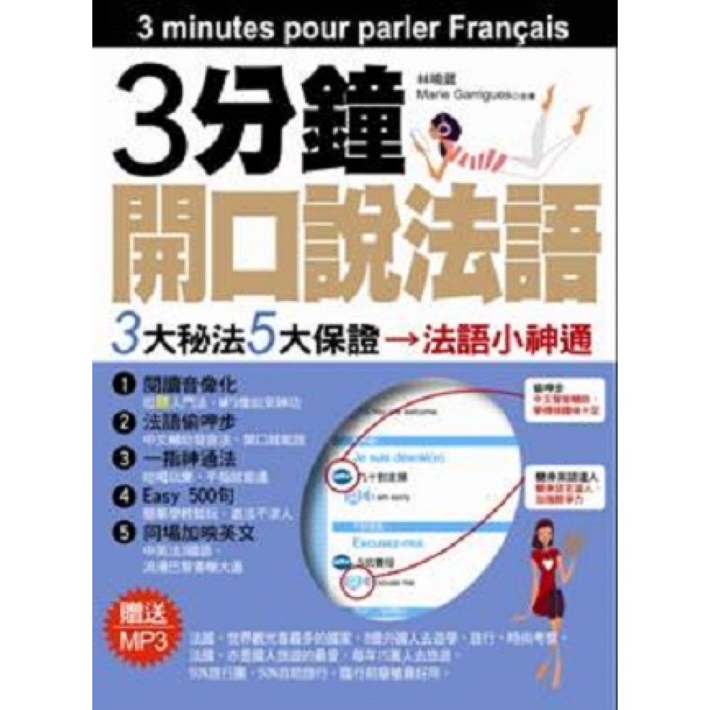 <本書特色> 巴黎,領先世界的流行時尚之都,有8億外國觀光客,每年有4000萬觀光客,其中有15萬是台灣人。50%參加旅行團,50%自助旅行。到法國遊學,觀光考察,首要就是學會法語。 3大秘法 5大保證 一學就會 1. 閱讀音像化 從「聽」入門法, MP3有如神助 2. 法語偷呷步 中文輔助發音,開口就能說 3. 一指神通法 吃喝玩樂,手指就能通 4. Easy 500句 簡單學輕鬆玩,遊法不求人 5. 同場加映英文 中英法3國語,浪漫巴黎香榭大道