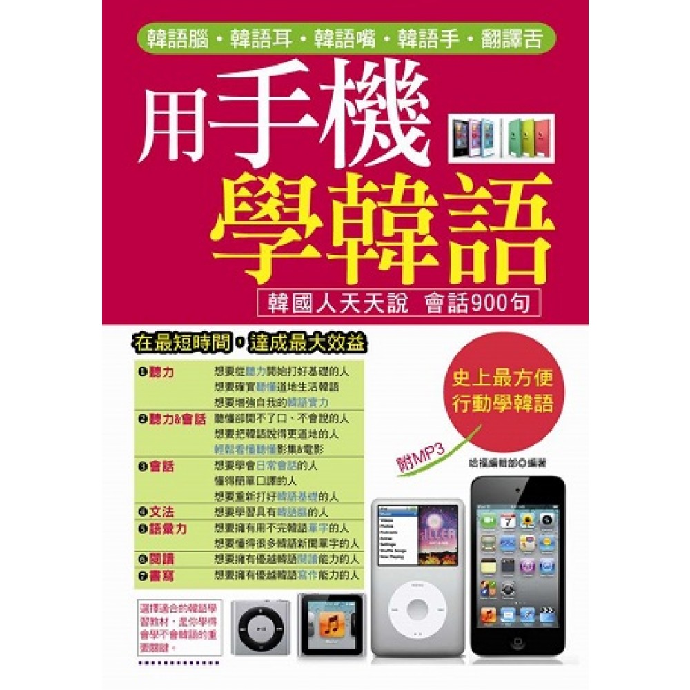 《用手機學韓語:快速練就韓語腦.韓語耳.韓語嘴.韓語手.翻譯舌(附MP3)》 選擇適合的韓語學習教材, 是你學得會學不會韓語的重要關鍵 韓國人天天說---會話900句 在最短時間,達成最大效益 1.聽力 想要從聽力開始打好基礎的人、想要確實聽懂道地生活韓語、想要增強自我的韓語實力 2.聽力&會話 聽懂卻開不了口、不會說的人、想要把韓語說得更道地的人、輕鬆看懂聽懂影集&電影 3.會話 想要學會日常會話的人、懂得簡單口譯的人、想要重新打好韓語基礎的人 4.文法 想要學習具有韓語腦的人 5.語彙力 想要擁有用不完韓語單字的人、想要懂得很多韓語新聞單字的人 6.閱讀 想要擁有優越韓語閱讀能力的人 7.書寫 想要擁有優越韓語寫作能力的人 史上最方便●行動學韓語 <<用手機學韓語>>9大優點── 優點1 方便攜帶、滿足你學習的需求。 優點2 中韓文與聲音結合在一起,雙效合一,一次幫你搞定。 優點3 把握零碎時間,讓你隨時隨地練韓語。 優點4 韓語一次慢唸;一次快唸,再加中文,存在手機裡,可以跟著老師的語調,走到哪學到哪。 優點5 書本、MP3不再各自為政,瀟灑、輕鬆地學韓語,你需要「用手機學韓語」。 優點6 只要隨時拿出手機,就能跟讀、跟聽、跟唸,3分鐘開口說韓語。 優點7 讓你隨時聽、隨時學,不會有攜帶課本的麻煩。 優點8 創造一個全韓語的環境,隨時隨地播放韓語。 優點9 跟著播放內容,隨時隨地講韓語。 適用對象 韓國投資、經商、移民、留學、遊學、上班、出差、觀光、導遊必備
