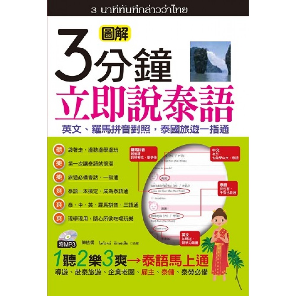 <<3分鐘立即說泰語-----英文、羅馬拼音對照,泰國旅遊一指通 (50K附MP3)>> 本書附有羅馬拼音,英文、泰文、中文三國語對照,學習非常輕鬆,是全球唯一最佳泰語學習書。 【重點內容】 旅遊泰國必備會話,一指通, 英文、泰文、中文、羅馬拼音對照,學習真輕鬆, 旅遊泰,一本搞定,袋著走,邊聽邊學邊玩, 現學現用,隨心所欲吃喝玩樂。 泰國有很多華人,大部份是潮州人,所以泰語很多發音都和台語很像,我們學泰語就輕鬆多了。