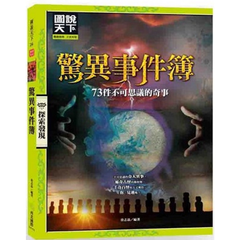◎不可思議的奇人奇事 被雷電追殺的家族 我們身邊的「發電人」 超級記憶女王 愛吃石頭的女子 生吃活蠍三十年 松毛蟲大餐 半人半樹的印尼樹人 奇特的「珊瑚人」 深山冬眠二十二天的人 神奇男子一覺睡兩年 二十七年死而復生數十次 他的肺裡長出了冷杉樹 一把頭髮拉動18 噸大船 鉛筆插入腦中五十五年 英國軍官從高空墜地大難不死 「蝙蝠俠」大鬧白金漢宮 俄羅斯的「火星男孩」 印度的百人大家庭 被水葬十一年後歸來的男孩 姑侄四人都是雙性人 我的老婆是條金魚 被搬走的別墅 ◎神祕莫測的地球祕境 突然消失七十七天的沌湖 尼奧斯殺人湖 神祕變臉山坳 能當放大鏡的古井 恍若神話場景的水晶洞 上坡容易下坡難的「怪坡」 神奇「喊水泉」 令人望而卻步的死亡谷 各式各樣的神奇洞穴 千奇百怪的島嶼 復活節島的石像從哪裡來? ◎稀奇古怪的動植物 吃肉的豬籠草 會走路的樹 馬達加斯加「食人樹」 一箭封喉箭毒木 美麗謀殺犯─日輪花 辣走魔鬼的超級辣椒 「臭」名遠揚的霸王花 樹木殺手 刀槍不入的俄羅斯「神木」 一開花就自殺的棕櫚樹 植入晶片的仙人掌 植物中的縱火犯 集體自殺的鯨魚 不撞牆壁不回頭的鳥群 窮追猛打的殺人蜂 吃掉一支軍隊的行軍蟻 能看到死神的貓咪 消失千年的「汗血寶馬」 袋鼠也講計劃生育 神奇的「魚醫生」 敬業的超市狗店員 世界上最有錢的寵物 ◎千奇百怪的風土民情 禁止男子進入的女兒國 童話王國的奇特婚俗 令人心驚膽顫的西班牙節日 在保加利亞休妻與售妻 德國的浪漫婚俗 努爾族女人也能娶妻 扎壩人的走婚 女人嘴裡能撐盤 袖珍民族的幸福生活 樹上旅館一住變女王 貝寧寡婦節 到緬甸約會長頸女 打夫節上打夫趣 怪異風俗集中營 骷髏滿街跑的墨西哥亡靈節 另類的美洲新年 巴西與眾不同的情人節 詭異的死亡之路
