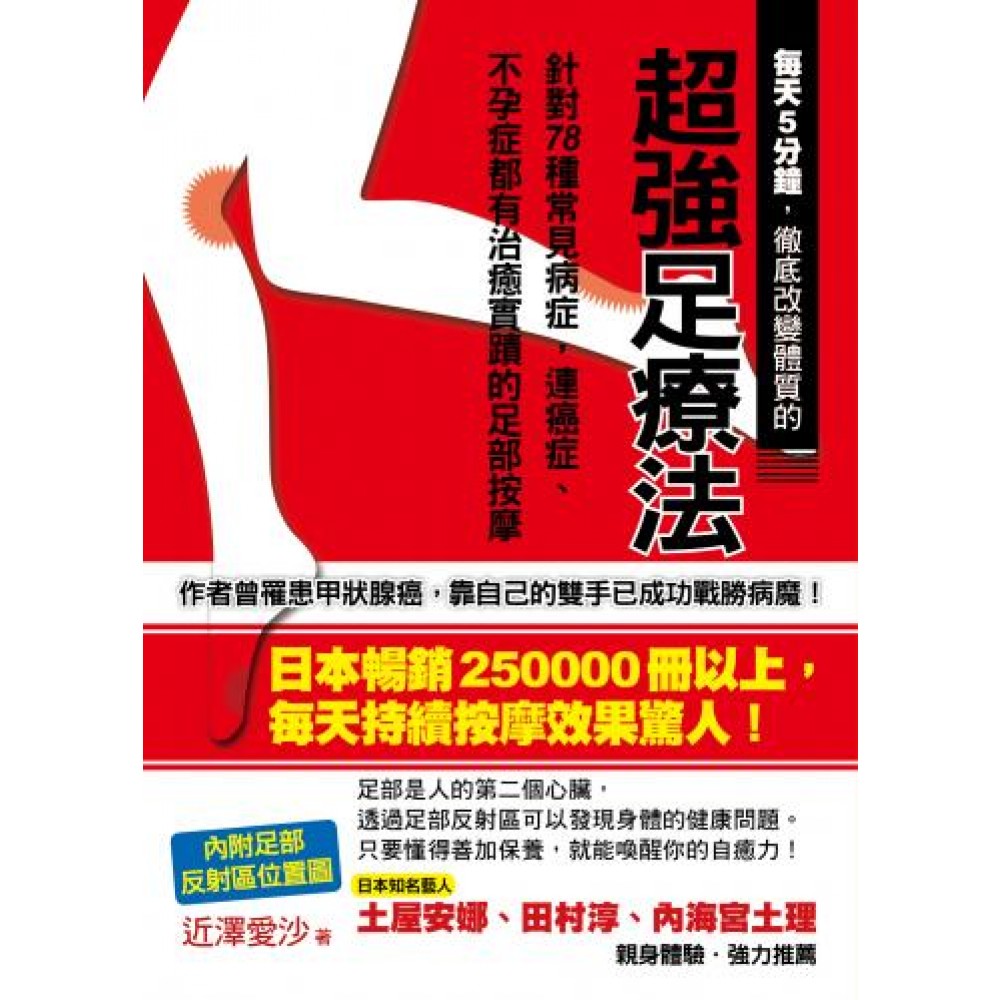 前言 世界第一痛的足部按摩魅力 *1田村淳 *2土屋安那 第1章 按摩為什麼會痛呢?Ohana足部按摩的魅力 Ohana足部按摩的魅力 推薦Ohana足部按摩療法的理由-只能仰賴他人的健康保健方法……好像有點不切實際呢? 自己治療癌症 儘快治好香港腳!否則小心癌症上身 厚繭、雞眼都可以用足部按摩來治療 第2章 開始足部按摩前,要知道的規則、準備、注意事項 足部按摩為什麼會痛呢? 了解足部反射區 準備按摩棒、乳液,以及最後要喝的溫開水 足部按摩的遵守事項-「要先了解這些事情」 按摩最常出現的症狀,以及沒有效果的原因 按摩時的姿勢~學會它,就萬事OK了~ 按摩棒的拿法 按摩方法示範 關於東方醫學 找出做足部按摩的最佳時機吧! 每天都按摩這些部位吧! 與按摩方法有關的問題 第3章 實踐!改善每天的不適 肩頸僵硬 腰痛 便祕 頭痛 早上賴床 受傷所造成的膝蓋疼痛 COLUMN 推薦的小道具○1「足部按摩機」 第4章 實踐!面對疾病 Ohana戰勝疾病~西洋醫學醫師對足部按摩療法的看法~ Ohana體驗者的告白○1○2 高血壓 糖尿病 心臟疾病 讓臥病不起者恢復元氣 癌症的發現與後續照顧~用足部按摩克服癌症~ 用足部按摩預防癌症的發生 診斷出罹患癌症的話,請按摩這裡吧! 肺癌 甲狀腺癌 乳癌 攝護腺癌 白血病 COLUMN 推薦的小道具○2「瑪瑙按摩板」 第5章 改善婦女身體方面的不適! 不孕治療100%實績~靠自己的努力懷孕~ Ohana體驗者的說告白○3○4 只有一條輸卵管、精子數量不足、有子宮肌瘤等也能夠懷孕!~但要先戒掉高跟鞋~ 因婦女病煩惱的話,請先試著按摩這裡吧! 經血變少~千萬不要覺得這樣比較輕鬆~ 用自己的手來增加經血流量 生理痛、生理不順 不孕症 子宮肌瘤、子宮頸癌 COLUMN 推薦的小道具○3「螃蟹夾」 第6章 改善過敏和小孩子的足部按摩 用足部按摩打敗過敏症狀吧! 異位性皮膚炎是一種疾病嗎? 有異位性皮膚炎或是蕁麻疹等皮膚問題,請按摩這裡吧! 異位性皮膚炎 花粉症 小孩子的疾病,3歲之前是關鍵期 小孩子的足部按摩 COLUMN 推薦的小道具○4「足踏板腳底按摩踏墊」 第7章 克服心理障礙 身體舒服,心情也會變輕鬆 陰陽協調,就能治好心理疾病 憂鬱和焦慮 有了它一切搞定!症狀別反射區表 後記
