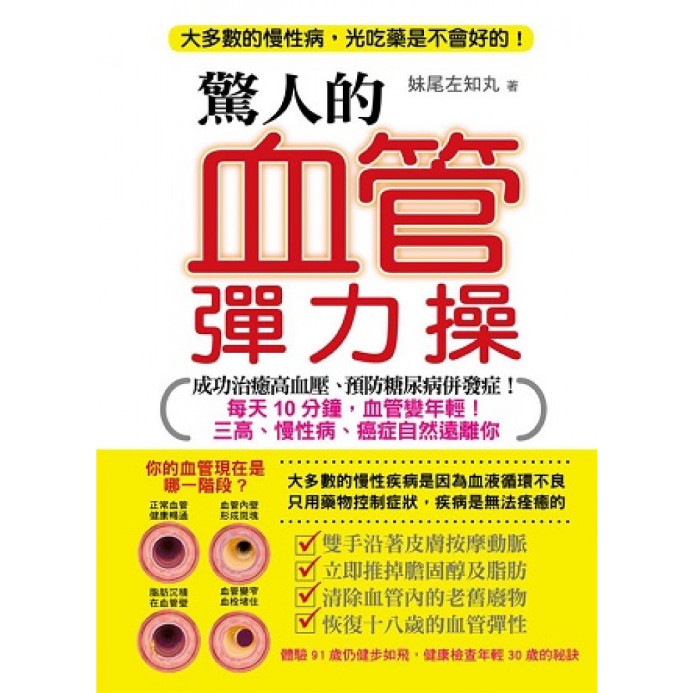 《驚人的血管彈力操:每天10分鐘,血管變年輕!三高、慢性病、癌症自然遠離你》 【獨家公開】恢復18歲血管彈性的祕訣 妹尾教授曾任國際細胞生物學會會長、日本重井醫學研究所名譽所長,長年鑽研血液和血管研究,認為血液循環正常才是從細胞年輕起來的祕訣!想消除慢性疾病的病根必須從恢復血管彈性做起! 我們可使用外力來刺激分布於動脈表面的血管擴張神經,讓它變活躍;那麼被刺激的動脈就會擴張,血液就會流往此部位的肌肉。以「血管按摩」來替代運動,促使血液循環順暢,進而使細胞活躍而變年輕。 心肌梗塞、腦中風、高血壓、糖尿病等疾病,導致血管硬化、堵塞或破損,以至於阻斷了補充血液的管道,讓營養和氧氣無法輸送至細胞。也就是說,細胞是因為血液循環太差,導致養分和氧氣不足而死亡的。所以,人只要讓血液循環保持暢通,確實提供細胞氧氣和營養,就能保持健康! 我們只要沿著皮膚按摩動脈血管,運用「血管按摩」所教學的正確手勢,就能輕鬆推掉血管壁上的膽固醇與脂肪,清理血管內積存黏著的老舊廢物,讓血管恢復18歲時的彈性!。 【全民體操】一起來做「血管彈力操」! 推掉膽固醇及脂肪、刺激血液循環、恢復18歲時的血管彈性。 「血管按摩」的方法,造福許多慢性疾病患者和想要變年輕的人們。妹尾教授20年以來每日實踐血管按摩,身體的老化現象通通消失了,如:低血壓、膽固醇過高、視力模糊、耳鳴、臉部皺紋等情形,健康檢查時比實際年齡年輕了20歲! 「血管按摩」的動作毫無難度,一日只需10分鐘,照著書中的圖解血管彈力操,擴張動脈刺激血流,推掉附著於血管的膽固醇和脂肪。對於高血壓患者2~3星期便能感受到血壓回復正常值、也能有效預防糖尿病併發症、舒緩類風濕性關節炎,以及避免血管阻塞造成中風。 一旦血液循環順暢,你就會感到身體產生驚人的效果。就像早晨起床就要洗臉刷牙,請養成每天實行血管按摩的習慣,這樣持續做下去,不但能夠恢復年輕時的血管彈性與血液循環力,年輕一、二十歲也不是夢想了。 本書特色 (一)血管按摩創始NO.1,回到18歲的青春彈力 妹尾教授研究病理學時,發現血液暢通與細胞新生的關係,進而研發出最有效、最容易實行的血液循環法──血管按摩。能夠透過物理刺激血管,恢復18歲的血管彈性。 (二)用血管按摩擴張動脈刺激血液循環 「血管按摩」能夠擴張動脈,加速血液循環。一旦血液循環好,血液確實攜帶氧氣和養分補充給身體所有的細胞,就能加快細胞汰舊換新的速度,並提高身體的自癒力。 (三)血管按摩改善三高、慢性病及癌症 從「恢復血管彈性」及「促進血液循環」真正根除慢性病!只用藥物控制疾病症狀是無法痊癒的。血液循環變好,就能夠有效預防改善高血壓、糖尿病、類風濕性關節炎等慢性疾病。 (四)從再生新細胞變年輕,打造水嫩Q彈肌、健康無病的身體 不必再塗塗抹抹那些可能有安全問題的保養品,抗老需要從細胞層面來思考!只要讓每一個細胞都健康,身體不斷地再生新細胞,就能保持年輕。從現在起,用血管彈力操停止以下的老化現象──頭髮稀疏、長皺紋、視力減退、重聽、肩膀痠痛、手腳冰冷、腰痛、無精打采、自律神經失調。 (五)做血管按摩,輕鬆動!超有效! 一日10分鐘,適用任何人,不管任何時間,任何地方都能簡單進行。不用運動到上氣不接下氣,就能有運動一般的效果,訓練血管彈性,促進血液順暢,您即能容光煥發。