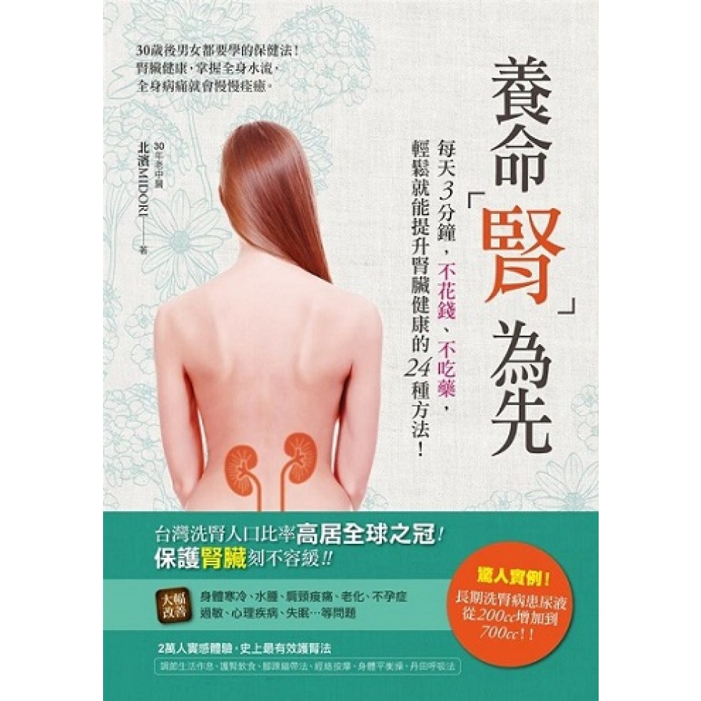 前言 腎臟健康,身體自然沒有毛病 ◎身體病痛並不是因為「上了年紀」! 「老是覺得很累」、「容易水腫」、「下半身冰冷」、「會暈眩」、「情緒容易低落」、「容易過敏」、「懶得動」──。 各位隨著年齡的增長,是否會經常感到身體不適呢?覺得「年輕時候明明不會這樣啊……」而嘆氣的人應該不少吧! 就算把不舒服的症狀告訴醫生,頂多也只是得到「沒辦法,因為年紀大了」的回答。而大部分的人也都信以為真,然後就直接放棄了。 每次遇到有這種想法的人,我都會感到非常可惜。 絕對不能把身體的不適輕易歸咎於「因為年紀大了」。 因為「永遠健康有朝氣」和「身體不適和衰退永遠不纏身」是有可能實現的。首先我想要讓各位知道──「只要確實執行對腎臟有益的健康法,就能遠離各種身體不適」。但我想一定會有人覺得「這怎麼可能」吧! 其實在中醫學中,2000多年以前就有一句很有名的格言「腎為先天之本」,意思是想維持健康,首先就要先從護腎開始。 在中醫學中,腎臟以及腎臟團隊(以中醫的陰陽五行說為依據,指與腎臟相關聯的臟器和構成物等集合體)被認為是生命最根本的場所。這是因為如果腎臟或是腎臟團隊的功能下降的話,身體就會出現各種不適或是引發疾病。 這世界上,為了消除身體的不適,充斥著各式各樣的方法,想要全部都執行當然是不可能的。 但是只要腎臟健康,就有可能達到這個目標。 先做個自我介紹吧。我是經過中國政府認可,擁有國際中醫師A級證照的中醫師。所謂的國際中醫師,是指通過由中國政府舉辦的國際考試,認可為「擁有與中國國內中醫師同樣程度和知識」的人。 我在至今以中醫的方式指導過許多人進行能提高腎臟功能的健康法,並且成功幫助他們消除身體上各種的不適。 ◎體內水分的代謝,是掌控健康的關鍵。 對身體來說,腎臟非常重要,是能夠掌控包括血液在內,體內所有水分流動的臟器。腎功能一旦衰退的話,體內水分就無法順暢流通,身體很快就會出現各種不適。因此,只要維持腎臟健康,那麼常發生在現代人身上的不適症狀自然就能獲得改善。 不論是中醫或是西醫,都認為提高腎臟功能就能讓體內的水分代謝變好。 我們身體有60%~80%是由水構成的。這些水分從外面進入體內,最後再排出體外。 我們稱這個流程為「水分代謝」,如果水分代謝不順暢,身體就會感到不舒服,還會加速老化。因此,水分代謝順暢,和我們的健康以及身體年齡息息相關。 此外,水分的代謝同時也決定了水分保持力(保水力)。保水力越高的皮膚,自我防禦能力(免疫功能)也會越好,健康狀態也會跟著變好。相反的,保水力低的皮膚,自我防禦能力也比較差,所以身體容易出現各種身體不適,而且也比較容易生病。 而且保水力越高,皮膚的彈性就越好,讓肌膚紅潤有光澤。就像嬰兒的體重有80%以上都是水分,因為擁有高保水力,所以嬰兒的肌膚非常柔軟又有彈性。相反的,年齡越大,保水力就會跟著減退,肌膚當然就會持續老化。 ◎能夠在早期就就將疾病擊退! 西方醫學會根據數據診療身體各部位。因此,主要都是以血清白蛋白值(ALB值。尿液檢查時,判斷腎功能是否正常的基準數值)等作判斷,如果沒有異常的話,就不會被判斷是「腎臟問題」。所以當出現了異常值後才會判斷「有問題」的西方醫學,非常容易錯失治療的最佳時機。 而相對的,中醫會從整體來觀察身體。因此即使特定的數據沒有異常,症狀尚未顯現於外的「未病」階段,還是能夠早期掌握各種症狀,並且採取因應對策。 此外,中醫能夠從全身流動的氣血(精氣和血液)通路上的穴道來做診斷,因此不只腎臟,還可以刺激腎臟團隊,讓腎臟功能活性化。 也就是說,西醫要在數據出來之後才會初步認定罹患了疾病,然後才會開始治療,而中醫則是在數據出來之前就能發現身體的異常,並且在早期就能治療疾病。 中醫學其實和我們的生活非常密切,有很多非常簡單就能自我改善身體狀況的方法。本書還介紹了雖然不受西方醫學重視,但事實上卻非常重要的能提高腎臟功 能的24種健康法。這是根據中醫學的概念,只要每天做3分鐘,任何人輕鬆就能做到的健康法,本書也會同時介紹許多實際成功的案例。 請從這24種健康法當中,選擇自己可以做到的,然後不要有壓力的去進行。下面是選擇時需要注意到的兩個重點: ○1從第三章~第五章的內容,各選一項以上來執行。 ○2「提高腎臟功能健康法○4能溫熱腎臟穴道的腳踝繃帶法」的效果非常好,請務必要試試看。 我身為中醫師,成功輔導過許多人的健康已經超過十年了。從我開始學習中醫學是在21歲的時候,至今研究中醫學已經超過30年。 本書是以我歷經三十年的研究成果說明。希望各位讀者能閱讀完後,能將中醫學輕鬆運用在日常生活中。 只要實踐提高腎臟功能的健康法,各位的身體一定會變得越來越有活力,身體不適的症狀也能獲得改善。 由衷希望本書能讓更多人「變更健康」。 北濱MIDORI 2013年四月