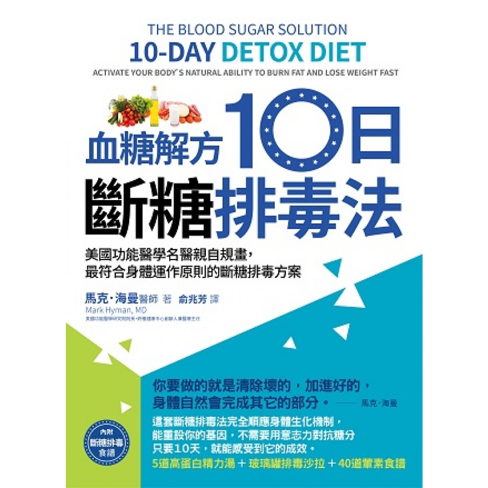 見證身體自癒能力的奇蹟! 風行歐美的馬克‧海曼醫師「血糖解方10日斷糖排毒法」, 這個方法完全以科學為基礎, 能重設你的基因,排出身體毒素,改善血糖, 即使對瘦身及健康已放棄希望的人, 只要10日,就能感受它驚人的成效 *內附5道高蛋白精力湯+玻璃罐排毒沙拉+40道葷素食譜。 ‧你要做的就是清除壞的,加進好的,身體自然會完成其它的部分。──馬克‧海曼 ‧「有史以來成效最快的飲食」出自海曼博士,紐約時報第一名暢銷書《血糖解方》作者──(女人世界) ☆紐約時報暢銷書排行榜No.1 ☆亞馬遜網路書店總榜No.1 ☆健康類排行榜No.1 美國功能醫學研究院院長、終極健康中心創辦人兼醫療主任 暢銷書《血糖解方》作者、前美國總統柯林頓御醫 馬克‧海曼醫師(Mark Hyman, MD)最新著作 血糖解方10日斷糖排毒法是一套完整的10日方案, 從進行準備、飲食計畫、營養補充、運動、排毒浴、深呼吸、自我健康檢測, 到和自己的內在連結,為自己設計一個健康的環境, 把這些組合起來,就是一套威力強大但執行簡單的健康計畫。 參與這個方案的人,平均10天瘦4公斤,各項身體檢驗數值都變得更好。 【10天應做清單】 ‧做各種測量和記錄結果。 ‧做三十分鐘運動。 ‧服用營養補充品。 ‧做早餐排毒精力湯。 ‧按照每日膳食計畫吃點心、午餐和晚餐。 ‧寫排毒日誌。 ‧練習數到五呼吸小憩五分鐘。 ‧泡終極排毒浴。 ‧七至八小時睡眠。 ‧一天至少喝八杯乾淨、濾過後的水。 ‧享受媒體齋戒。 【血糖解方10日斷糖排毒方案特色】 ※最科學、成效最快的健康方案,能幫你迅速排毒、改善血糖、重獲健康。 ※完整毒素測量問卷檢測自己當下的健康狀況,並瞭解自己體質改善的進度。 ※可以簡單動手做的5道高蛋白精力湯+玻璃罐排毒沙拉+40道葷素食譜 ※不限時地隨時可做到的數到5呼吸小憩+30分鐘快慢交替運動 ※一天一道課題,幫助你從身體到心靈,到與外在連結,打造全面的健康環境。 ◎滿足:改變飲食就能改變大腦化學,用真正的食物讓你身體獲得真正的滿足。 ◎排毒:放鬆、補充適當的營養品,能幫助你緩解斷糖排毒時可能發生的症狀。 ◎清空:清理腸道,加速排毒,幫助腸道恢復健康以成為重獲健康的基礎。 ◎運動:進行30分鐘快慢交替運動,效果會比長時間大量運動更好。 ◎傾聽:靜坐10分鐘,挖掘自己情緒的源頭,可以找出讓自己苛待身體的心理因素。 ◎思索:找出讓你不健康的想法,扔掉它們,專注在讓你實現夢想的想法上,這樣做的效果非凡。 ◎滋養:深呼吸、練習放鬆,可以刺激你的迷走神經,增加新陳代謝。 ◎設計:動手設計自己的健康環境,好的環境可以帶領你輕鬆走向健康。 ◎覺知:追蹤檢測自己的成果,成就感可以讓你更想堅持這樣的健康方案。 ◎連結:尋找願意和你共同進行健康計畫的同伴,同儕的力量比基因更大。 ‧我們必須學會治療病人,而不是疾病本身;我們要治療的是系統,不是症狀。這是個人化的醫學,也是未來的醫學。──馬克•海曼 【排毒見證】 ‧我希望你有很美好的一天,因為我有!我的能量層次提高很多,覺得可以做到任何自己下定決心想要做的事。在過去十天內,我的體重已經減輕了四•五公斤!──海倫•艾倫 (Helen Allen) ‧這完全改變了我的生活!很難相信在這樣短的時間裡,我已經減輕了多少贅肉。但更重要的是,我感覺比以前真是好太多了。我已經遭受多年的失眠之苦……現在終於能夠安心入睡,這真是無價的!──勞倫•克里克繆(Lauren Creekmur) ‧原來我是個無糖不歡的人,對我來說最難得的部分就是十二天不吃一點糖!我現在相信,當下定決心,用健康而妥善的方式對待自己的身體、心靈和精神,我可以不吃糖,讓身體變得更健康是可能的。 ──喬迪•布來登(Jodi Briden) ‧在過去的一年裡,我一直在與青春痘作戰。讓我萬分驚訝的是,經過這十天的斷糖排毒,我幾乎完全清除了面皰。對我目前的樣子和感受,我真是高興極了。──薩拉•弗萊施豪爾(Sara Fleischhauer) ‧很長一段時間我不曾這麼清醒。我不僅瘦身,更令我興奮的是感覺棒極了。──珍妮佛.勞倫斯(Jennifer Lawrence) ‧一個同事在我排毒飲食的第六天告訴我,我看起來不一樣了。我問他是怎麼個「不一樣」?他回答說:「你看起來光鮮亮麗。」這正是我想聽到的,知道排毒飲食真的發揮了效果。──費伊•史威特斯基(Fay Switsky) ‧多年來,我一直在憂鬱症之中苦苦掙扎。我曾經是一個有用不完精力的人,臉上充滿笑容,但隨著時間的流逝,那樣的我越來越難以見到。當我選擇嘗試十日斷糖排毒飲食,我知道這是自己重生的機會。排毒飲食之後,瘦了近五公斤,但更重要的是,重新找回以前的我。那個有著迷人外表的我又出現了,如同撥雲見日一般。海曼博士用了「活力」這個字來形容,對於經由排毒飲食而找回原來的我而言,真是最貼切不過了。──夏琳•萬能特(Charlene Wynant)