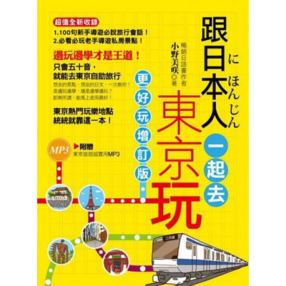 最好學又好玩的日文學習書,不僅能夠一邊旅遊,還能一邊學日文! 一本兩用!東京旅遊帶著它啪啪走, 不管到哪都能用! 更好玩增訂版超值全新收錄: 1. 100句新手導遊必說旅行會話 2.必看必玩老手導遊東京私房景點 從怎麼說到怎麼玩,為你全部打點! 邊玩邊學,還是邊學邊玩都不重要, 能立即使用才最實在! 隨書超值附贈東京旅遊超實用MP3 【本書特色】 耶!去東京自助旅行~可是……無法溝通?雖然有漢字,可是聽不懂有什麼用? 最實用的旅遊必會字句,課本沒教,旅遊書更不會教! 旅遊書 + 日文學習書,想去的景點、想說的日文,一次教你! ◎更好玩增訂版超值全新收錄 1. 100句新手導遊必說旅行會話 想要用最簡單輕鬆的方式自助遊東京嗎 ? 那就用我們諮詢旅行社的新手導遊後,為你特別整理準備的100句好用旅行會話, 讓你一路都能玩的順暢! 2. 必看必玩老手導遊關西私房景點 看膩了東京鐵塔、淺草雷門?想去點不一樣的地方嗎?我們也特別準備了資深導遊才會去的私房景點 ! 不管是購物、逛街、享用美食都能滿足你! █ 自助旅行出發!要去日本玩,就先從東京開始吧! 大家都喜歡去日本玩、更喜歡去日本自助旅行,可是怎麼玩才對?聽網路上以訛傳訛?還是購買價錢貴到嚇死人的旅遊書?日本人教你玩得最道地!哪裡一定要去,哪裡錯過可惜,快跟著小野美咲一起遊東京。 小野美咲發揮東京在地人的本性,一步步教你從成田機場到東京市區,還教你搭JR、東京都鐵,就跟一般日本人一樣搭車通勤。《跟日本人一起去東京玩—更好玩增訂版》一口氣告訴你在東京非去不可的觀光地點!血拼族必去的表參道、池袋、澀谷……;風景族喜歡的皇居、明治神宮、淺草寺……。只要去東京,就不容錯過的觀光地點! █ 跟團、自助總是無法選擇!?丟棄走馬看花的觀光方式,深入瞭解各景點,就從現在開始! 既然是自助旅行,就不要用跟團的方式玩東京!不要走馬看花,就跟著東京在地人一起去東京玩! 每次跟團,雖然有導遊講解觀光景點的趣事、歷史紀錄……,可是總覺得停留時間不夠久;自助旅行的時候,又覺得好像只是走馬看花,每次都無法瞭解這個景點名勝的歷史由來或是其他應該要知道的事。這些事困擾你很久了嗎?有了《跟日本人一起去東京玩—更好玩增訂版》就再也不用煩惱。 在進入每一個景點之前,都會先出現該景點的地點簡介、歷史來由或者是其他你應該知道的資訊。讓你在抵達每個景點之前,就可以先深入瞭解該地點的一切資訊,等各位到達景點之後,又能夠利用書中特地依照景點設計的會話、短句,立即溝通零困難! █ 不只要看得懂、聽得懂,還要會寫也會說!MP3 + 手寫練習,聽說讀寫樣樣行! 書上教了一堆又一堆,可是該用的時候,卻一點也用不上!?要自助旅行就先要做好萬全的準備!不要一直覺得英文到哪都會通!雖然英文是國際語言,但是事實上日本人還是對英文有點恐懼感。美咲說:「很多朋友來到東京,想要自己出去逛,認為說英文一定會通!可是常常回來都會抱怨遇到挫折!因為大多時候日本人聽得懂英文,但是他們還是會回日文!」因此,到日本旅遊最好的方法,就是不僅要會看、聽,最好還要會寫也會說! Part 2 20個在東京旅遊必去地點裡,除了介紹該地點的簡介之外,還會有在該地點必會的單字、超實用短句,美咲甚至還設計了情境會話內容!單字部份,設計了手寫練習格,想要藉此提高各位學習者的印象。如果再搭配上特別錄製的超實用短句和情境會話內容,讓你即使人在東京,MP3裡特別錄製的內容,也能隨身帶著走。不管到哪個景點,一時忘記該怎麼說那一句日文,立刻打開MP3播放器,就能夠立即運用!