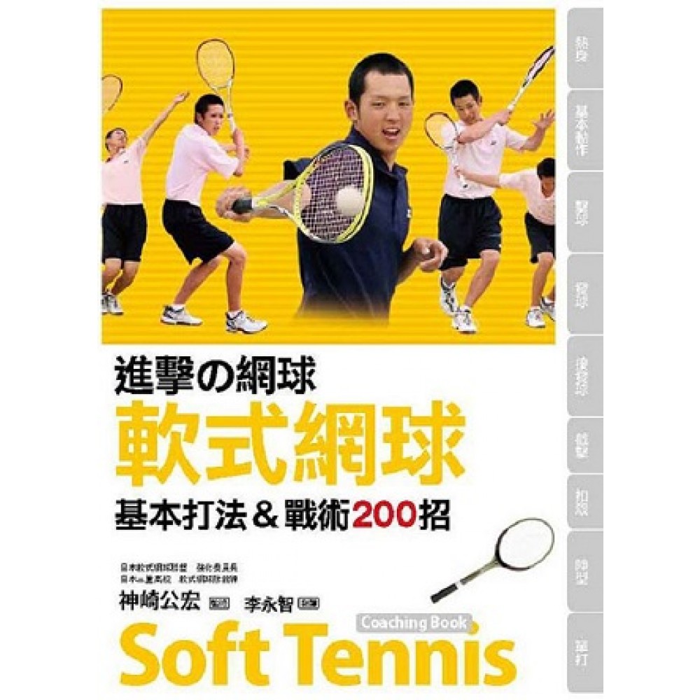 前言 以能永留在選手心中的指導者為目標 2 本書的使用方式 4 神崎式指導心得 6 指導者的條件 6 指導方針:指導的最終目的,是讓選手能自立自主 7 從改變自己做起 9 心、技、體、生活 10 勤做紀錄 11 陣型的重要性 12 單打的重要性 13 基礎知識<1> 14 基礎知識<2> 15 基本規則<1> 16 基本規則<2> 17 第1章 熱身運動 27 熱身運動的重要性 28 協調性的7種能力 30 身體的軸心與重心的位置 31 <練習MENU> MENU001 步行 32 MENU002 慢跑 32 MENU003 快跑 33 MENU004 腿部屈伸 33 MENU005 壓腿 34 MENU006 左右開腿 34 MENU007 前後開腿 35 MENU008 跨蹲 35 MENU009 壓肩 36 MENU010 肩胛骨活動 36 MENU011 對角線的肩胛骨活動 37 MENU012 弓步動作 37 MENU013側轉跨蹲(前轉・後轉) 38 MENU014 對角線的弓步動作 38 MENU015 前抬腿碰腳尖 39 MENU016 前後抬腿 39 MENU017 在發球線傳接球 40 MENU018 在底線傳接球 40 MENU019 移動傳接球 41 MENU020 接滾地球 41 MENU021 敏捷性訓練①基本姿勢(小碎步) 42 MENU022 敏捷性訓練②左右腳轉換 42 MENU023 敏捷性訓練③側向移動 43 MENU024 敏捷性訓練④跳躍 43 MENU025 敏捷性訓練⑤波比(Burpee) 44 MENU026 敏捷梯訓練①提腿 44 MENU027 敏捷梯訓練②弓步 45 MENU028 敏捷梯訓練③開腿跳躍 45 MENU029 敏捷梯訓練④左右跳躍 46 MENU030 敏捷梯訓練⑤交叉步伐 46 MENU031 敏捷梯訓練⑥In&Out 47 MENU032 敏捷梯訓練⑦左右步伐(小跨步) 47 MENU033 敏捷梯訓練⑧左右步伐(大跨步) 48 MENU034 敏捷梯訓練⑨前後步伐 48 第2章 基本動作 49 3種握拍方式 50 擊球的動作與待球姿勢 52 網前球的動作與待球姿勢 54 步法 56 <練習MENU> MENU035 西方式握拍法 58 MENU036 東方式握拍法與半東方式握拍法 59 MENU037 握拍時的使力方式 60 MENU038 交叉步法 61 MENU039 左右接球 62 MENU040 前後接球 63 MENU041 移動空揮 64 MENU042 耍球(右手/左手/雙手) 65 MENU043 交替打2顆球 66 MENU044 用3顆球耍球(上拋) 67 MENU045 用3顆球耍球(彈地) 68 MENU046 以牆壁反彈耍球 69 MENU047 在平衡板上耍球 69 MENU048 橫移拋接 70 MENU049 觸線折返跑 70 MENU050 衝刺折返跑 71 MENU051 放射狀折返跑 72 第3章 擊球 73 擊球的基本(側身擊球) 74 低手擊球 76 打高球與上升球 77 推打與拉打 78 攻擊性與防守性的高吊球 79 反手拍擊球(韓國式/上網型) 80 <練習MENU> MENU052 在呼拉圈裡空揮 82 MENU053 在呼拉圈裡擊球 82 MENU054 3種旋轉(抽球/切削球/切球) 83 MENU055 互打短球 84 MENU056 交替拉打與推打 85 MENU057 4種路線打5球 86 MENU058 6種路線的練習 87 MENU059 4點推打的練習 88 MENU060 攻擊性高吊球4點連打 89 MENU061 1對2高吊球練習 90 MENU062 1對3高吊球練習 90 MENU063 打上升球的基本動作 91 MENU064 打上升球練習①~一個彈跳接球~ 92 MENU065 打上升球練習②~向前移動揮擊~ 92 MENU066 網前球的反手拍練習① 93 MENU067 網前球的反手拍練習② 93 MENU068 底線球的反手拍練習① 94 MENU069 底線球的反手拍練習② 95 MENU070 反手拍打高球 96 MENU071 互打短的彈跳球 97 MENU072 於中間位置互打 97 MENU073 用兩手打短球 98 MENU074 接&傳① 99 MENU075 接&傳② 99 MENU076 同時接&擊球 100 MENU077 用氣球做雜耍動作 100 MENU078 迷你跳床①~180度旋轉~ 101 MENU079 迷你跳床②~90度旋轉~ 101 MENU080 迷你跳床③~邊旋轉邊揮拍~ 102 MENU081 迷你跳床④~邊旋轉邊擊球~ 102 第4章 發球 103 發球與旋轉 104 <練習MENU> MENU082 上旋發球 106 MENU083 平擊發球 107 MENU084 逆側旋發球 108 MENU085 低手切發球 109 MENU086 低手發球 110 MENU087 球的握法 111 MENU088 拋球練習①~舉杯~ 111 MENU089 拋球練習②~拋向目標物~ 112 MENU090 拋球練習③~拋球入籃~ 113 MENU091 手肘太低的矯正法 114 MENU092 東方式握拍練習①~用下臂投球~ 115 MENU093 東方式握拍練習②~身體扭轉投球~ 115 MENU094 東方式握拍練習③~手肘伸直遠投~ 116 MENU095 東方式握拍練習④~以球拍揮擊~ 116 MENU096 由下至上的揮拍動作 117 MENU097 從3個位置發球 118 MENU098 跪立發球 118 MENU099 右腳著地與左腳著地 119 MENU100 用網球打排球 120 第5章 接發球 121 接發球的重點 122 底線型選手的接發球 124 上網型選手的接發球 125 第一發球與第二發球 126 擊球與接發球的不同 127 <練習MENU> MENU101 上網型選手的接發球練習① 128 MENU102 上網型選手地接發球練習② 129 MENU103 設定比分的接發球 130 MENU104 以小碎步接發球 130 MENU105 擊出深的接發球 131 MENU106 高低擊掌 132 MENU107 用球拍與腳接球 132 MENU108 呼拉圈運球練習① 133 MENU109 呼拉圈運球練習② 133 MENU110 1個彈跳後接球 134 MENU111 不落地接球 134 第6章 截擊 135 跑動截擊 136 截擊的打法~拉打與推打 138 反手拍截擊 139 <練習MENU> MENU112 擊球過於用力的矯正法 140 MENU113 步法第1步的矯正 141 MENU114 步法的移動方式 142 MENU115 兩指握拍截擊 143 MENU116 拉打式正手拍截擊 144 MENU117 推打式正手拍截擊 144 MENU118 推打式反手拍截擊 145 MENU119 拉打式反手拍截擊 145 MENU120 手插口袋截擊 146 MENU121 左手扶拍截擊 147 MENU122 低截擊的基本動作 148 MENU123 單腳踩磚塊的低截擊 149 MENU124 低截擊由球拍發出的球 150 MENU125 低截擊由自己發出的球 151 進攻式截擊 152 <練習MENU> MENU126 以籃子練習進攻式截擊 153 MENU127 以進攻式截擊回擊強勁的球 154 MENU128 截擊3個方向的球 155 MENU129 趴在網上練習進攻式截擊 156 MENU130 抽擊式截擊的基本 157 MENU131 抽擊式截擊的練習 158 MENU132 截停球 159 MENU133 以截停球將球打入籃子 159 MENU134 4種路線的截擊 160 MENU135 2種路線的截擊練習 161 MENU136 反應式截擊練習 162 MENU