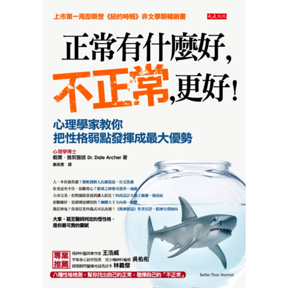 前言 大毛病做大事,正常人做「正常」的事 「醫生,我正常嗎?」 我是一個心理醫生,這個問題我已經聽過無數遍,多過你的想像。親朋好友、病患、點頭之交、甚至初次見面的人,都這麼問過我。在現今的世界,人們懷疑自己的想法、感受,甚至自己的行為,是否被認為是「正常」。 所謂的「正常」是什麼意思,正常到底有什麼了不起?我們在孩童時被教導說,每個人都擁有某些特殊才華和能力,使我們跟別人不同。如果正常是指跟其他人都一樣,人生有什麼樂趣呢?難道我們不應該選擇與眾不同,接受原來的自己嗎? 不過,談到心理健康時,我們仍會擔心: .我不時感到不耐煩,有時注意力不集中,這表示我得了注意力不足過動症嗎? .我自視甚高,喜歡別人注意我,我算是自戀狂嗎? .我偶爾會情緒波動,可能得了躁鬱症嗎? 對大多數人而言,這些問題的答案:才不是! 有些人格特質屬於正常性格,但表現到極端時,就可能是不正常,給人們造成麻煩,甚至需要心理診斷。這些是人們最擔心的特質,但這卻彰顯了每一個人的特色。這些特色有可能讓我們變得與眾不同,甚至身價非凡。 人人都有怪個性,只是程度不同 本書所談的八項特質都是最普遍且最具影響力的。重要的是,大多數人都擁有超過一個特質,甚至全部都有,只是程度不同。本書要讓你學會辨視主導你的是哪些特質,同時了解這些特質有可能會帶給你哪些麻煩。最重要的是,希望讓你學會:如何善用你的特質在有益的用途上。舉例來說: 你知道如何將自己的冒險天性,發揮在專注及生產力的用途嗎? 或者你總是忙東忙西,卻永遠沒做完一件事? 你是否無法控制自己的情緒波動?你可以把這股高昂的能量,轉化為生產力與創造力嗎? 你會焦慮嗎?焦慮驅使你採取行動或者讓你因為恐懼而動彈不得? 仔細檢視你的人格組合可能讓你震驚。起初,或許是自己不喜歡看到的弱點,這弱點可能讓自己擔心或使周遭的人──包括子女、配偶、朋友或同事擔心。或許會把自己當作是媒體常描繪的恐怖案例,看似正常人,結果「暴發」了。你開始考慮,或許自己應該接受精神評估、尋求治療,甚至吃藥,以壓抑你的完美主義;控制冒險的天性,或者用更合乎邏輯的做法取代天馬行空的想法,好讓自己「變得跟其他人一樣正常」。至少,變得更像你心目中所以為的正常人。 二十五年來,我一直和病患討論這些問題。我也會問自己這些問題,尤其是在人生與事業的轉捩點。我知道這並不容易,因為這通常需要改變,意思是你需要思索用新方式生存。很多時候,比較容易的做法是接受自己是「正常」的,而不想跨出大步,去接受真正的自我。 誤診,造成更多精神病 二十年前,人們只有真正麻煩大了,才會去找心理醫生。當他們嚴重憂鬱、瘋狂或是重度精神病,讓他們無法正常生活,心理醫生才會是最後的手段。 但現在,我有許多病患在我開始診斷時根本稱不上是「病患」。不是說他們沒有什麼問題,而是他們通常不需要治療或服藥。我記得一名病患在他的母親過世後沒多久就來找我。他覺得悲不自勝、黯然神傷且鬱鬱寡歡。我慣例提出一些問題。 「你睡得好嗎?」我問。 「嗯,我睡眠品質還可以。」 「那你的體力呢?」 「不錯。」 「你可以工作嗎?」 「當然,我每天都有去上班。我和老闆、同事的相處還不錯。」 「你的胃口還好嗎?」 「我的飲食沒什麼改變,」他嘆了口氣。「只是我真的、真的很難過。」 「嗯,你的母親剛過世一個禮拜,」我說。「在父母過世後,覺得悲傷甚至憂鬱是很正常的。我看不出你有任何需要治療的症狀,也沒有什麼生理症狀,應該不必吃藥。其實,我認為你把這個情況處理得很好。悲傷是生活的一環,當我們失去所愛的人,是很難面對的。」 他又嘆了口氣,「是啊,沒錯。我只是想說吃點藥或許會有幫助。你知道的,像是抗憂鬱藥?」 於是,我們聊了如何專注在他和母親共度的美好時光,以及如何紀念母親的人生與回憶的方法。然後我告訴他:「你要不要試試看一個月的時間,看看情況怎樣?如果情況變糟了,你再回來這裡,我們重新評估。」 結果他沒有再回來。事實上,幾個月後我巧遇到他,他說:「你說的最棒的一件事是,我不需要吃藥,這過程是正常的。我努力做好每件事,雖然我有時仍會感到憂傷,但我的狀況很好。」 屈服於正常,你將失去自我 本書因此問世了。完成此書是我生涯裡最具挑戰、也最有滿足感的一件事。不僅重燃我對心理學的熱情,也為我帶來新機會,宣導以理性、負責任的態度面對我們的心理健康。 寫作本書的同時,讓我更加了解自己,以及如何充分運用我的人格組合。了解到,自己很會玩撲克,實際上是因為我的主導特質,不過,玩撲克並不是最適合我特質的工作,也沒有讓我真正得到快樂。雖然我沒有病,但撲克已讓我造成困擾。反之,協助病患,向大眾宣揚理念,推廣運用更好的方法來思索人的個性,這些工作把我的特質運用在正面用途,讓我不斷前進,因為我相信這是值得做的事。 希望本書可以幫助讀者得到和我一樣的領悟。我相信,如果你屈服於所謂的「正常」──否認自己的特質,或試著服藥加以消除,你便失去力量與獨特的來源,而這正是你個人發揚光大的基礎。沒錯,你就是你自己──只要接受自己的個性,挖掘自己的特質,並加以發揮,你的人生便能達到圓滿成就。