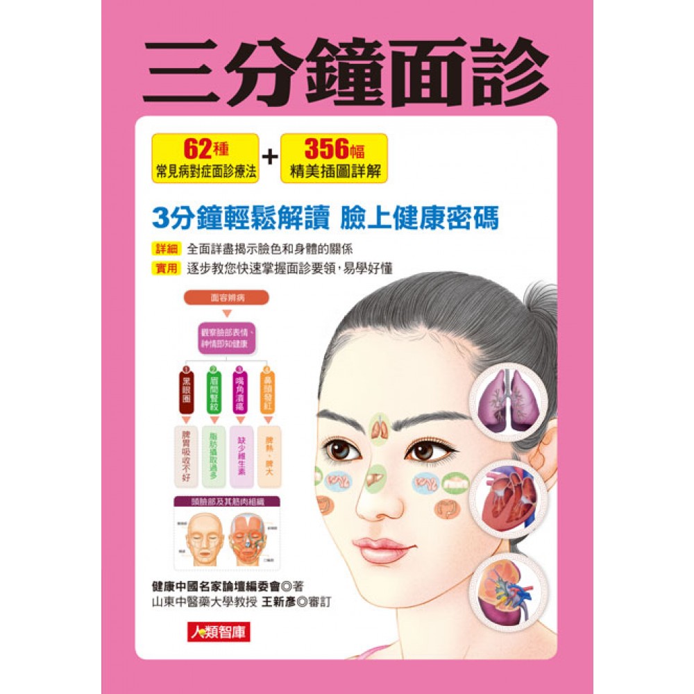 【序 言】花3分鐘察言觀色 解讀健康密碼 如何使用本書 五臟自我檢測 心臟的自我檢測 肝臟的自我檢測 脾臟的自我檢測 肺臟的自我檢測 腎臟的自我檢測 【基礎篇:認識面診】 第一章 面診基礎知識 1 何為「面診」? 2 面診的理論依據 3 臟腑在臉部的分布 4 面診時的距離 5 面診要部位、氣色合參 6 怎樣望色? 7 掌握面診要點 第二章 臉部的形、神、色 8 形、神、色要綜合觀察 9 木形人 肝經氣血旺盛 10 火形人 心經氣血旺盛 11 土形人 脾經氣血旺盛 12 金形人 肺經氣血旺盛 13 水形人 腎經氣血旺盛 14 得神 精神氣足,預後良好 15 少神 神氣不足,體質虛弱 16 失神 精損氣虧,預後不良 17 假神 患者臨終前的預兆 18 什麼是「正常的臉色」? 19 臟腑異常時的臉色 20 頭髮健不健康? 第三章 頭臉部的臟腑反射區 21 臉與臟腑的分屬 22 眼與臟腑的分屬 23 鼻與臟腑的分屬 24 人中與臟腑的分屬 25 唇與臟腑的分屬 26 耳與臟腑的分屬 27 舌與臟腑的分屬 28 牙齒與臟腑的分屬 第四章 病容:疾病發出的訊號 29 臉色赤色 主熱 30 臉色青色 主寒、主痛、主風、主肝病 31 臉色黃色 主熱、主濕、主脾虛 32 臉色白色 主寒、主氣血虛 33 臉色黑色 主虛、主寒、主痛、主瘀血 【實踐篇:應用面診】 第五章 望頭診病 34 少年白頭 腎氣不足/情志不舒使肝鬱氣滯 按摩關元穴:還您一頭烏黑亮麗的秀髮 35 頭皮屑增多 新陳代謝過於旺盛 按摩三陰交穴:和頭皮屑說拜拜 36 頭總是不自覺地搖動 肝火太盛 按摩期門穴:讓不聽使喚的頭停下來 37 身體消瘦 脾胃氣虛/體內有蟲 按摩公孫穴:讓脾胃恢復健康 38 身體肥胖 飲食失調 按摩消濼穴:輕輕鬆鬆瘦身 39 滿頭大汗 體內濕熱/陽氣不足 按摩肩□穴:調理多汗症狀 40 盜汗 心血不足/陰虛內熱 按摩少商穴:解除盜汗的煩惱 第六章 望臉診病 41 臉色發紅 體內有熱 按摩大杼穴:對身體進行冷處理 42 臉色發白 氣血不足/體內寒氣太盛 按摩小海穴:讓臉色紅潤起來 43 臉色發青 體內有寒氣/陽氣虛弱 按摩風門穴:趕走身體裡的寒氣 44 臉色發黑 腎氣不足/體內有瘀血 按摩湧泉穴:迅速改善臉色 45 臉色發黃 體內氣血不足/水濕停滯 按摩血海穴:讓氣血暢通無阻 46 臉部紅腫 體內有熱 按摩中衝穴:不做關公臉 47 臉部浮腫 脾氣不足 按摩目窗穴:使臉部回復自然 48 臉部抽搐 肝氣抑鬱╱脈絡受阻 按摩百會穴:讓臉聽從指揮 第七章 望眼診病 49 眼睛發黃 體內濕熱/瘀血/脾虛血虧 按摩青靈穴:可治療眼睛發黃 50 上眼皮下垂 中氣下陷/身體感受風邪/氣血瘀滯 按摩陽白穴:讓眼皮回復原位 51 眼睛發紅 體內有熱/染上病毒 按摩解溪穴:不再做紅眼兔 52 瞳孔散大 體內火氣上升 按摩神門穴:聚精會神從現在開始 53 眼睛不停眨動 肝虛血少 按摩瞳子□穴:讓漂亮的眼睛定格 54 眼內障 陰精不足 按摩四白穴:擁有明亮雙眸 55 針眼 體內有熱毒/脾氣虛弱 按摩角孫穴:讓毒素無處藏身 56 眼瞼腫脹 體內有熱積聚/濕氣停滯 按摩攢竹穴:不做泡泡眼 57 兩眼無神 體內血氣虧損 按摩養老穴:讓眼睛重新煥發光彩 58 眼睛流淚 體內肝血不足 按摩承泣穴:不做愛哭鬼 59 白睛上長小泡 心火上升/脾胃濕熱 按摩天井穴:消滅白睛上的小泡泡 第八章 望鼻診病 60 流鼻血 體內有火 按摩迎香穴:關住鼻血的閘門 61 流鼻涕 體內濕熱 按摩飛揚穴:從此神采飛揚 62 鼻子上生瘡 體內有熱 按摩通天穴:通暢經絡 第九章 望耳診病 63 耳內長肉 體內有熱毒 按摩顱息穴:耳朵變聰靈 64 耳內流膿 熱火上升 按摩耳門穴:肅降體內濁氣 65 耳朵流血 肝火上升 按摩太衝穴:平息肝火 第十章 望口唇診病 66 口中生瘡 體內有火/中氣不足 按摩陽谷穴:口瘡不再來 67 嘴唇燥裂 脾胃熱氣太盛 按摩下廉穴:通暢經絡氣血 68 嘴唇青紫 脾陽之氣太弱/氣血瘀滯 按摩天衝穴:補足體內不足的陽氣 69 咽喉腫痛 體內熱氣太盛/體內有毒 按摩經渠穴:還你一副金嗓子 70 咽喉潰爛 身體感染病毒/體內有火 按摩魚際穴:幫身體降降火 71 流口水 感受風邪/脾虛/胃中的熱氣上升 按摩地倉穴:趕走饞嘴貓 72 嘴唇顫動 胃火上傳/脾虛血燥 按摩水溝穴:情況緊急就找它 73 痰多 腎虛/脾胃虛寒 按摩豐隆穴:治療痰症它最靈 第十一章 望舌診病 74 舌頭開裂 熱氣太盛 按摩腦戶穴:清熱降濁又升清 75 舌頭萎縮 體內有痰濕/心脾虛弱 按摩太白穴:各種脾虛全拿下 76 舌頭發紅 體內有熱 按摩中府穴:肺腑暢通無阻礙 77 舌上無苔 腎陰不足/氣血虛弱 按摩廉泉穴:水液開闔全靠它 78 舌頭乾燥 陽氣太盛/陽氣太虛 按摩曲池穴:讓舌頭潤澤起來 79 舌頭青色 體內有寒氣凝結/體內有瘀血 按摩商陽穴:體內血氣暢通無阻 80 舌頭紫色 血液中有熱毒/體內有瘀血 按摩陽溪穴:清內瘀順氣血 81 舌頭淡白色 氣血不足/脾虛 按摩太淵穴:讓體內氣血充盈起來 82 舌苔白色 體內有寒氣/脾虛 按摩天樞穴:調理脾胃的好幫手 83 舌苔黃色 體內有濕熱 按摩足竅陰穴:排濕又泄熱 84 舌苔灰黑色 脾功能衰弱/痰飲內阻/濕熱內蘊 按摩足臨泣穴:恢復舌頭紅潤 85 舌苔潰爛 胃功能失調/宿食積滯 按摩足三里穴:口腔清新健康 86 舌苔黃膩 痰熱蘊積在肺/肝膽功能失調/大腸濕熱 按摩勞宮穴:送你一顆清熱解毒丸 87 舌苔白膩 外感寒濕/濕氣內阻 按摩陰陵泉穴:排除體內多餘水液 第十二章 望齒、齦診病 88 牙齒鬆動 陽明經熱/腎氣虛 按摩尺澤穴:最好的補腎方法 89 咬牙 心胃有火/體內有蛔蟲/氣血虛弱 按摩液門穴: