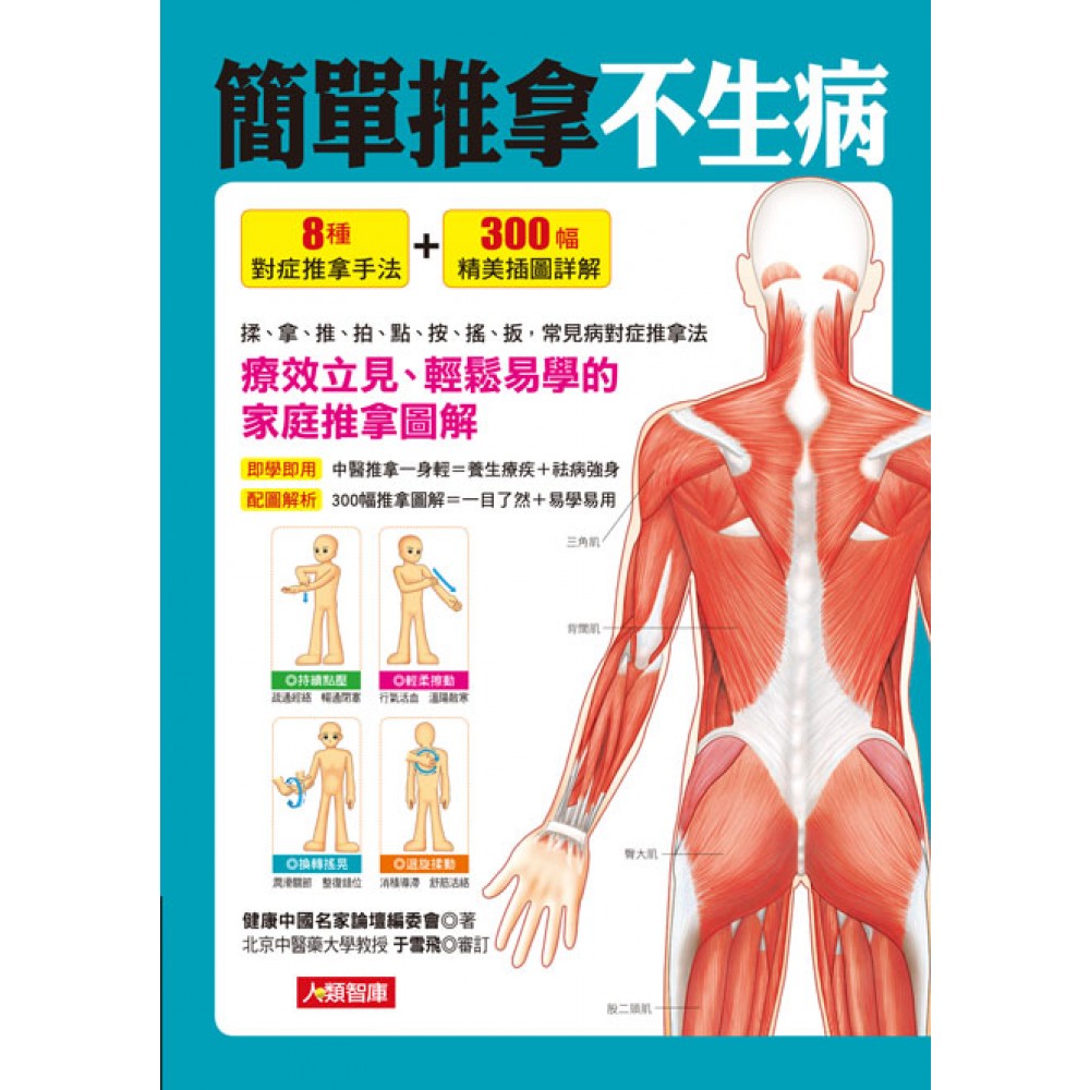 【序言】健康掌握在自己手中 【導讀】如何使用本書 第一章 揭祕推拿 1 簡約而不簡單 推拿的陰陽之道 2 善變更要善辨 推拿的五行之規 3 內外兼修 推拿的臟腑之論 4 四診合參與八綱辨證 中醫的診斷之術 5 循於自然,歸於神奇 推拿的神奇功效 6 差之毫釐,謬以千里 推拿安全實施法則 7 朝花拾遺 推拿的歷史演化 第二章 解析人體經絡與俞穴 8 看不見的點與線 人體經絡穴位 9 手太陰肺經 呼吸系統的控制台 10 手陽明大腸經 兼顧三地的多面手 11 足陽明胃經 脾胃功能的巡查官 12 足太陰脾經 氣血生化的中繼站 13 手少陰心經 心繫健康的安全繩 14 手太陽小腸經 拂去陰霾的清潔工 15 足太陽膀胱經 人體排毒的主幹道 16 足少陰腎經 幸福長壽的不老泉 17 手厥陰心包經 心神交匯的核心地帶 18 手少陽三焦經 氣血運行的王牌統帥 19 足少陽膽經 中精之府的首席管家 20 足厥陰肝經 體內調理的金鑰匙 21 督脈 陽脈之海 22 任脈 陰脈之海 第三章 推拿專家指點你的家庭推拿之路 23 尋穴定位速成指南 快速準確取穴的訣竅 24 恰到好處的學問 推拿力道的完美控制 25 借力而行,因勢施導 推拿輔助用品與體位 26 推拿放鬆類手法 緩和緊張,舒筋活絡 27 推拿拍擊類手法 鬆緩肌筋,理氣活血 28 推拿點穴類手法 刺激穴位,疏通經絡 29 推拿活動關節類手法 調理關節與筋腱,促進氣血循行 30 常規部位推拿手法 海納百川,形意為先 31 小兒推拿手法 準爸爸、準媽媽的必修課 32 正骨推拿手法 專門應對脫位與骨折的推拿 第四章 家庭推拿小療法 33 頭痛、頭暈 尋根溯源,氣定神閒 34 眼部疲勞 舒緩疲勞是關鍵 35 鼻塞 循序疏導,開塞通竅 36 牙痛 星狀放射,緩解疾病 37 落枕 揉捏一通,渾身輕鬆 38 膈肌痙攣 推按理氣,胸中「煩惱」全掃光 39 腹痛、腹脹 舒暢氣血,調理陰陽 40 食慾不振 輕點重壓,胃口即開 41 便祕 疏導通腸,生活規律更健康 42 痔瘡 改善血液循環,告別「難言之隱」 43 心悸 舒緩身心,穩定情緒 44 身心倦怠 提神醒腦,幹勁十足 45 焦慮煩躁 平心靜氣,調整心態 46 憂愁抑鬱 補益臟腑,養心安神 47 神經衰弱 舒經益氣,放鬆神志 48 失眠 舒緩安神,一覺到天亮 第五章 家庭常見病症推拿 49 感冒 隨症施治,解表祛邪 50 咳嗽 前後推揉,順氣寬胸 51 鼻炎 清熱開竅,拋開悶塞困擾 52 胃痛 點穴散痛,推揉理胃 53 慢性腹瀉 健脾和胃,調益臟腑 54 攝護腺炎 輕慢舒緩,溫補脾腎 55 慢性腰肌勞損 舒筋活血的中軸線 56 高血壓 滋陰潛陽,舒暢經絡 57 冠心病 理氣通脈,緩解不適 58 糖尿病 舒筋活絡,改善人體機能 59 肥胖症 多管齊下,持之以恆 第六章 女性常見病症推拿 60 痛經 理氣通絡,活血化瘀 61 月經不調 疏通經絡,調理氣血 62 閉經 辨證施治,遇疾毋躁 63 妊娠嘔吐 點按止吐,便捷輕鬆 64 帶下 辨明根源,及早治療 65 乳腺增生 氣血通暢是最好的良方 66 產後缺乳 健脾和胃,疏肝理氣 67 更年期症候群 健脾補腎,重現女人昔日光采 第七章 小兒常見病症推拿 68 小兒發燒 清熱解表,快速退燒 69 小兒嘔吐 徹查病源,隨症施治很簡單 70 小兒痢疾 找準病因,事半功倍 71 小兒腹瀉 健脾祛濕,飲食起居常反思 72 小兒便祕 辨清虛實,尋跡疏補 73 小兒遺尿 溫腎固澀,減輕疲勞與壓力 74 小兒夜啼 健脾安神,夜晚順暢入夢鄉 75 小兒咳嗽 推揉之間,讓寶寶更舒暢 76 小兒營養不良 調理脾胃,健康指數揉出來 第八章 軟組織損傷及相關病症推拿 77 頸部扭傷 舒筋活血,不再叫苦不迭 78 頸椎病 通絡活血,扳轉輕柔勿用強 79 背部軟組織損傷 舒筋與通絡並重 80 肩關節扭挫傷 輕揉慢轉,祛痛化瘀 81 五十肩 舒筋活絡,勤加鍛鍊 82 網球肘 由淺入深,舒筋去痛 83 肘關節損傷 力道輕柔掌握好 84 掌指指間關節扭挫傷 拔伸有度,揉捏適中 85 胸部肌肉拉傷 活血舒筋,消散瘀痛 86 腹部肌肉拉傷 行氣活血,循序漸進 87 急性胸肋疼痛 揉推扳轉,立見奇效 88 急性腰扭傷 脊椎兩側、傷患部位是重點 89 腓腸肌(小腿肚)損傷 舒筋通絡,推揉得法 90 踝關節扭挫傷 理筋活血,輕柔得當 91 足跟痛 拿揉之間,和傷痛說再見 第九章 正骨推拿 92 下頷關節脫位 下巴掉了不用慌 93 肩關節脫位 旋切牽拉,借力使力 94 肘關節脫位 屈曲牽旋,因勢利導 95 髖關節脫位 拔伸牽旋,絲絲入扣 96 髕骨脫位 爆發寸勁,完璧如初 97 鎖骨骨折 扳頂固定有訣竅 98 肱骨外科頸骨折 牽提端擠,適當鍛鍊 99 胸腰椎壓縮性骨折 謹慎對待,細緻處理 【附錄一】常用骨度分寸表 【附錄二】人體經絡推拿主治一覽表 【附錄三】人體健康十二大穴