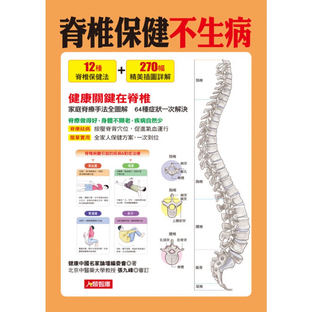 12種脊椎保健法+270幅精美插圖詳解 健康關鍵在脊椎 家庭脊療手法全圖解 64種症狀一次解決 脊療做得好,身體不顯老,疾病自然少 ●脊療祛病 按壓脊背穴位,促進氣血運行 ●簡單實用 全家人保健方案,一次到位 脊椎病變引起的疾病&對症治療 高血壓 由第2、第3頸椎錯位,或第5、第6頸椎病變引起 仰臥,雙腳打開,左手伸直抬高約30公分,並指向右腳尖方向,臉部向左側扭轉至極限。 陽萎 由腰椎、骨盆錯位,或契合度不夠引起 平躺呈「大」字形,左腿屈膝抬起並右轉,然後轉動腰骶部。 胃潰瘍 由第7~9胸椎椎體錯位引起 雙腿併攏,兩手在背後相握,拉伸雙臂使雙肩向後伸展。 多汗 由第5腰椎和第11胸椎病變引起 仰臥,雙手抱膝,屈曲的背部進行前後、左右或旋轉滾動。 快速掌握脊療手法 捏脊+指撥+按脊+整脊 脊椎診斷和疾病防治,早知道早健康 ●捏脊 捏拿脊背肌肉,刺激背部穴位,調整內臟功能 ●指撥 抓住脆弱環節,推拿疼痛部位,緩解身體疼痛 ●按脊 按壓脊背穴位,促進氣血運行,疏通人體經絡 ●整脊 矯正歪斜棘突,整復受損脊椎,治療相關疾病 脊療常用特效對症穴位 啞門穴 位置:在頸部,於後髮際正中直上0.5寸、第1頸椎下。 主治:聲音沙啞、頸項肌肉僵硬、僵直性脊椎炎等。 大椎穴 位置:在背部正中線上,第7頸椎棘突下凹陷中。 主治:感冒、肩背痛、頭痛、咳嗽等。 身柱穴 位置:在背部正中線上,第3胸椎棘突下凹陷中。 主治:氣喘、感冒、肺結核、背脊僵痛等。 命門穴 位置:在腰部,於背部正中線上,第2腰椎棘突下凹陷中。 主治:坐骨神經痛、陽萎、月經不調等。 長強穴 位置:在尾骨端下,於尾骨端和肛門連線的中點處。 主治:腸炎、腹瀉、痔瘡、便血、腰神經痛等。
