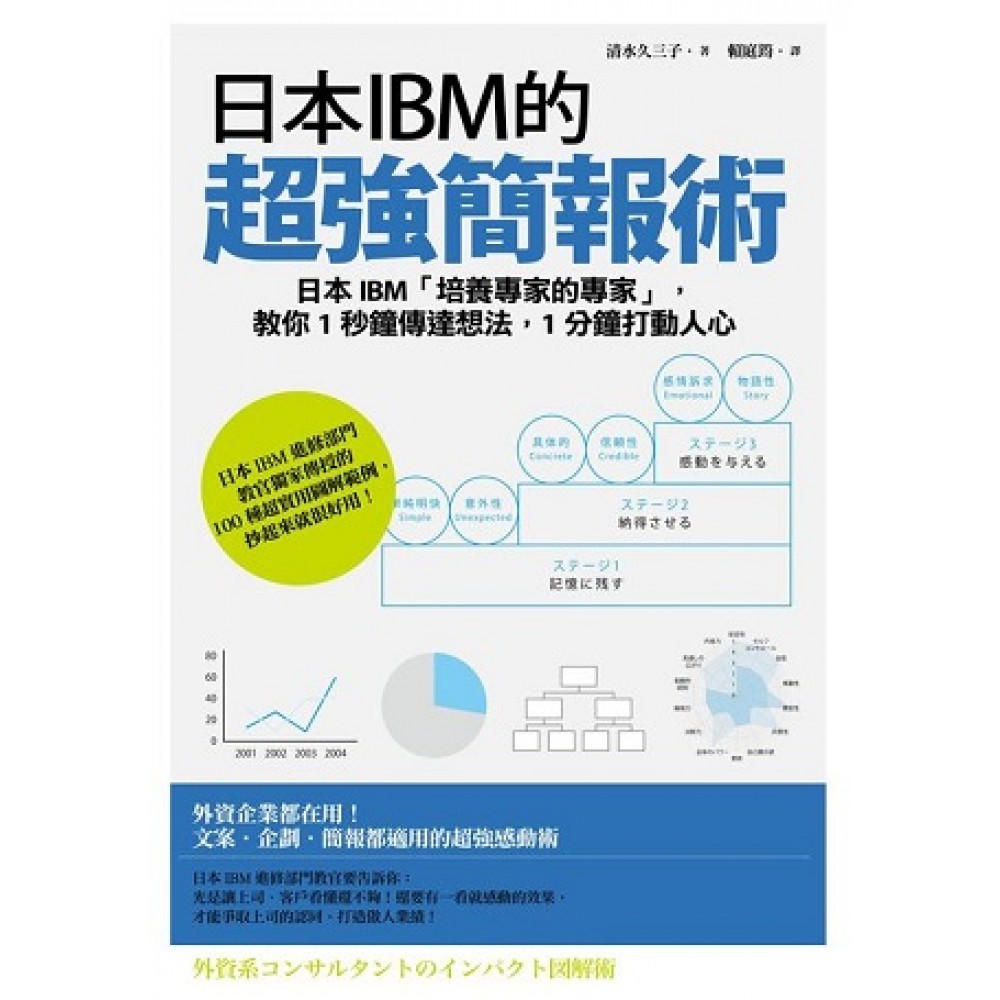 會說故事,客戶、上司都聽你的 說故事的技巧+圖解情報術, 全世界都聽你的! 附日本IBM進修部門教官獨家傳授 100種超實用圖解範例 抄起來就很好用! 文案?企劃?簡報 都適用! 日本IBM「培養專家的專家」, 不但教你把故事說好,還教你獨家圖解術 讓你掌握「故事卡」、「圖解術」、「精煉資訊」的3大技巧, 讓你不但瞬間傳達想法,更能夠成功打動人心! 內容簡介 ◎故事力+圖解力=無往不利的說服力 與其讓顧客「聽簡報」,不如讓顧客「聽故事」! 還用枯燥乏味的條列式說明、令人昏昏欲睡的銷售數字做簡報嗎?日本IBM的資深進修教官要告訴你,要能夠征服客戶、說服上司╱老闆,讓下屬有明確目標,必須要擁有把資料故事化+圖解化的能力! ★1萬份Pizza,到底有多少? 當我們在介紹Pizza店時,光是告訴對方「本店1個月賣出1萬份Pizza」還不夠。如果能夠把文案改成「本店1個月賣出的Pizza足夠掩蓋半個台灣!」,並搭配用Pizza掩蓋台灣面積的圖示,客戶不但更能夠理解「本店生意興隆」,也夠更能共理解「生意興隆」的程度與涵義。 ★同樣是要宣導「在手扶梯上玩耍很危險」…… 單純的口號宣傳往往會淪為聊備一格的標語。為什麼?因為雖然大家都知道「在手扶梯上玩耍很危險」,卻沒有切身的感覺。但若把這樣的標語變成「國小二年級的太郎是個很活潑的男生,但是不太聽媽媽的話。某個星期天,太郎在百貨公司的手扶梯上玩耍……」 故事性的陳述可以同步喚醒顧客的類似體驗記憶,確實把「在手扶梯上玩耍很危險」這個接近切身之痛的概念駭進顧客的大腦!使對方感同身受,而非被動接受。 ◎把故事說好,客戶、老闆、屬下,全部都聽你的 把簡報說成一個好故事,不但能迅速打動客戶,還能夠說服老闆╱上司。連部下╱員工都更能夠掌握自己的角色與目標,為企業帶來更好的利潤,打造企業價值。 ★同樣是賣手機,蘋果為什麼獨占鰲頭? 同樣是賣手機、賣MP3,為什麼頂尖大廠推出的一流規格被賈伯斯打敗? 因為規格有多好、技術有多先進,都只是單純的數字或專業術語,很難引起大多數消費者的共鳴。但當賈伯斯拿起iPod告訴消費者:「有了它,你可以把1000首歌裝進口袋!」則立即打動消費者,提醒消費者「我真正需要什麼」,進而再現蘋果傳奇! ★迪士尼樂園不用後場、前場、工作人員這類名詞來稱呼員工,為什麼? 迪士尼的企業特色是不用後場、前場、工作人員這類名詞來稱呼員工。迪士尼深知其企業價值在於打造大家心目中的夢想,所以迪士尼將員工稱呼為「演員」、把園內場地稱呼為「舞台」、「後台」、「外景拍攝地」,,連員工經過初期研習後收到的通知,上面寫的都是「你未來的角色是……」。 如此一來,員工會習慣不是以工作人員的角度思考,而是以製造夢想的演員角度思考。即使在下班後,也會牢記自己的身分,小心自己的發言。當然,也更能夠正確詮釋企業追求的目標,甚至在311地震時成功安撫遊客,再度打造迪士尼傳奇! ◎日本IBM「培養專家的專家」獨家傳授!一口氣提升故事力+圖解力的秘訣 本書作者清水久三子是日本IBM的進修部門教官,為IBM培養超過2000名行銷、業務方面的專業人才。透過16年經驗的累積,他將從3個層面來幫助讀者有效提供自己的簡報力 ★「故事卡」原理,讓你不靠天分,也能把故事說好 清水久三子認為:透過「故事卡」的構成,每個人都能說出好故事!不用擔心自己沒有天分,或是故事編得無趣,只要能夠學會如何製作屬於自己的「故事卡」,每個人都能說出好故事。 ★不只一看就懂,而且是一看就被打動的圖解術 雖然會用PowerPoint,但做出來的簡報卻總是讓人昏昏欲睡?知道Excel怎麼用,卻不知道怎麼讓圖表更好懂、更具說服力? 本書中,清水久三子從最細部著手,不但告訴你圖表應該怎麼做、連操作細節都不放過!不管是配色、字型,甚至是畫面配置,都有超詳細說明,讓你不但學原理,連技巧都學起來。學一次,就跟你一輩子! ★獨家披露!100種超好用圖表,抄起來用就看得出效果 還是擔心自己想的圖表不夠好懂,缺乏衝擊性?或是必須立即就打造出完美簡報,卻擔心自己做得不夠好?別擔心!本書並附100種清水久三子設計的超好用圖表,讓你抄起來用就立刻打動客戶、說服老闆,一口氣提升故事力+圖解力! 目錄 第一章 了解有力圖解術的機制 01何謂「衝擊性」? 02提升衝擊性的三個階段 03【第一階段】「使對方留下印象」 04【第二階段】「說服對方」 05【第三階段】「感動對方」 06有力圖解術解析 第二章 精煉訊息 01使訊息變得簡單 02使對方感到意外 03具體呈現 04具備可信度 05情緒 06以故事傳達① 07以故事傳達② 第三章 構思故事卡 01何謂「故事卡」? 02訊息金字塔 03構築故事 04創作故事卡時經常遇到的陷阱 第四章 呈現衝擊性 01何謂「有力的圖解」? 02以文字呈現 03以表格呈現 04以圖表呈現 05以圖案呈現 06以圖片呈現 結語 內容連載 前言 為何要「有力」?──從分量到衝擊性 我剛開始擔任外商企業經營顧問時,經常聽到「何謂分量」這句話,也經常看見年輕員工製作的資料被一口否定:「這份資料不夠有衝擊性。」 當時,經常有人問我,向客戶提出的企劃案「價值」何在?完成的資料有多少「價值」? 也就是說,①向客戶提出的企劃案「能夠提升多少企業價值(業績、利潤等)」。②經營顧問提供的資料具備多少「理論與品質兼備」的價