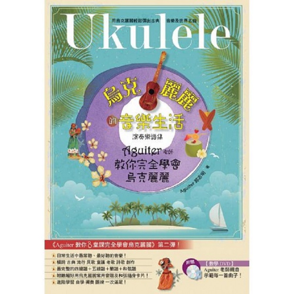 Aguiter老師教你進階 用 烏克麗麗 輕鬆彈出古典音樂及世界名曲 附贈【教學DVD】Aguiter郭老師親自示範每一首曲子! 還有──【彩色】隨身超好用C大調.F大調音階卡片 「全世界最簡單好聽的彈唱樂器」「療傷系樂器第一名」 烏克麗麗風潮,已經在全世界蔓延,掀起全民學音樂的熱潮! 學了幾個月的烏克麗麗,你已經學會無敵六和弦 會簡單的旋律及彈唱歌曲 但~神奇的烏克麗麗其實還有更多可能~ 從早上的破曉Morning Has Broken 到晚安的搖籃曲 現在就來進階學習、自學成功!讓你的程度更上一層樓! 【世面上最詳盡的烏克麗麗演奏譜影音書】 這本《烏克麗麗Ukulele的音樂生活──Aguiter老師教你完全學會烏克麗麗》除了是教學書,是DVD影音書,更是【烏克麗麗演奏樂譜集】。 最簡單!與市面上複雜難懂的樂譜完全不同 彩色的烏克麗麗樂器圖解,一步步帶領你 學會最完整的四線譜+五線譜+簡譜+和弦譜+ 音樂講解與歌曲小故事+編曲概念+最詳盡的影音講解內容示範 Aguiter一樣以體貼讀者的心情出發,保證絕對好懂易彈 使用「世界上最簡單的樂器」烏克麗麗,真的一個人就能做到! 想彈喜歡的曲子但看了譜又太難彈不出來的人, 現在可以放心了! 使用「世界上最簡單的樂器」烏克麗麗 配合書中好聽體貼簡單的譜 不刁難! 真的一個人就能做到! 你(妳)也可以是個樂曲演奏家~ 現在就來進入烏克麗麗的音樂生活 一起來吧! ~ Love & Peace ~ \^.^//