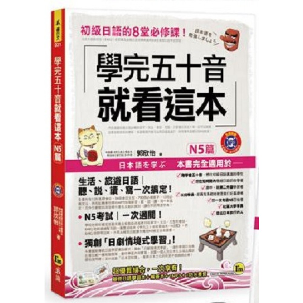 請問你是以下這些人嗎? (1)剛學會五十音,想往初級日語邁進的學生 (2)想在短時間內學好日語的自學者 (3)高中、職以日語為第二外語學習者 (4)以前學過,想再有系統地復習並打好日語文法、句型基礎 (5)想一次考過N5日檢者 (6)社區大學學員 (7)想去日本旅行的人 日語大師郭欣怡(KAKU)老師專為台灣日語初學者編寫的8堂基礎日語學習課程。內容涵蓋初級日語必備的單字、文法、會話、文型。只要你會日語五十音,就可以跟著此書按部就班的學習,保證兩個月後可以用日文去旅行,並擁有基礎日語(N5)的程度。 《學完五十音就看這本-N5篇》不可取代的三大特色: 特色一:生活、旅遊日語,聽、說、讀、寫一次搞定! 全書共有15則基礎會話、54個會話文型、700個必備單字、10則必備文法。再搭配隨書附贈的MP3加強練習,聽、說、讀、寫一本搞定,只要熟讀《學完五十音就看這本-N5篇》,你也可以輕鬆用日語去旅行!另外全書動詞清楚標示重音及動詞類別,讓你不用再查字典! 特色二:N5考試一次過關! 學校老師和補習班教來教去都是教這些基礎日語單字、文法、文型和會話,KAKU老師通通幫你統一彙整成這本《學完五十音就看這本-N5篇》。把KAKU老師帶回家,不用去補習也能讓你擁抱N5檢定合格證書。 特色三:獨創「日劇情境式學習」! 本書擺脫傳統日語學習書的模式,獨創「日劇情境式學習」,讓你學習日語像在看日劇一樣輕鬆簡單。書中學習內容豐富,就算一個人到日本生活或出國旅遊也沒問題。另外收錄「日本豆知識」,喜歡日本文化的你更不能錯過此書! 《學完五十音就看這本-N5篇》的8堂課後保證學會N5必備10則文法規則! 與KAKU老師一起學習基礎日語,學完這8堂課,保重學會N5必備10則重要文法規則! 「ha」做什麼用的?什麼時候唸「ha」,什麼時候唸「wa」? 「desu」做什麼用?一定要加在句子後面嗎?動詞後面也要加嗎? 「no」的用法 輕鬆學日文動詞分類及時態表現 為什麼動詞的旁邊還加了「I」、「II」、「III」的符號呢? 區分動詞是第幾類呢? 為什麼形容詞要分「i形容詞」和「na形容詞」呢?它們有什麼不同呢? 什麼是「i形容詞」?什麼是「na形容詞」? 各式各樣的比較級 動詞te形變化 《學完五十音就看這本-N5篇》超優質四合一組合,一次享有! 基礎日語學習本+解答本+1MP3+1防水書套,題目與解答分開,一邊學習一邊作測驗檢自我檢視,增加考試臨場感。 《學完五十音就看這本-N5篇》之7個使用步驟 STEP1:8堂N5必備日語課 學日文就像看日劇一樣簡單!全書像日劇一樣共分成8話,15則生活主題會話。每一會話均衍生出單字、文型、文法…等等日語學習內容。本書還收錄日本人每天必用的打招呼用語26句、生活實用會話44句與日本學學校上課必備用噢。內容豐富,生活、旅遊日語,聽、說、讀、寫一次搞定!只要熟讀《學完五十音就看這本-N5篇》,你也可以輕鬆用日語去旅行! STEP2:獨創「日劇情境式學習」 擺脫傳統單調乏味的日語學習書,《學完五十音就看這本-N5篇》獨創「日劇情境式學習」,利用簡單日劇情境內容,讓你輕鬆學日語。書中搭配可愛插圖、內容採用活潑全彩編排,如此貼心設計就是幫讀者營造快樂的學習環境。先閱讀有趣的情境會話再學習會話衍生出來的單字、文型與文法。只要跟著本書內容學習步驟,學日語一點都不困難! STEP3:N5考試必備內容! 學校老師和補習班教來教去都是教這些基礎日語單字、文法、文型和會話,KAKU老師通通幫你統一彙整成這本《學完五十音就看這本-N5篇》。全書共有15篇生活會話、700個N5必會單字、54個實用會話文型與10個基礎日語必備文法。書中不但有KAKU老師詳細的日語文法規則解說,還有隨堂練習,讓你彷彿置身於日語課堂中。把KAKU老師帶回家,不用去補習也能讓你擁抱N5檢定合格證書。書中單字均清楚標示其重音位置,讓你清楚知道每個單字的正確發音。一次就把日文單字學習透徹,不必再花時間去查閱字典,把多餘的時間花在練習文型與文法上。 STEP4:跟著KAKU老師一起開口說日語 學習完紮實的內容後,是否要來點輕鬆的學習內容?!KAKU老師貼心的幫讀者在每一章節結束前,依該課主題重點另外編寫有趣的學習內容,讓讀者可以馬上學習,馬上運用。KAKU老師建議你先聆聽隨書附贈的MP3內容,再照著課本大聲地唸出來,讓你可以同時練習日語聽、說! STEP5:不可不知的「日本豆知識」 學習外語不是只有背背單字、練習文法這麼簡單,還要熟知該語言的文化背景才可堪稱是達人!本書依故事情節補充日本文化,讓你更加瞭解日語也增加學習內容的豐富性與變化性。KAKU老師如此用心,讓你學習日語就跟學中文一樣自然輕鬆簡單! STEP6:語言學習不可或缺的MP3 《學完五十音就看這本-N5篇》特別邀請專業日籍錄音員錄製全書會話與單字。學習外語聽、說、讀、寫一定都要涵蓋才算是完整學習,唯有聽母語人士的發音才能學習正確的口說技巧。本書建議讀者可先聆聽MP3再研讀學習內容,學習效果倍增。 STEP7:基礎日語學習本+解答本+1MP3+1防水書套 《學完五十音就看這本-N5篇》針對此書特別做雙書附書套設計,一本日語學習本與解答本,方便教學者可以在上課使用,學生在做練習時也不會因看到答案而失去測驗效果。題目與解答分開絕對符合教學與學習目的,再搭配MP3練習。超優質4合1組合,一次享有。 ● 此書建議可與郭欣怡老師所著之《用日本