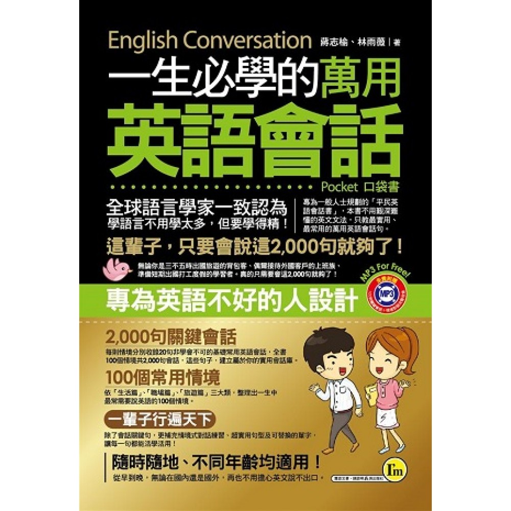 不管英文學多少年, 最感到困難的還是日常生活對話… 學生M:「想委婉拒絕朋友的邀約,開口卻只說『Er…no…I’m..』!」 業務R:「興沖沖要幫客戶訂餐廳,卻忘了預約該用哪個字…」 菜鳥祕書S:「書到用時方恨少,寫份出貨通知都花我半個小時…」 還在自嘆英文不如人嗎? 全球語言學家一致認為: 學語言不用學太多,但要學得精! 專為一般人士規劃的「平民英語會話書」, 只教最實用、最常用的萬用英語會話句! 專為英文不好的人設計100個常用情境 要學只學最精華的,全書內容依「生活篇」、「職場篇」、「旅遊篇」三大類,整理出一生中最常需要說英語的100個情境。 這輩子,只要學會說這2,000句就夠了! 每則情境分別收錄20句非學會不可的基礎常用英語會話,全書100個情境共2,000句會話,無論你是三不五時出國旅遊的背包客、偶爾接待外國客戶的上班族、準備短期出國打工度假的學習者,用本書建立屬於你的實用會話庫。 一本在手,就能一輩子行遍天下 除了會話關鍵句,更補充情境式對話練習、超實用句型及可替換的單字,培養舉一反三的應用能力,讓你學一句就能活學活用! 隨時隨地、不同年齡均適用! 內容適用範圍廣泛,無論生活、職場、旅行,從早到晚,無論在國內還是國外,再也不用擔心開口說英語! 因為樣樣具備,所以你只需要這一本 會看會寫當然不夠,讓你更理解英語會話發音重點,特邀外籍名師錄製聽力∕發音MP3, 放進手機或MP3播放機,隨時帶著走,把握任何學習時間。 輕巧口袋大小,單字庫輕鬆帶著走 書本特別設計成輕巧方便攜帶的大小,讓你隨時隨地,想學就學,麻雀雖小,五臟俱全,每天用一點點時間,學習一生必學的萬用英語會話,打造超完美英文能力! 選一本,能用一輩子的英語會話書吧! 不用艱深的文法,沒有專業的術語,開口說英語就是如此簡單!