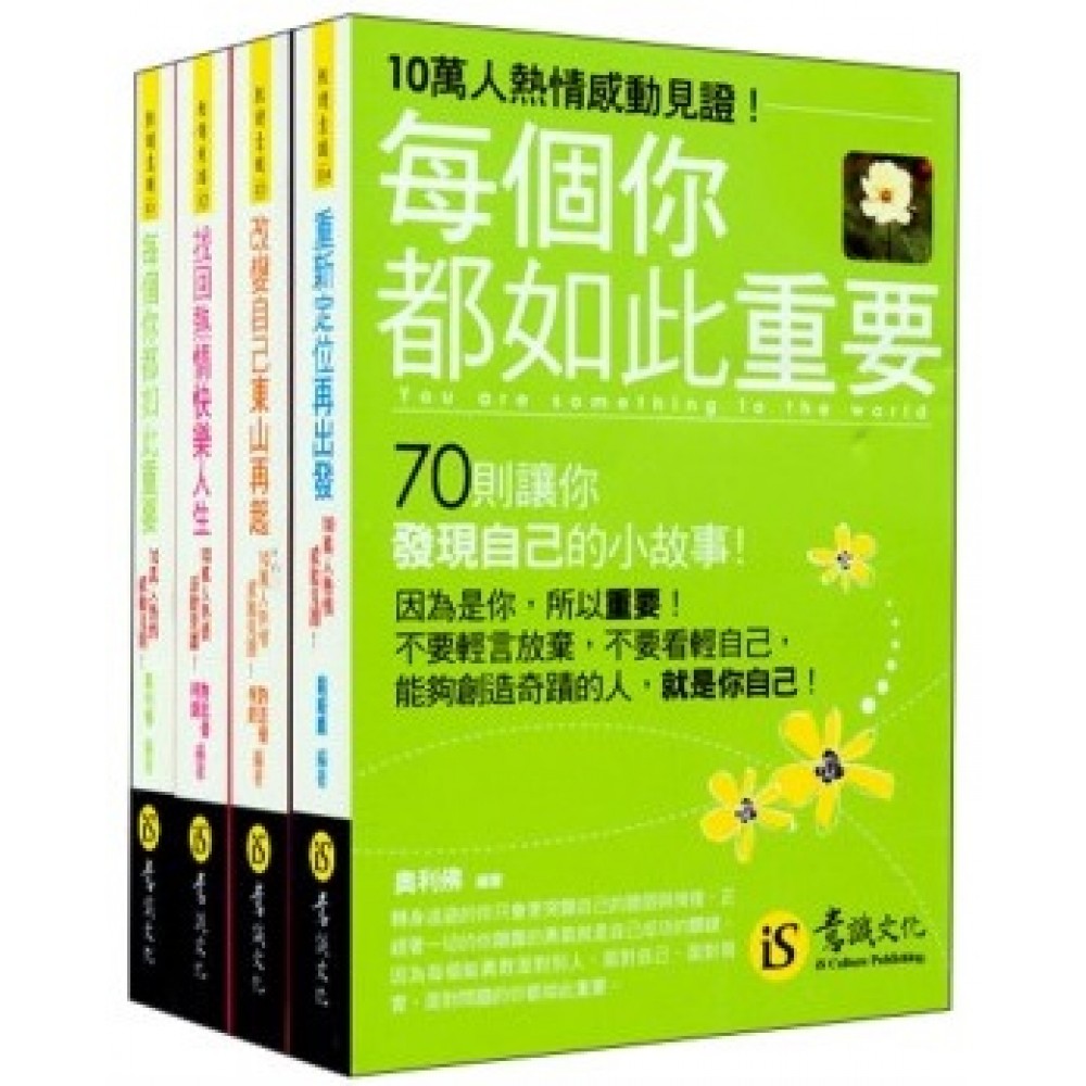 意識文化《每個你都如此重要》、《找回熱情快樂人生》、《改變自己東山再起》、《重新定位再出發》上市2年,不僅各連鎖書店持續暢銷,讀者迴響熱烈,更成為各讀書會指定讀物。因此,為感謝讀者熱情擁護,意識文化於2011年將四本書集結成套,推出《這輩子一定要擁有的一套禮物書》限量紀念版。如果你之前錯過了,這次請一定要把握!限量紀念版,售完絕不再版。 ▉《這輩子一定要擁有的一套禮物書》網友推薦今年最震撼人心的一套禮物書! ◎我是個缺乏信的人,經常認為自己什麼事都無法做好,但《每個你都如此重要》讓我瞭解,只要相信自己並願意去做,任何事我都可以做到。──網友雞米花 ◎《找回熱情快樂人生》使我看到生命的熱情,也讓我感受到用力去活著,認真過每一天的那種快樂,現在的我,盡情享受每一天的生活!──網友尋夢 ◎曾經有朋友因為遇到一些挫折,幾乎對生命絕望,甚至走上絕路,在我朋友陪伴下,他的心情才好轉許多,後來我們送給他《改變自己東山再起》,他看過後告訴我們,他相信自己一定可以再站起來,他絕不能因此認輸!──網友陽光 《每個你都如此重要》、《找回熱情快樂人生》、《改變自己東山再起》、《重新定位再出發》上市2年,期間獲得許多讀迴響,許多讀者表示這四本書改變了他們的生活與想法,使生活變得更積極,想法也更樂觀,甚至也帶動影響到周遭的人,因此網友一致推薦《這輩子一定要擁有的一套禮物書》是今年最震撼人心的一套禮物書! ▉《這輩子一定要擁有的一套禮物書》10萬人的熱情推薦,百萬雙眼睛感動見證! 感謝讀者熱情推薦,《每個你都如此重要》、《找回熱情快樂人生》、《改變自己東山再起》、《重新定位再出發》上市2年銷售已突破「10萬本」,數量仍持續攀升中,一套10萬人熱情推薦的禮物書、百萬雙眼睛感動見證,無論送人或自己收藏都令人愛不釋手,你還在等什麼? ▉《這輩子一定要擁有的一套禮物書》網路轉載第1名! 感謝讀者熱情推薦,《這輩子一定要擁有的一套禮物書》──《每個你都如此重要》、《找回熱情快樂人生》、《改變自己東山再起》、《重新定位再出發》文章內容因受到網友喜愛頻繁轉載,而榮獲網友推薦今年最震撼人心的一套禮物書。 ▉《這輩子一定要擁有的一套禮物書》讀書會訂購率第1名! 感謝婦女團體、愛心協會、學校讀書會、社區讀書會等團體,一致強力推薦《這輩子一定要擁有的一套禮物書》為他們的指定讀物,不僅大量訂購,更推薦其他團員熱情分享,為本套書大打知名度。 ▉買《這輩子一定要擁有的一套禮物書》,免費送你禮物收藏盒,不僅收藏方便,作為禮物更能送到對方心坎裡! 許多讀者向我們反應口袋書不好收藏,想送人又因開本比較小而難以陳列,經常淹沒在書架中,別擔心,我們特地為本禮物套書量身訂作設計了「精美禮物收藏盒」。當您購買本禮物書後,就算將書腰拆掉,也不用擔心書籍難以陳列的問題。不僅自己收藏方便,送禮更能送到對方心坎裡。 ▉2011年最「夯」、最實用的一份禮物──《這輩子一定要擁有的一套禮物書》 《這輩子一定要擁有的一套禮物書》由四位心理勵志類暢銷作者聯手打造,除了可以一次珍藏310則撼動人心的心靈小品外,為回饋讀讀者,意識文化特地推出限量紀念版,買本套書,更「免費」送你「禮物收藏盒」,四本一套原價516元,限量特價299元,售完絕不再版。 你是否還記得,收到什麼禮物時自己感動不已?什麼禮物收到多年後, 依然珍藏、愛不釋手?什麼禮物令自己不僅願意花錢買,還想多買送給朋友? 《這輩子一定要擁有的一套禮物書》就是這樣一份禮物, 不僅豐富我們的人生,更令我們一輩子受用,每個人都該擁有。 你值得擁有最好的──《這輩子一定要擁有的一套禮物書》!